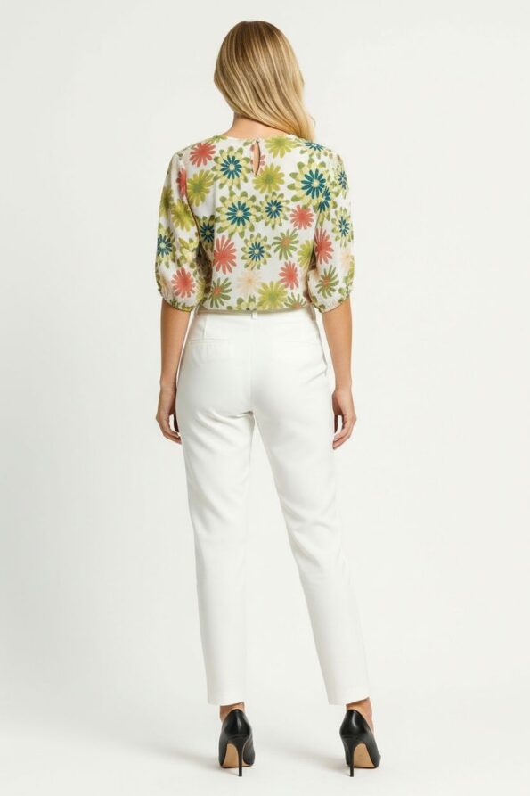 Blusa de manga tres cuartos con caída ligera que aporta frescura y libertad de movimiento, cuello redondo con terminación limpia que brinda un acabado discreto y versátil, abertura posterior con botón que facilita el ajuste y mantiene la prenda en su lugar, corte recto que favorece distintas siluetas y permite un look cómodo y funcional, confección en tela suave que garantiza confort en el uso diario