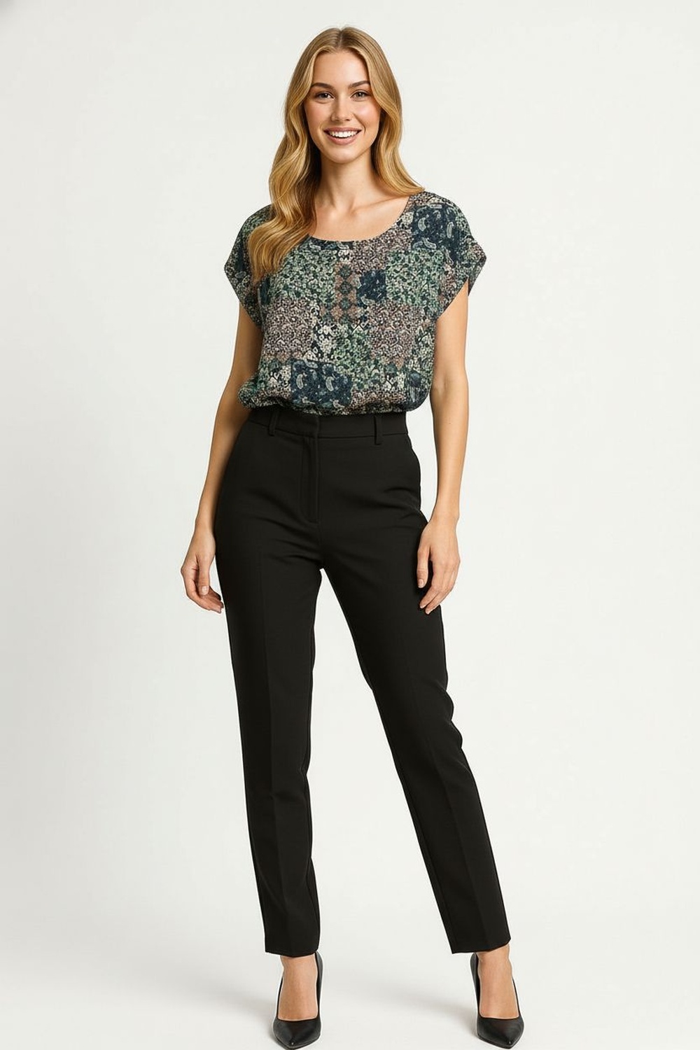 Blusa de manga valenciana corta con diseño fluido que aporta frescura y comodidad, cuello redondo que enmarca el rostro con suavidad, confección en tejido ligero con caída natural que se adapta al movimiento, costuras reforzadas que aseguran resistencia y durabilidad, pretina inferior que define la silueta sin perder confort, acabados pulidos que garantizan una apariencia moderna y versátil