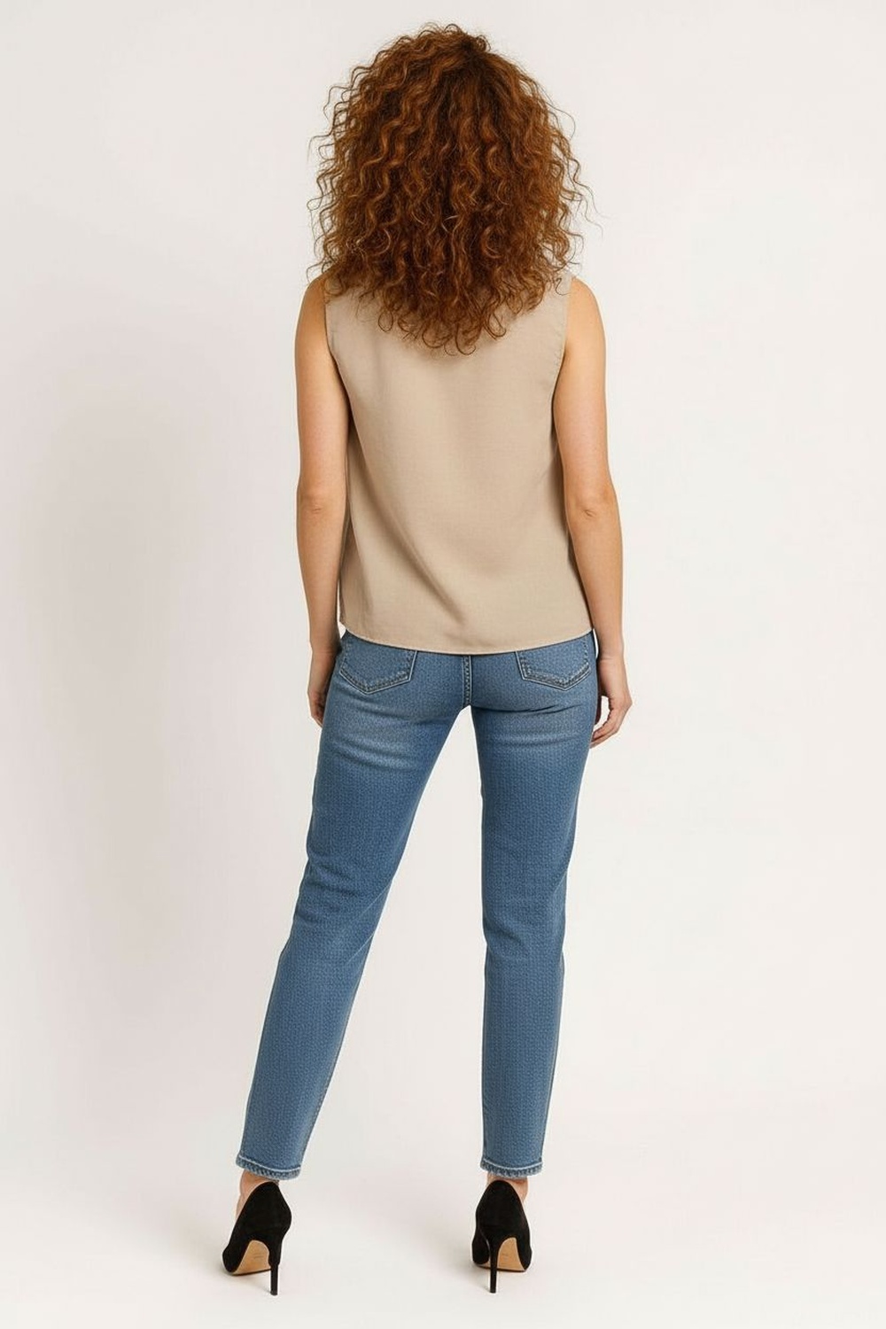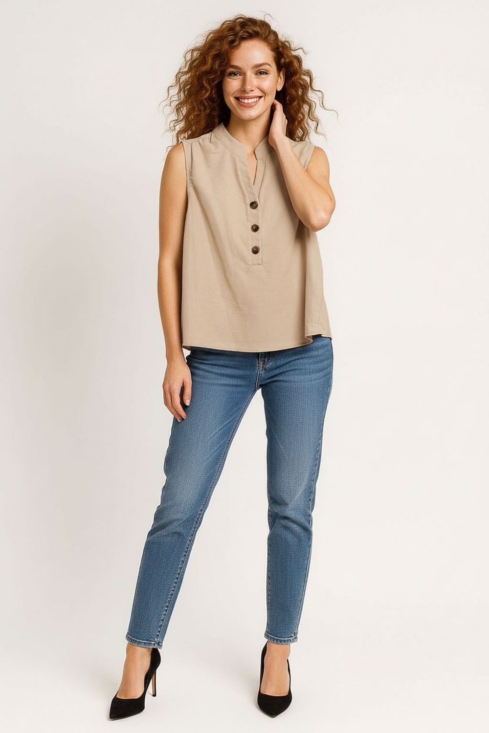 Blusa sin mangas con cuello mao y apertura frontal mediante botones funcionales, corte recto que brinda comodidad y estructura, sisa amplia que permite movilidad natural, largo a la cadera con caída limpia, confección en tejido ligero de acabado suave al tacto