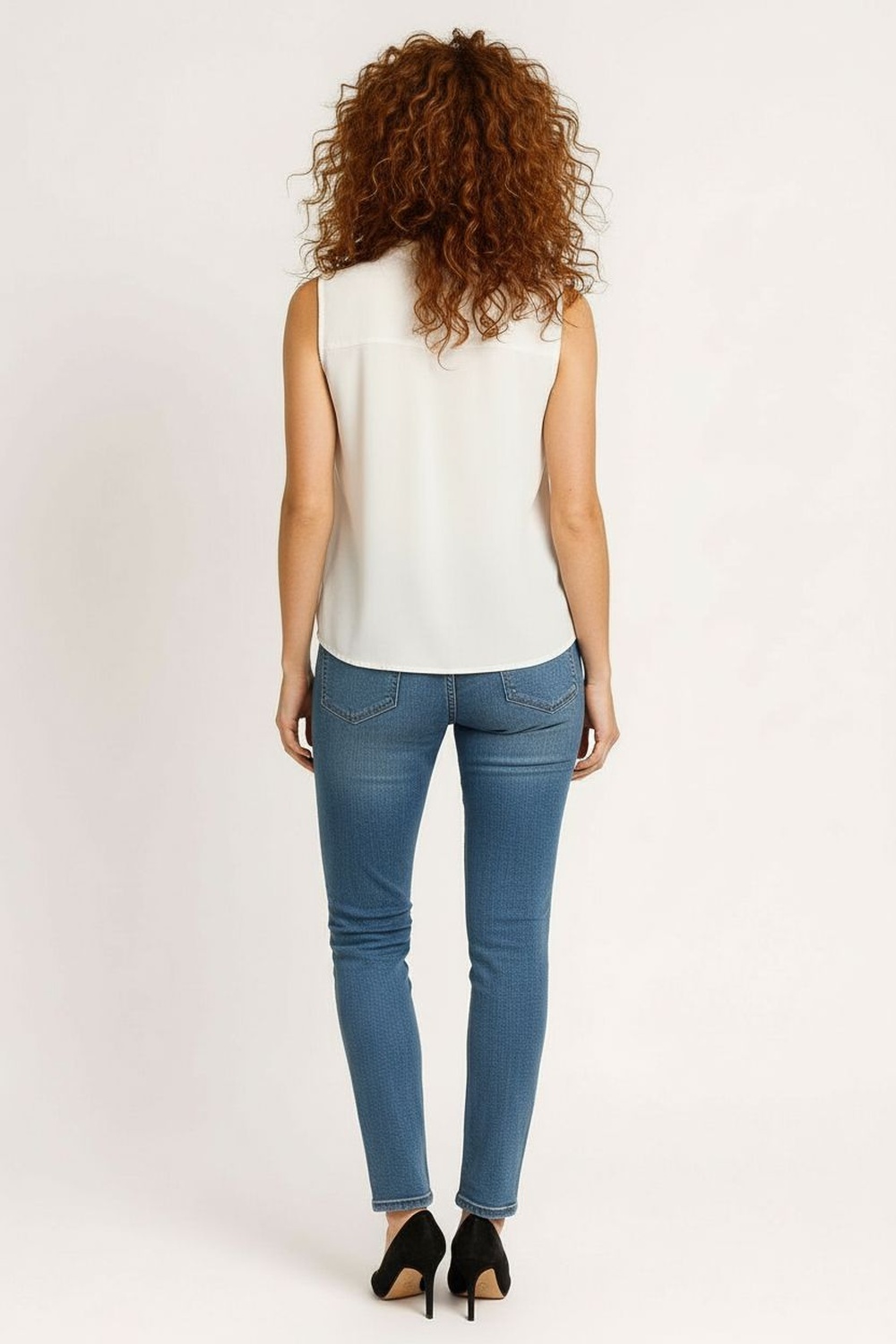 Blusa sin mangas con cuello camisero estructurado y botonadura frontal funcional, corte en línea a que aporta amplitud y caída equilibrada, largo medio que cubre la cadera con movimiento natural, confección ligera con terminaciones limpias que mantienen forma y presentación, diseño práctico con presencia visual definida