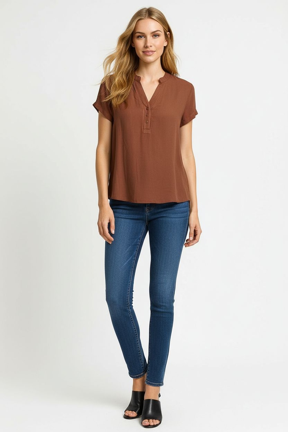 Blusa de manga corta con abertura en cuello en V que aporta un estilo moderno y fresco, media aletilla con botones frontales que brindan practicidad, silueta recta que favorece distintos tipos de cuerpo, confección en tela ligera y suave que asegura comodidad, ideal para outfits casuales de día o combinaciones semi formales con un toque versátil