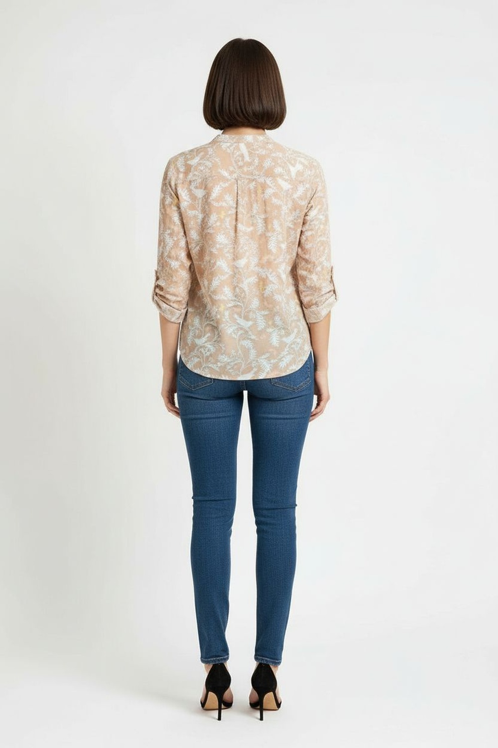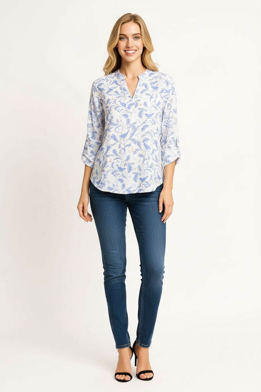 Blusa media manga con cuello abierto escote en v corte recto caída ligera manga con ajuste enrollable diseño cómodo y funcional