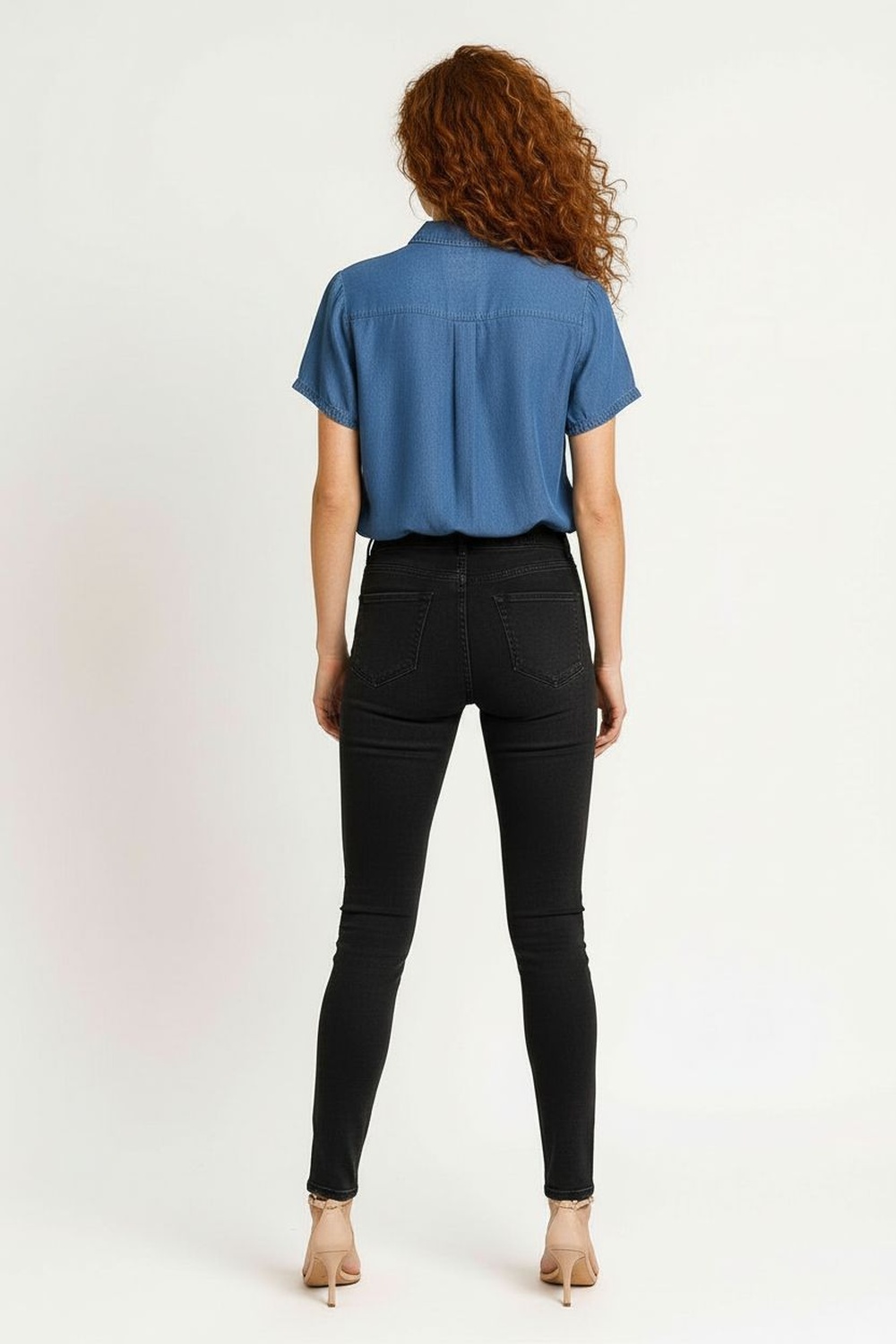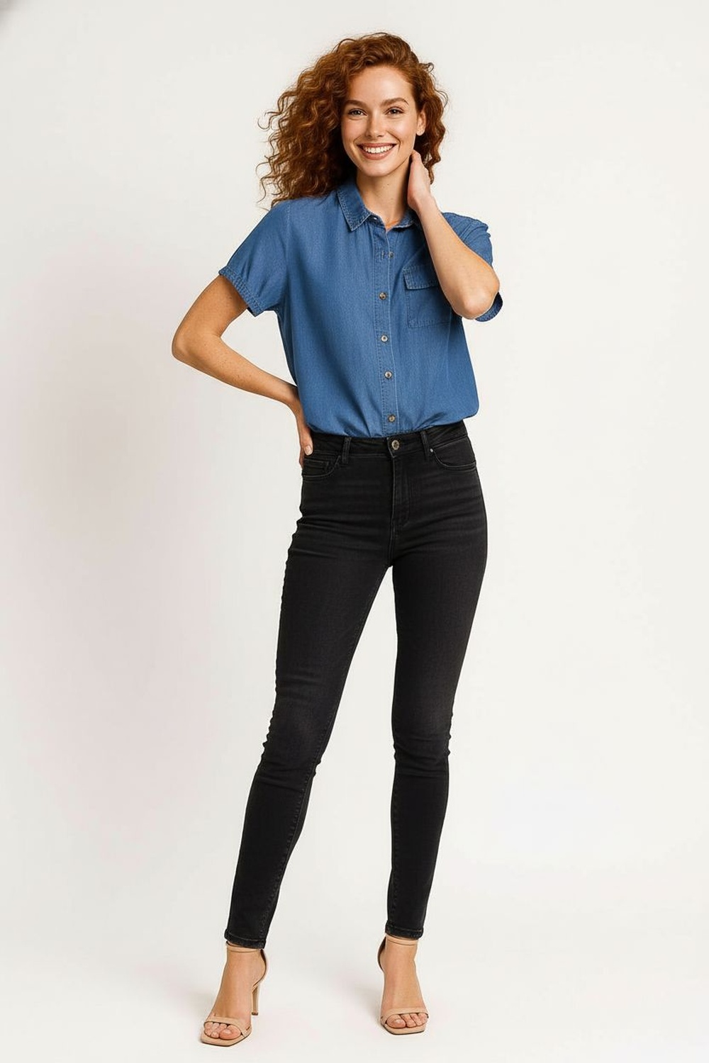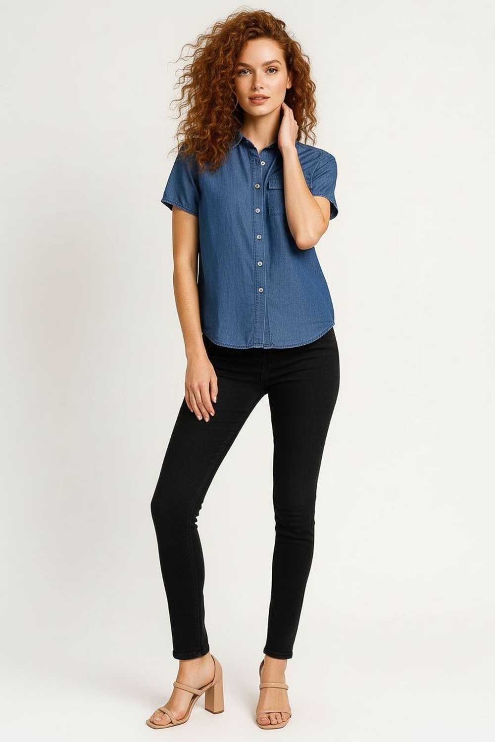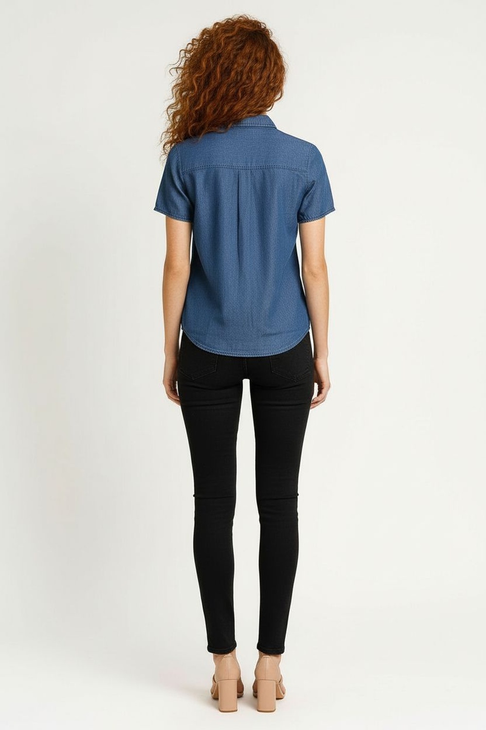 Blusa de mezclilla ligera con cuello camisero clásico y botonadura completa, manga corta con dobladillo discreto y bolsillo de parche al frente, corte recto que brinda comodidad y libertad de movimiento, costuras finas que aportan estructura al diseño