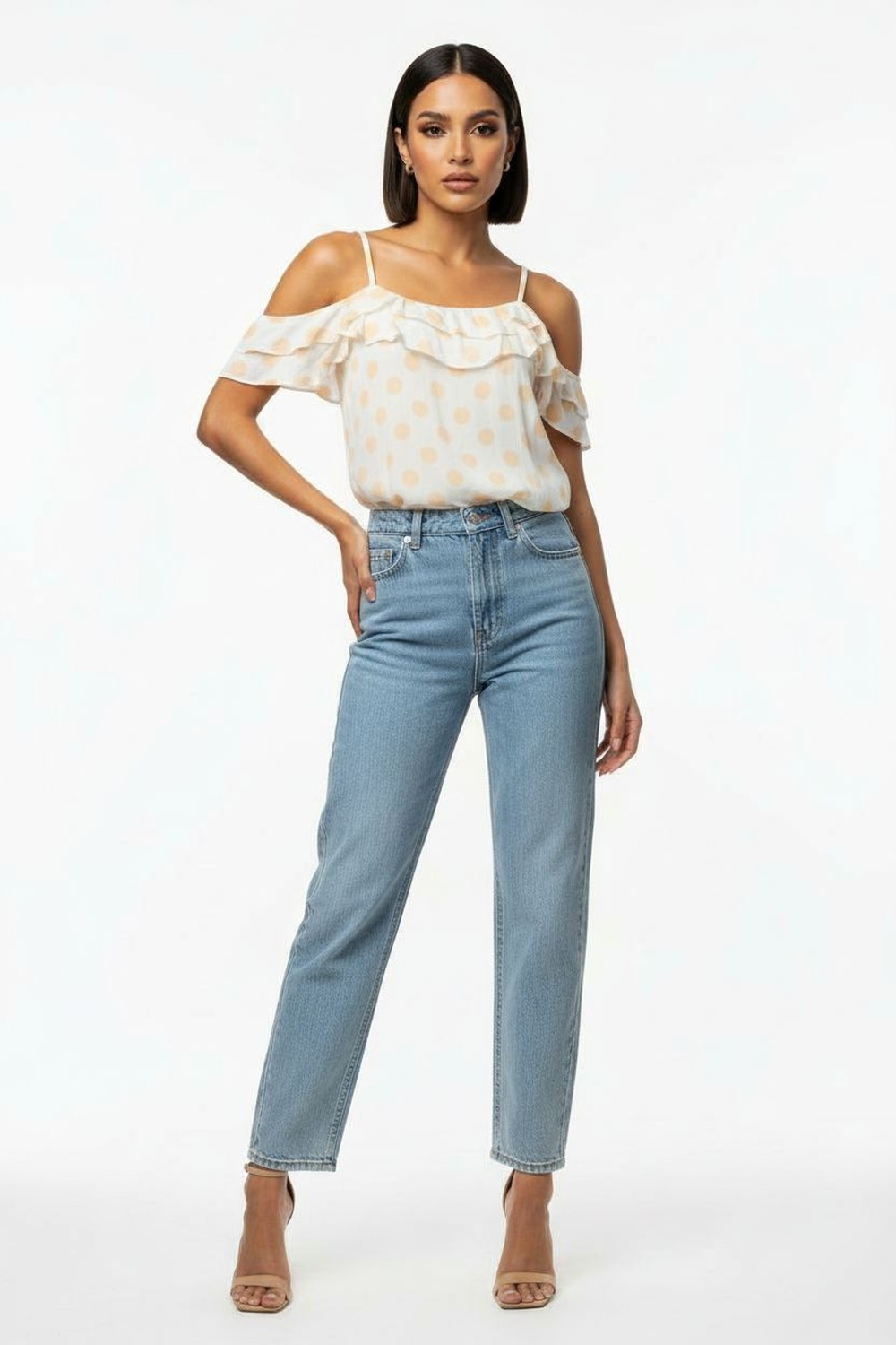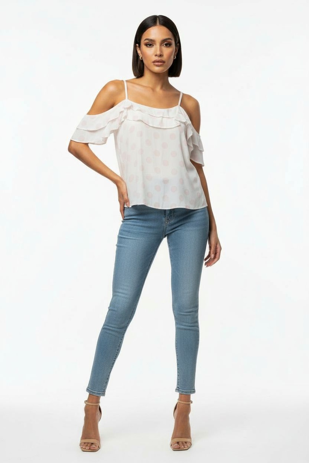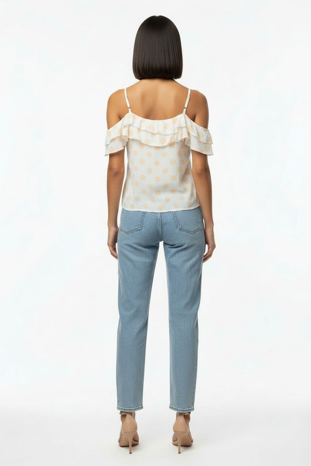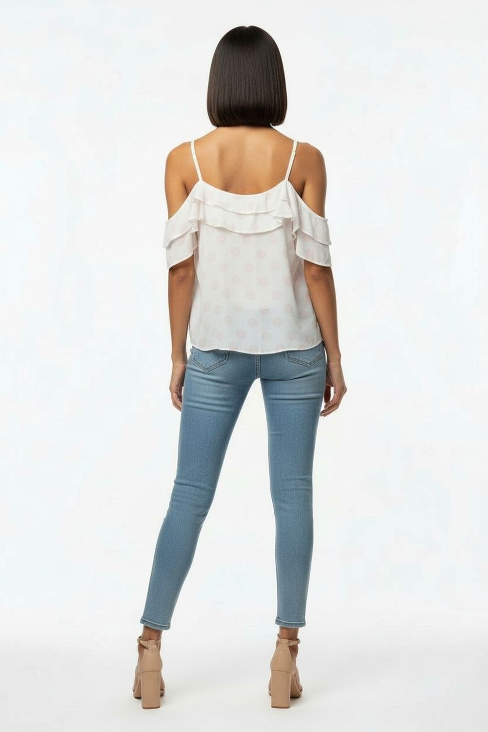 Blusa con tirantes delgados, detalle de olan en escote, caída suelta, estructura ligera, ajuste cómodo, confección fluida