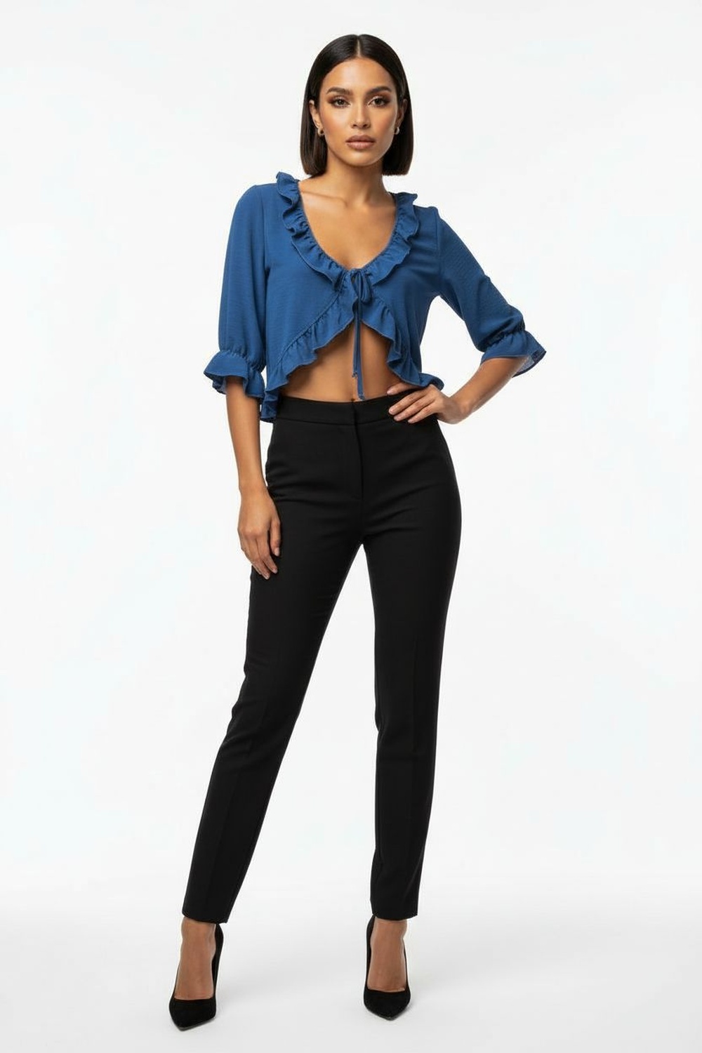 Blusa con escote pronunciado con olanes, manga corta con volumen, ajuste frontal con lazo, corte corto con caída ligera, diseño fresco y cómodo