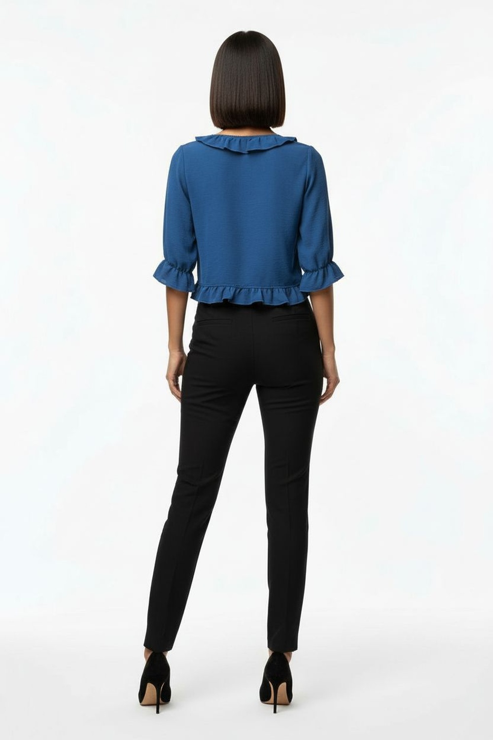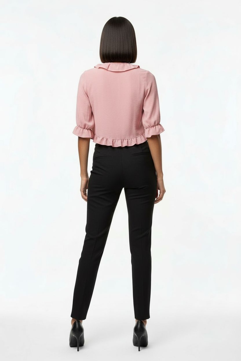 Blusa de manga corta con detalle de olán en hombros cierre posterior corte recto estructura ligera