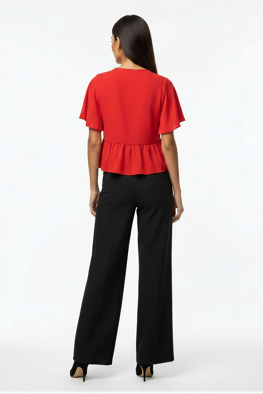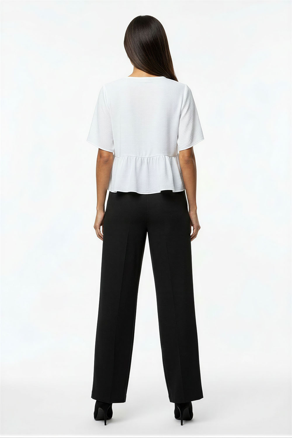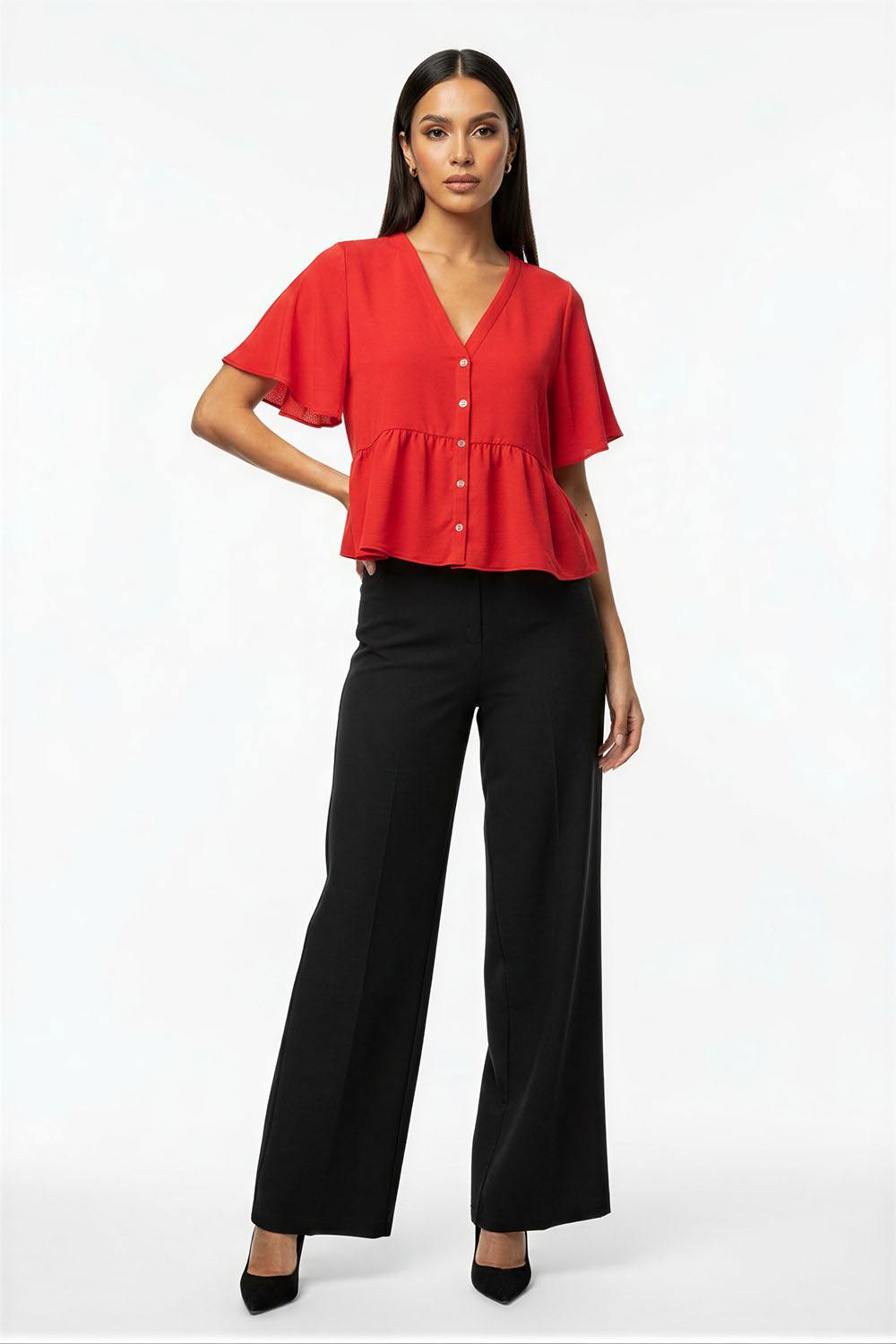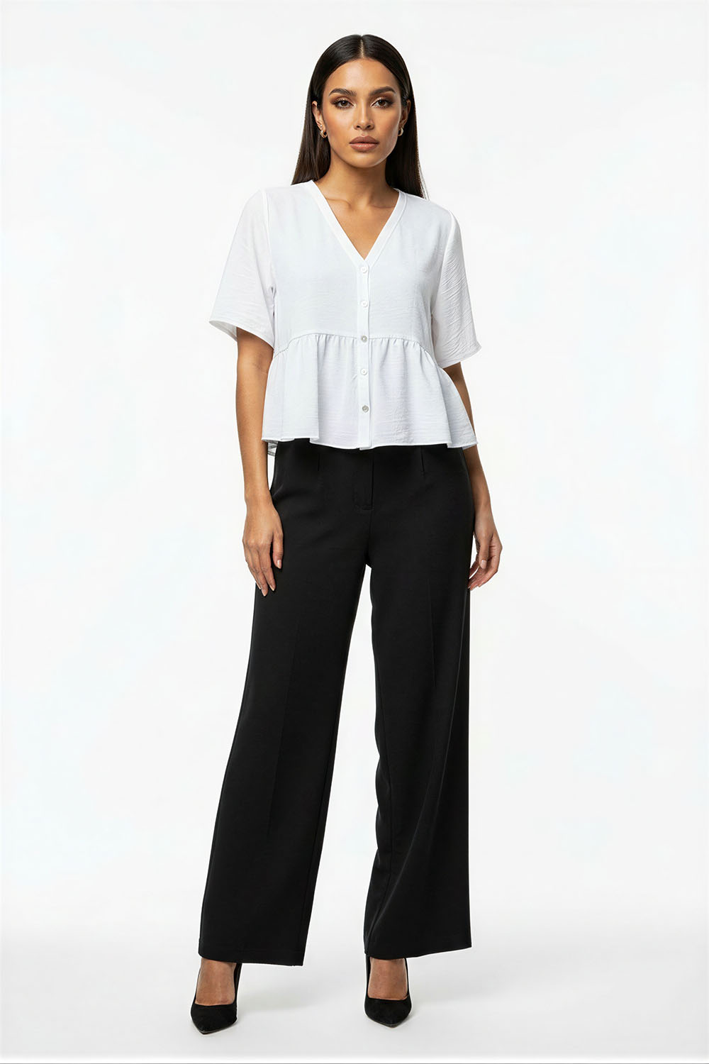 Blusa con corte peplum que genera amplitud en la parte inferior, escote en V con botonadura frontal funcional que facilita el ajuste, manga corta amplia que brinda frescura, confección en tejido ligero de caída suave que aporta movimiento, cintura definida que realza la silueta