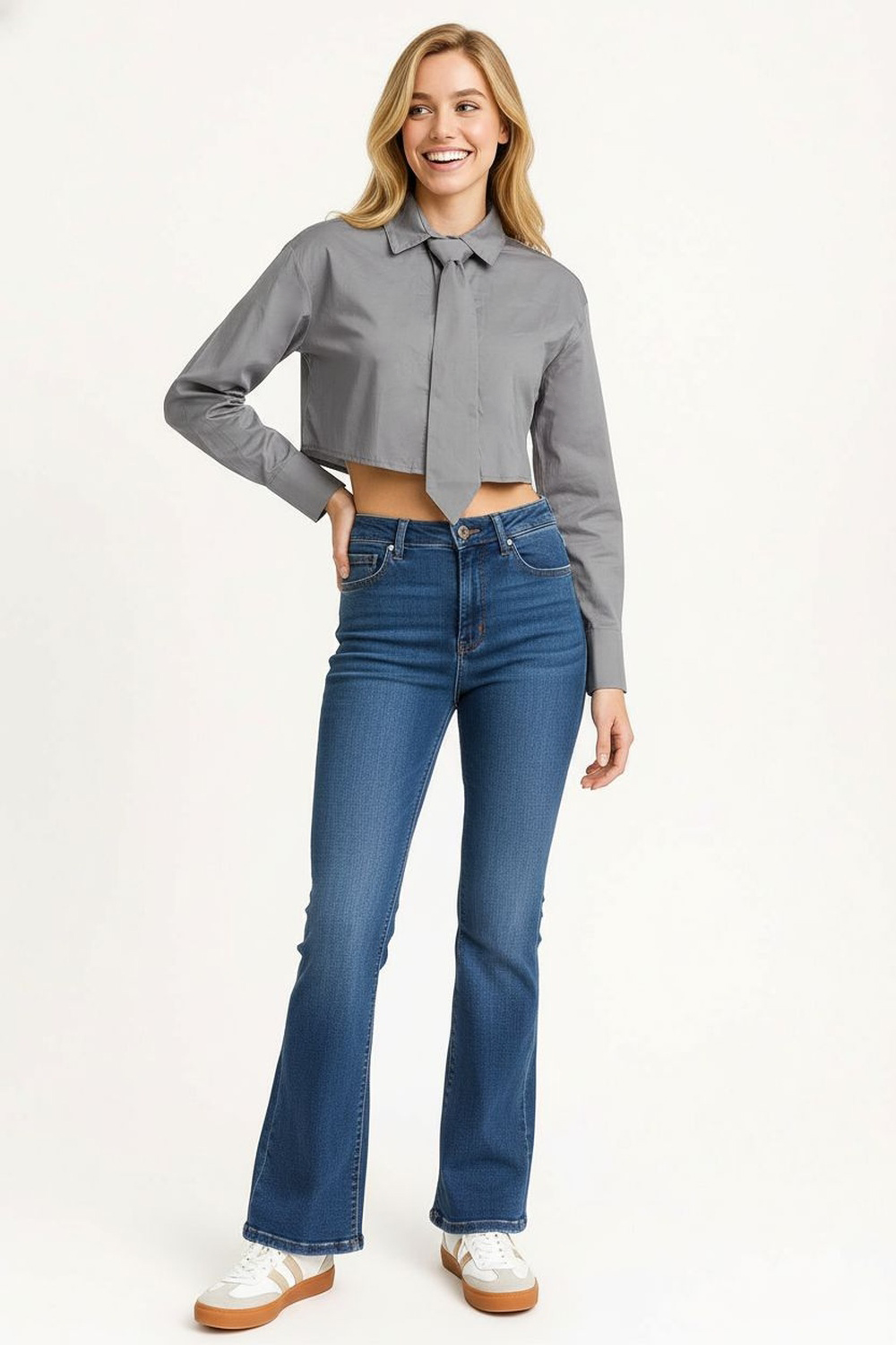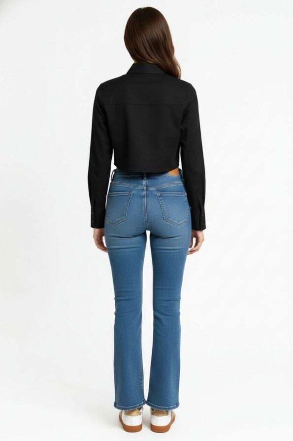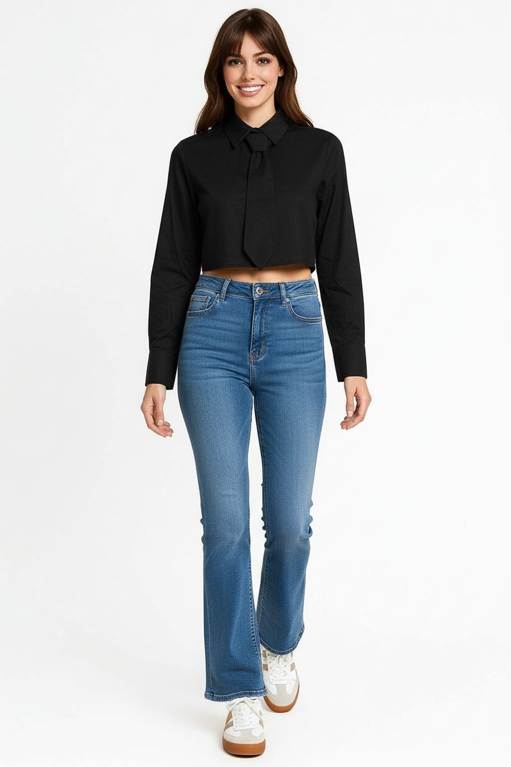 Blusa camisera de corte crop con cuello clásico que aporta estructura limpia y elegante, cierre frontal con botones que brindan practicidad y acabado pulido, manga larga con puño ajustado que ofrece comodidad y detalle refinado, confección en tela ligera de tacto suave que permite frescura y libertad de movimiento, ideal para combinar con faldas o pantalones de tiro alto en looks versátiles y sofisticados de temporada