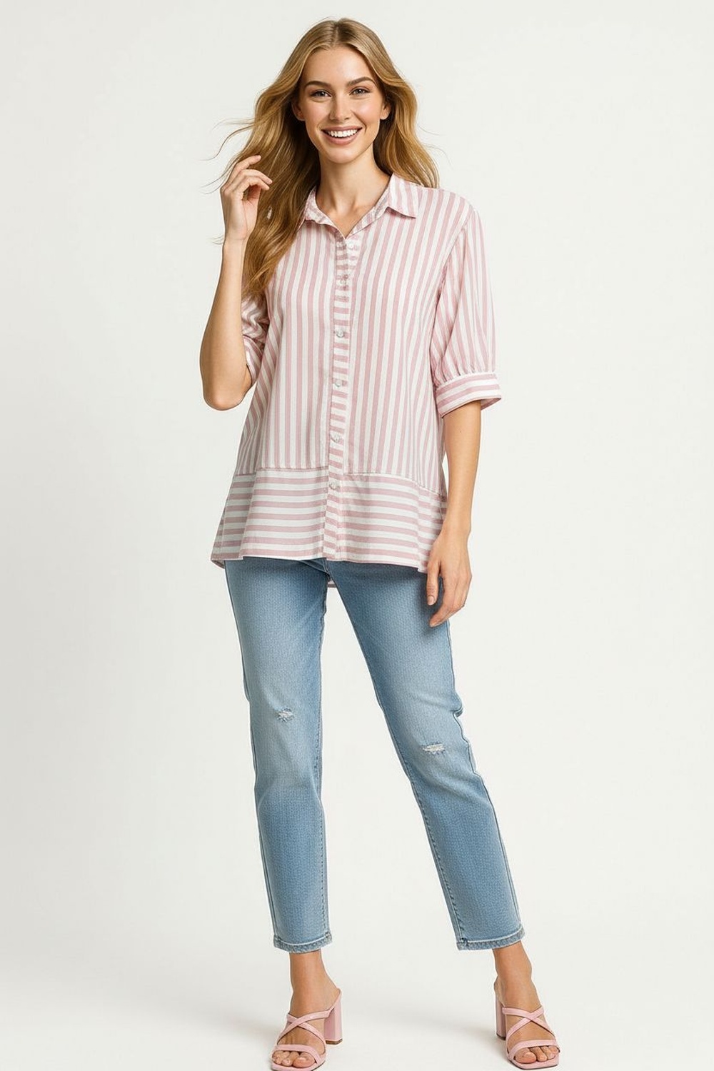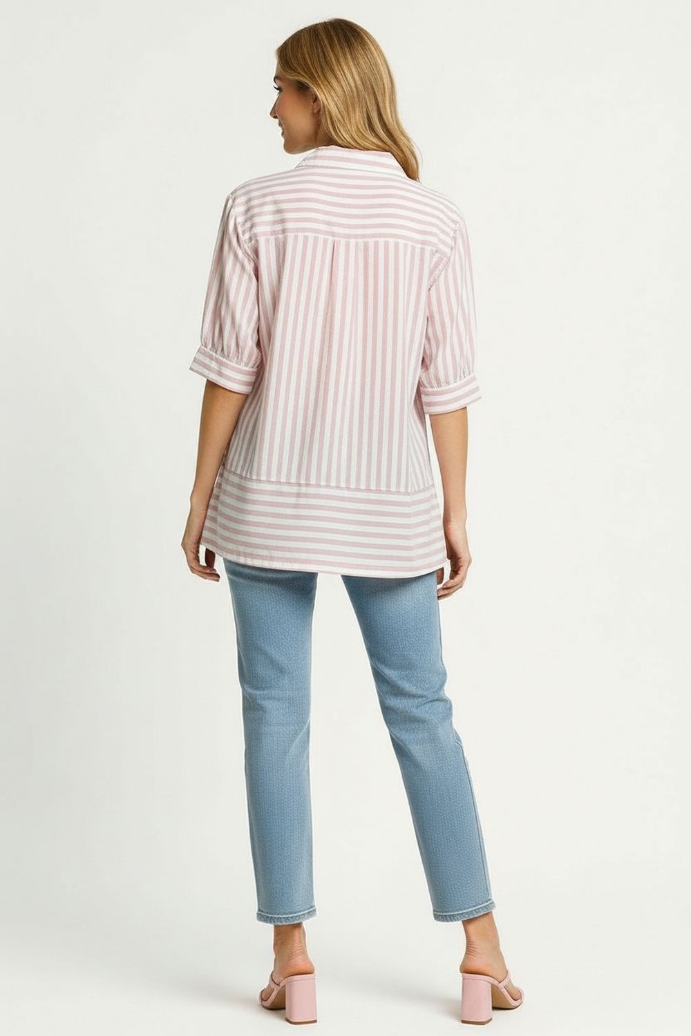 Blusa de manga corta con hombros ligeramente fruncidos que aportan volumen y estilo, cuello camisero clásico que brinda estructura, botonadura frontal completa que realza el diseño, estampado de rayas en contraste con disposición vertical y horizontal que estiliza la figura y añade un toque moderno, confeccionada en tela ligera que ofrece frescura y comodidad, ideal para outfits casuales o de oficina
