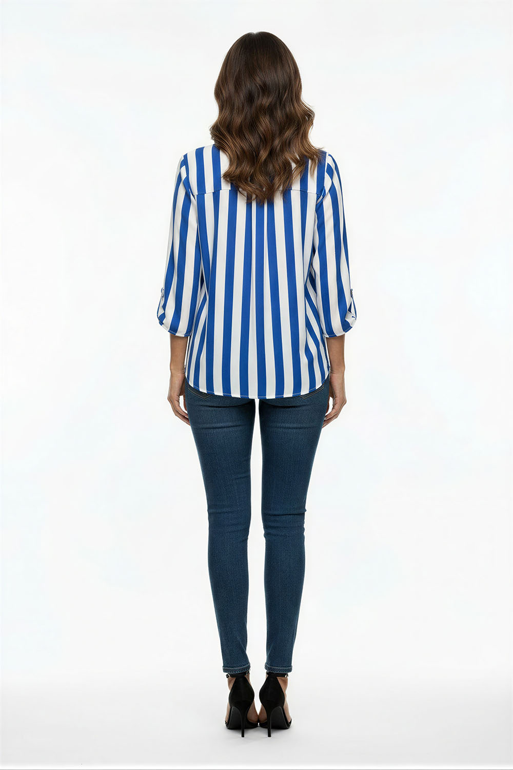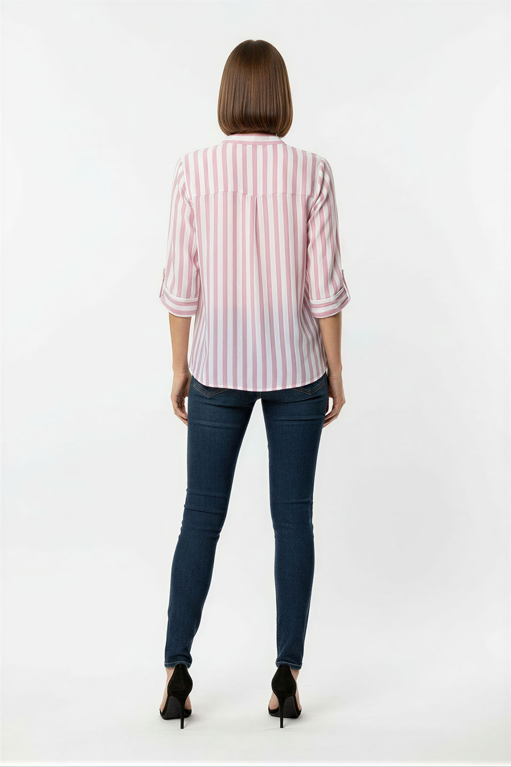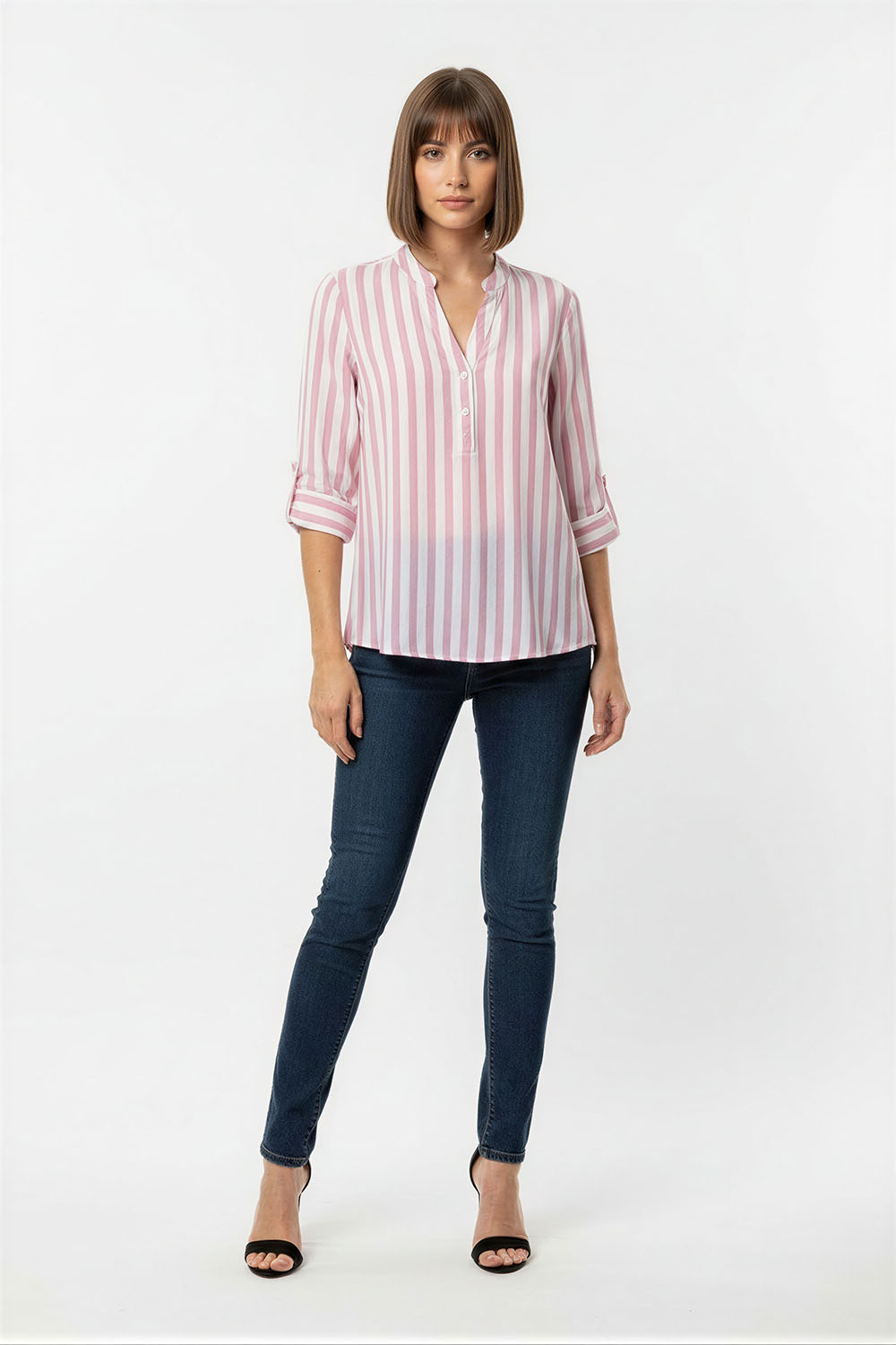 Blusa de manga media con corte recto y largo extendido, escote con abertura frontal y botonadura parcial que facilita el uso, mangas con doblez que aportan estructura, confección ligera que permite fluidez y comodidad en cada movimiento