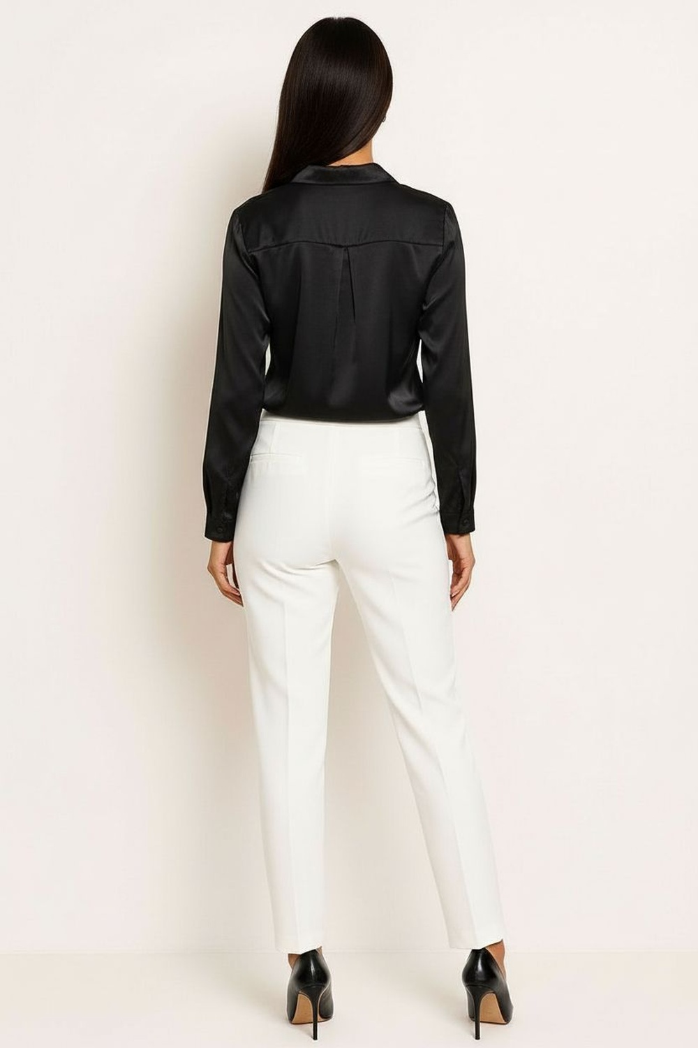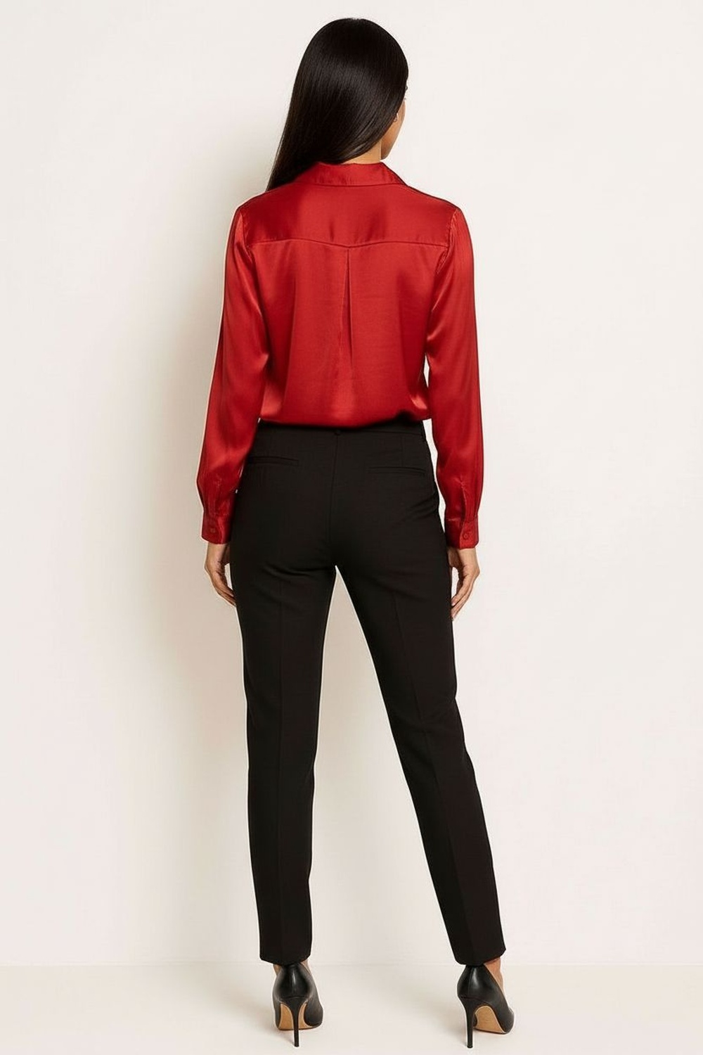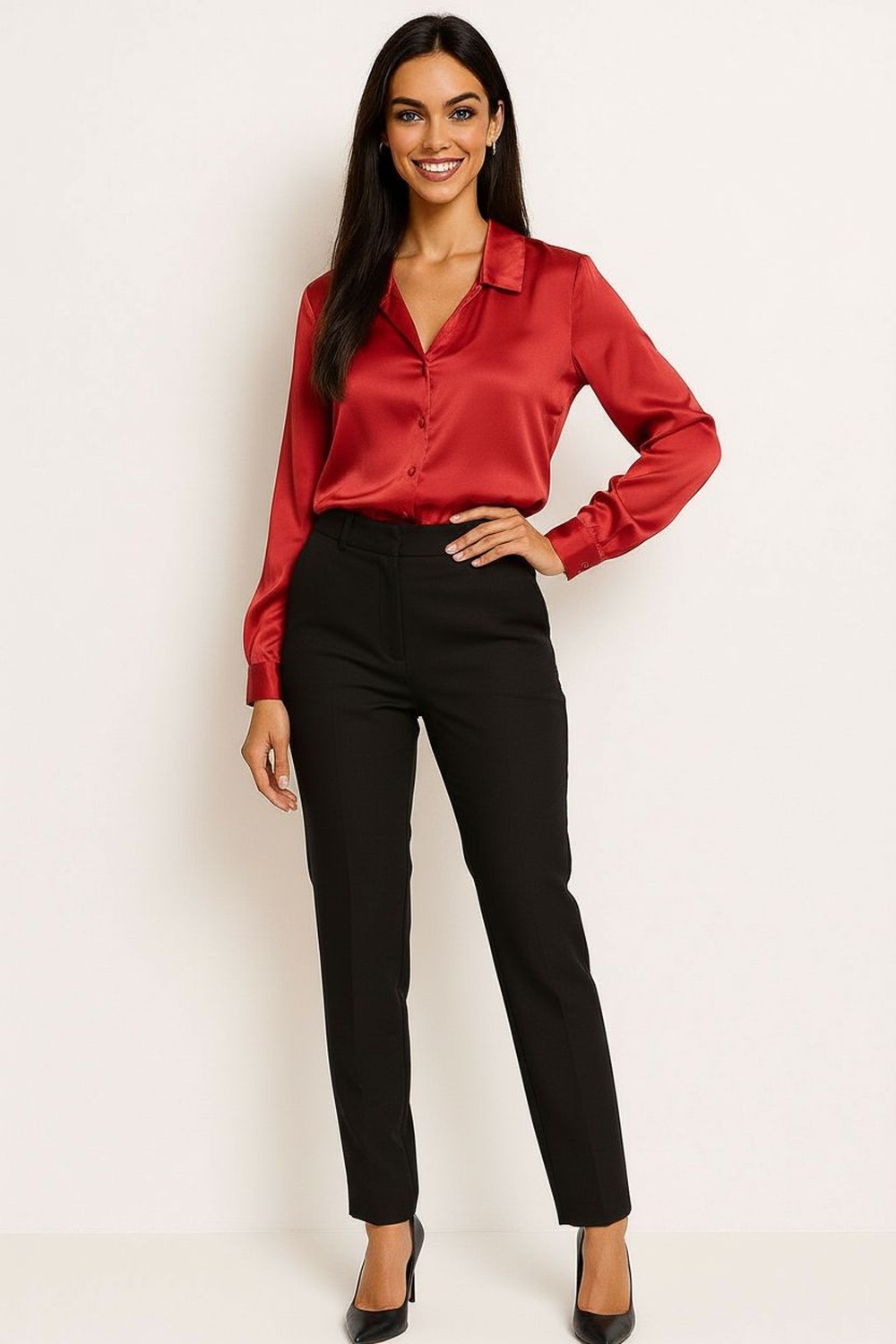 Blusa de corte recto con cuello camisero y botones frontales forrados, manga larga con puño estructurado que aporta formalidad, confección en tela satinada de tacto suave con caída ligera, largo ligeramente corto que equilibra proporciones y diseño limpio que brinda presencia elegante y sofisticada