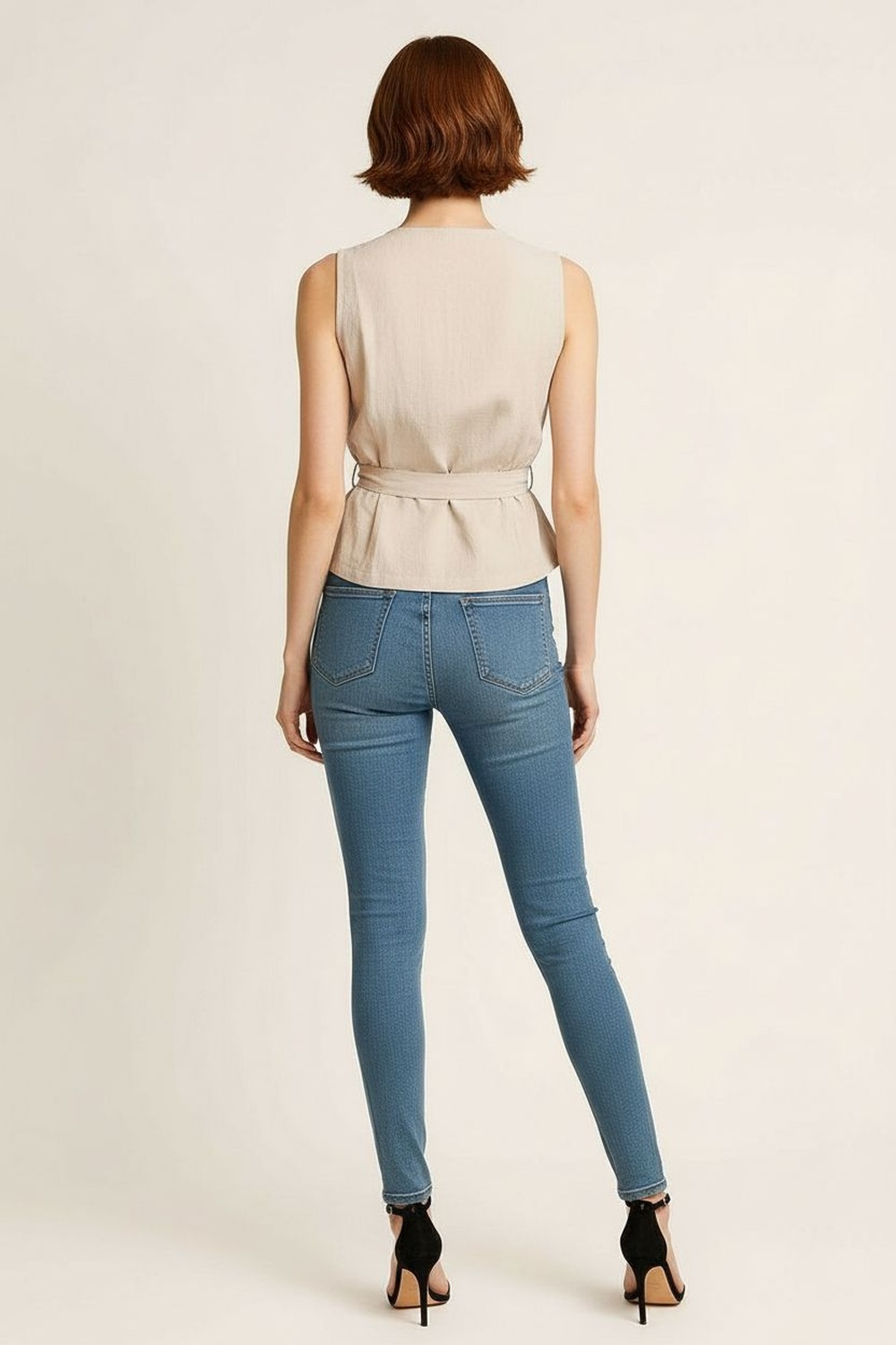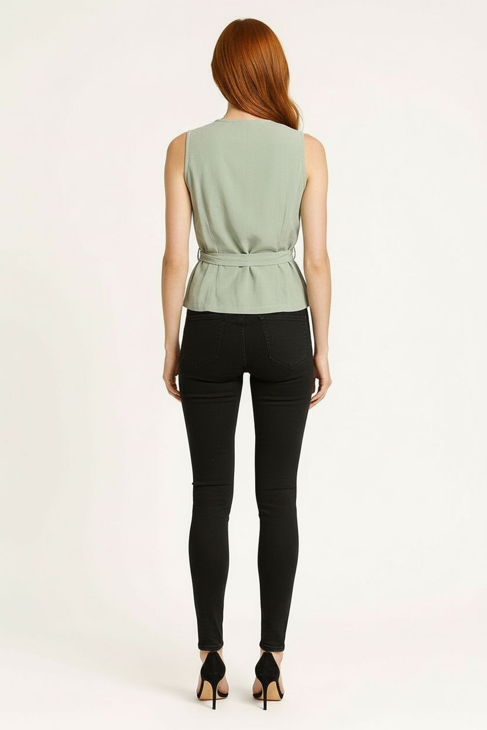 Blusa sin manga con escote en V, cierre frontal con botones, cinta para ajuste en cintura, corte recto, terminados limpios, estructura ligera