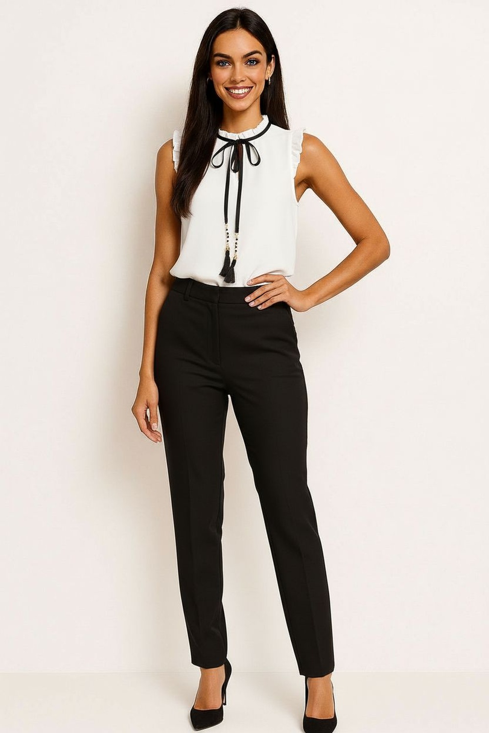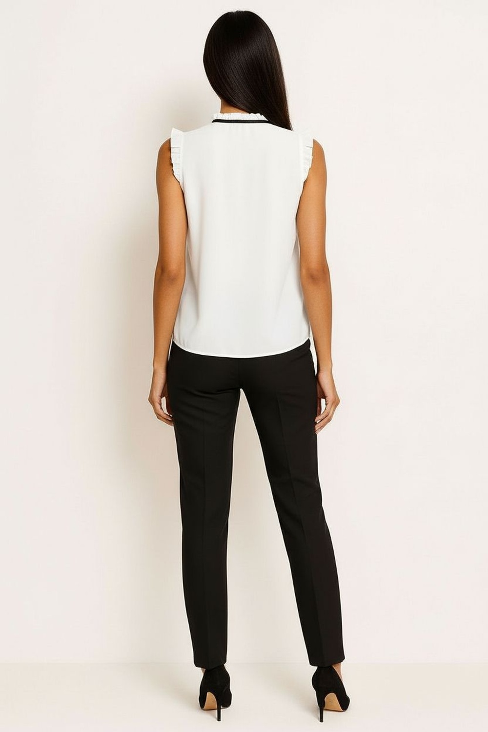 Blusa sin manga con escote redondo detalle de cinta al frente acabado con caída ligera corte recto estructura fluida