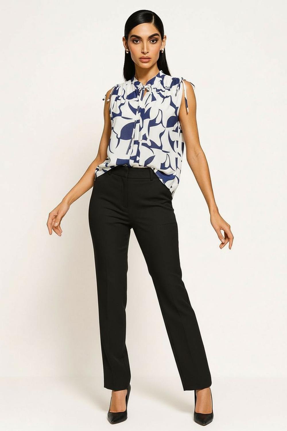 Blusa sin manga con cuello alto y lazo ajustable al frente que aporta detalle elegante, corte recto con caída fluida que estiliza la figura, pinzas sutiles que mejoran el ajuste en busto, abertura frontal discreta y acabado limpio en dobladillo, confección en tejido ligero de textura suave al tacto