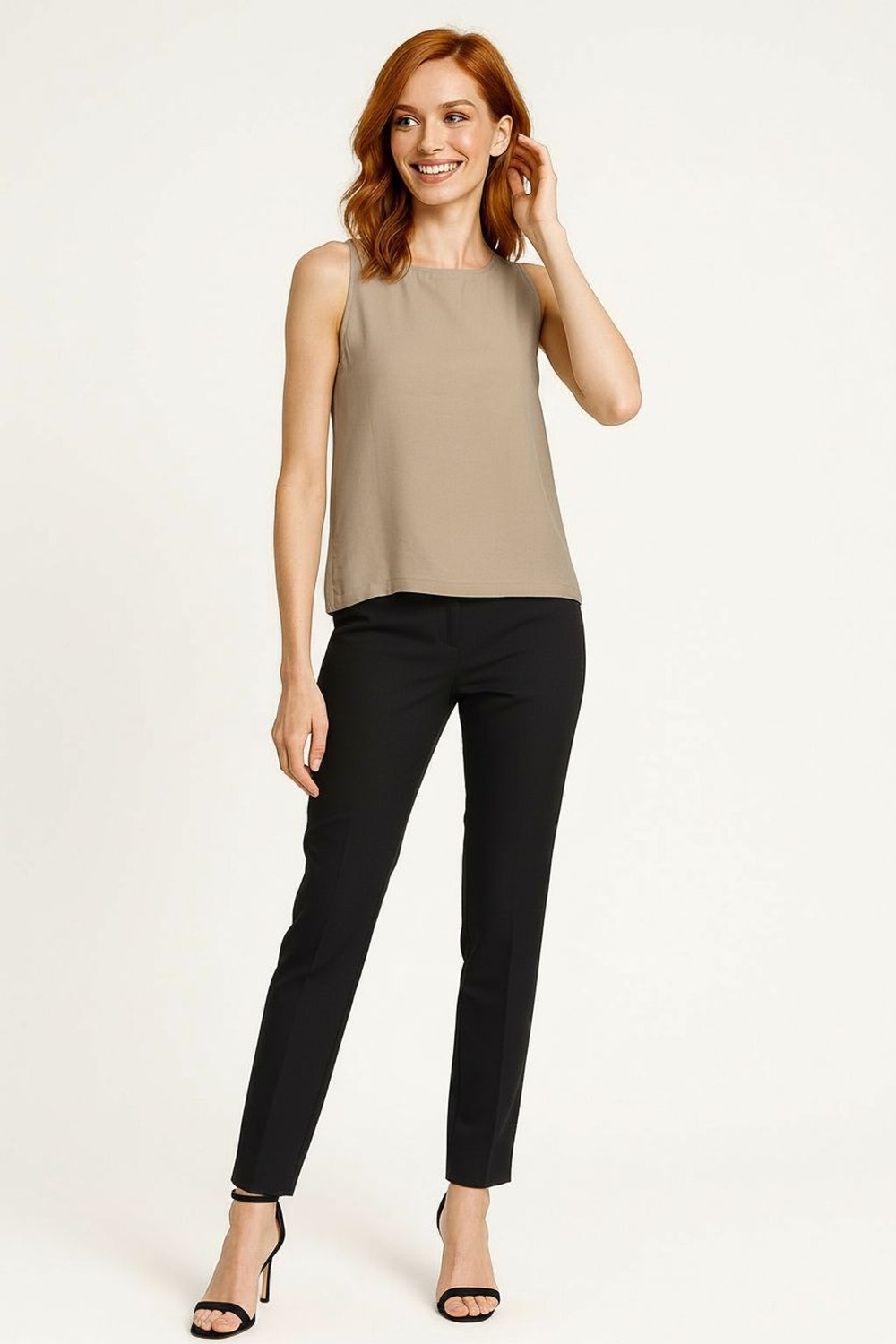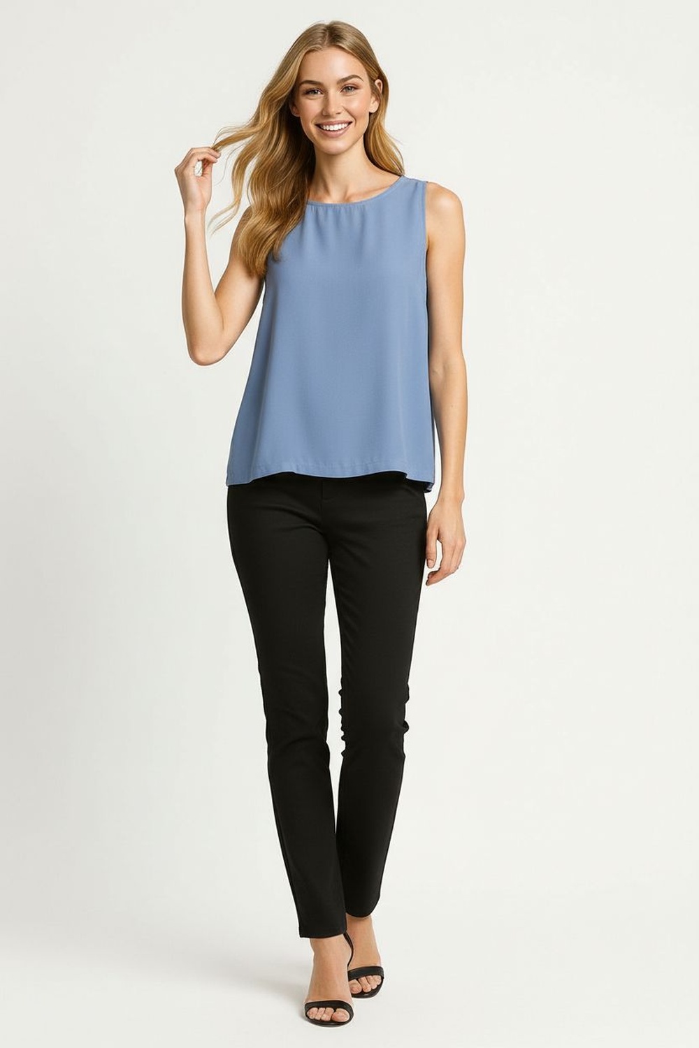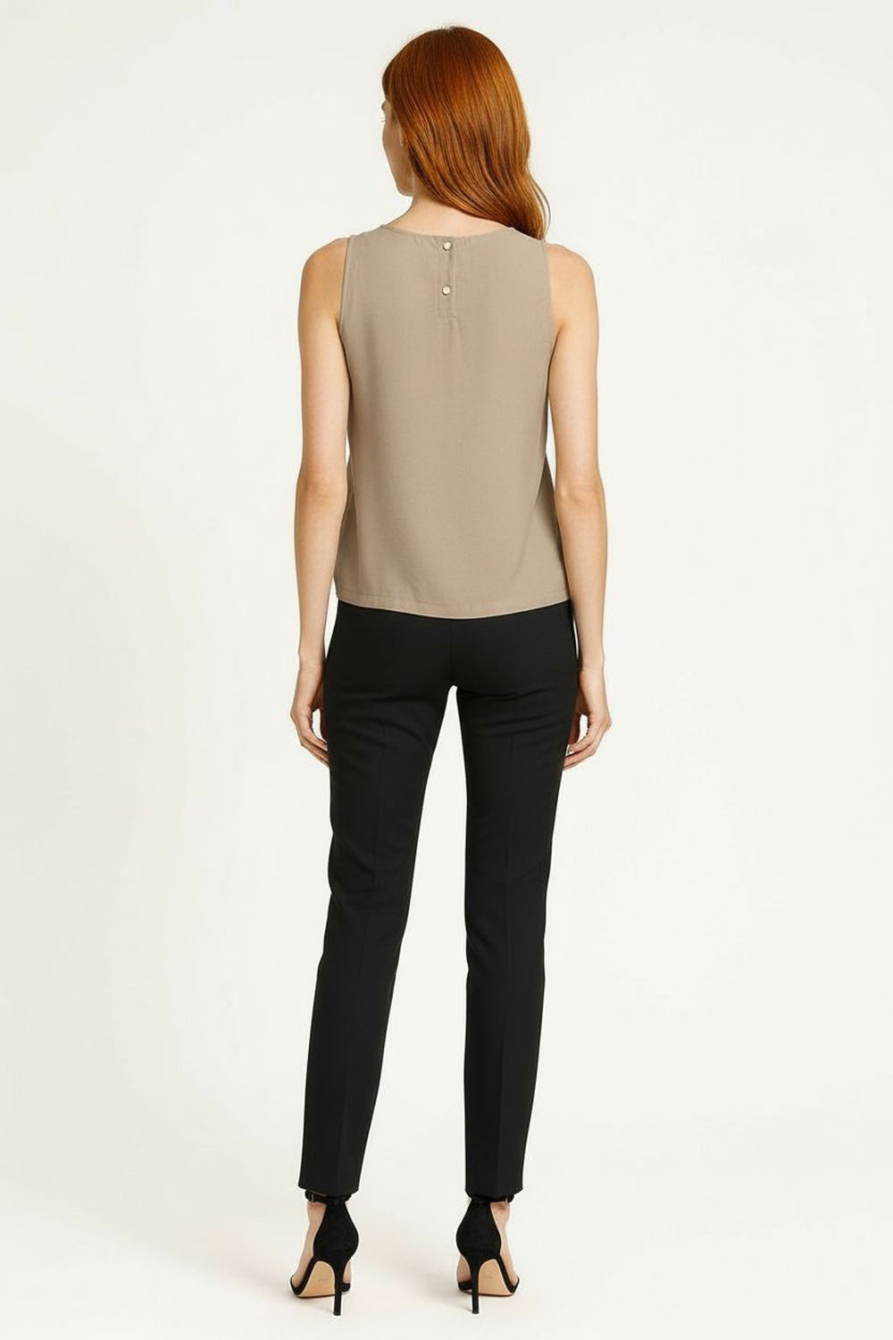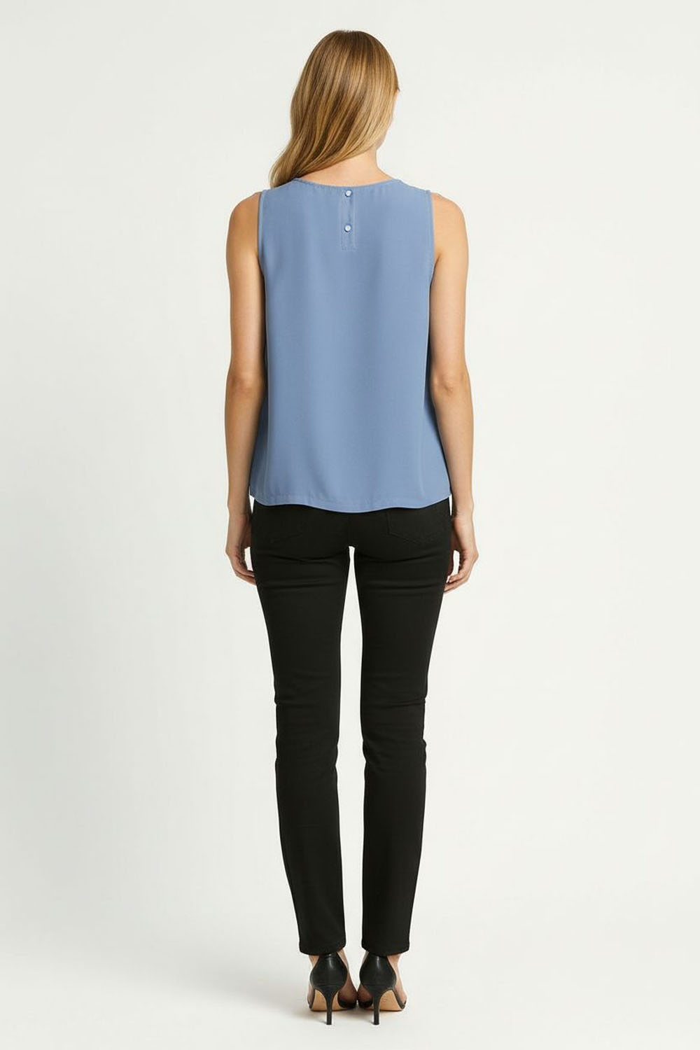 Blusa sin mangas de corte recto que aporta frescura y comodidad, escote redondo clásico que favorece un look versátil, detalle de botones en la parte trasera que añade un toque moderno y práctico, confección en tejido ligero ideal para outfits casuales y combinaciones de temporada