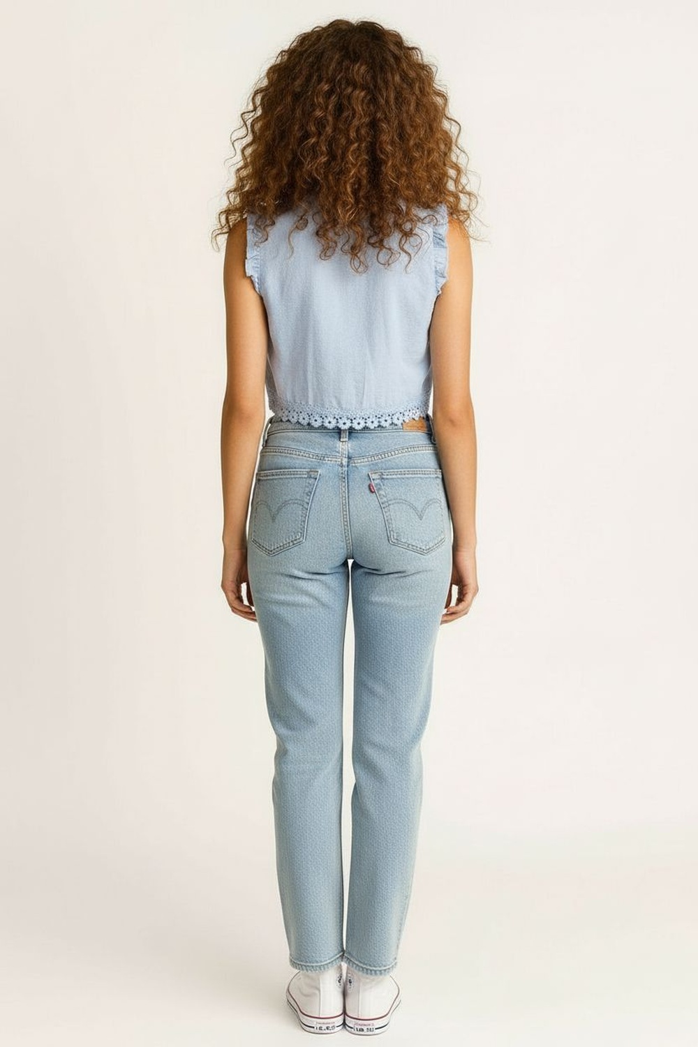 Jeans de tiro medio con cierre frontal y botón metálico, diseño wide leg con apertura gradual en pierna que aporta amplitud equilibrada, confección en mezclilla resistente con ligera elasticidad, estructura de cinco bolsas funcionales y presillas para cinturón, acabado deshilado en bajo que añade detalle actual al diseño