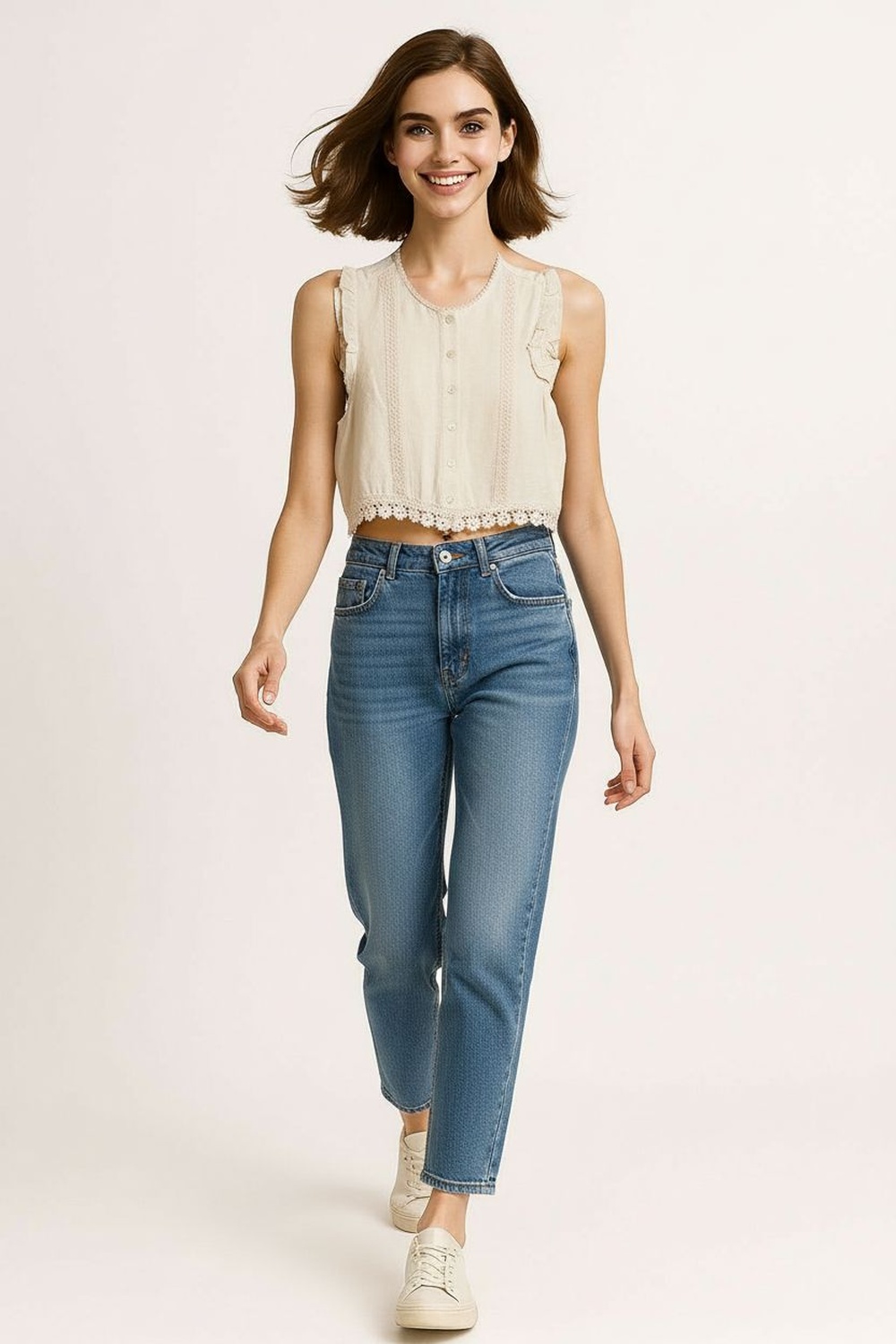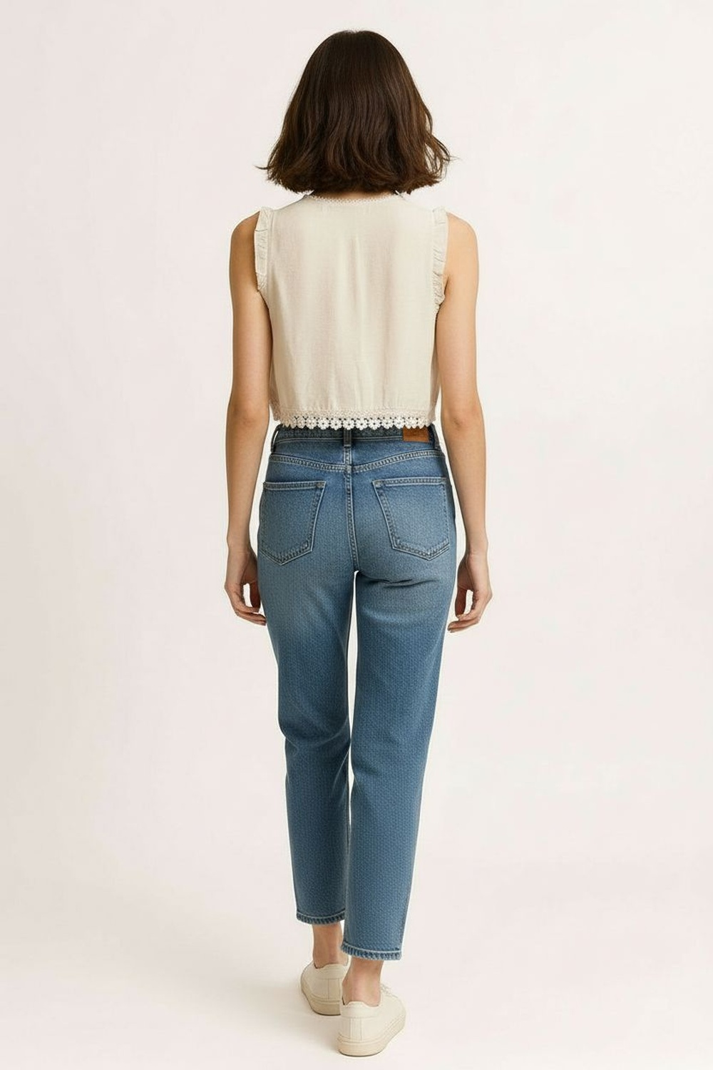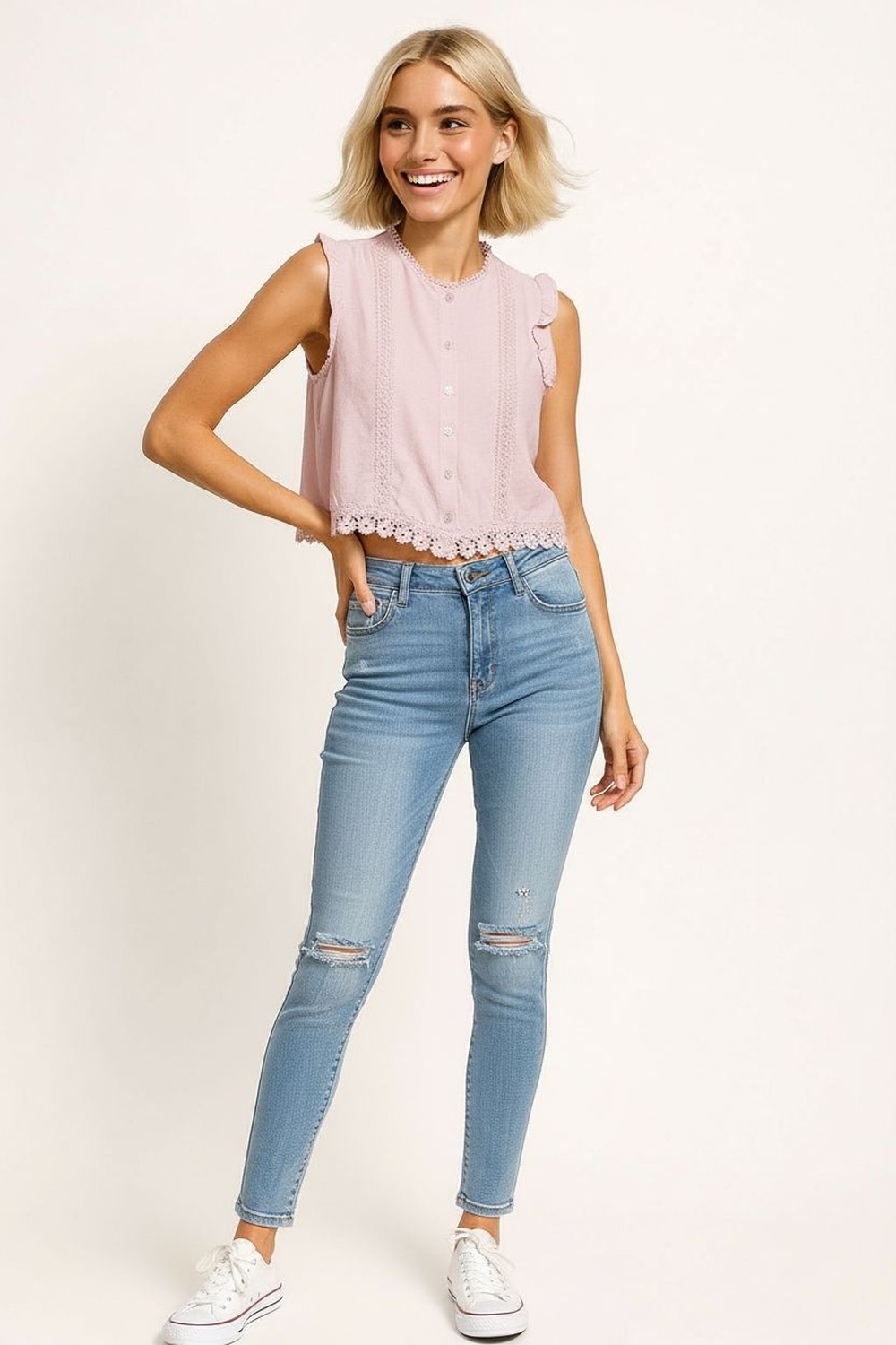 Blusa sin mangas con cuello alto y botonadura frontal decorativa, aplicación de encaje en paneles verticales que aporta textura delicada, corte recto ligeramente corto que define la silueta, terminación inferior con acabado ondulado que añade detalle femenino, confección en tejido ligero de tacto suave