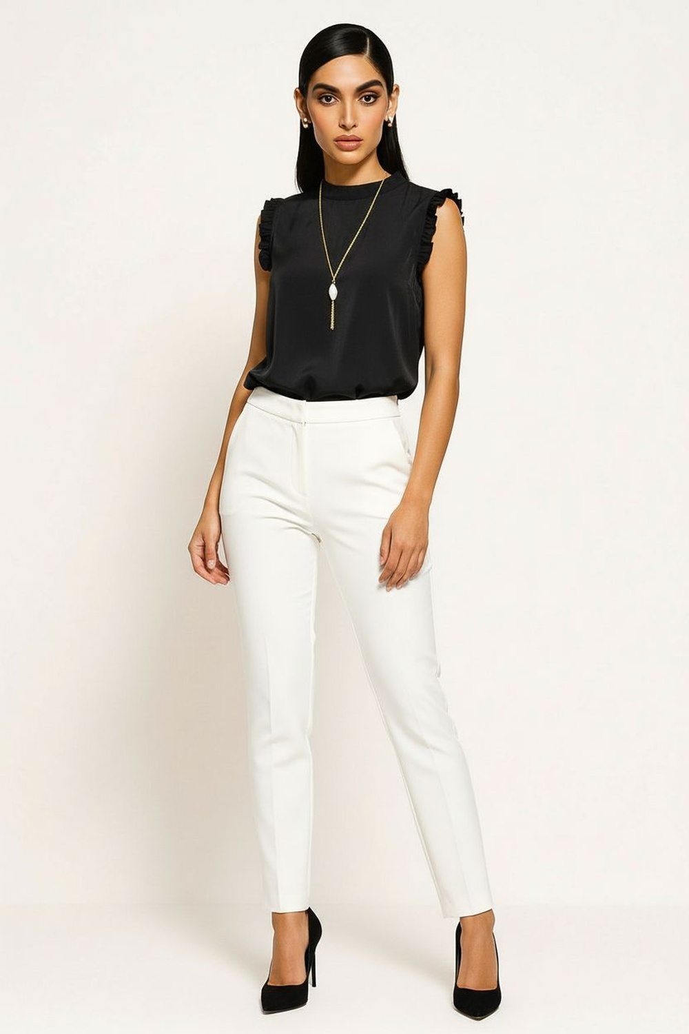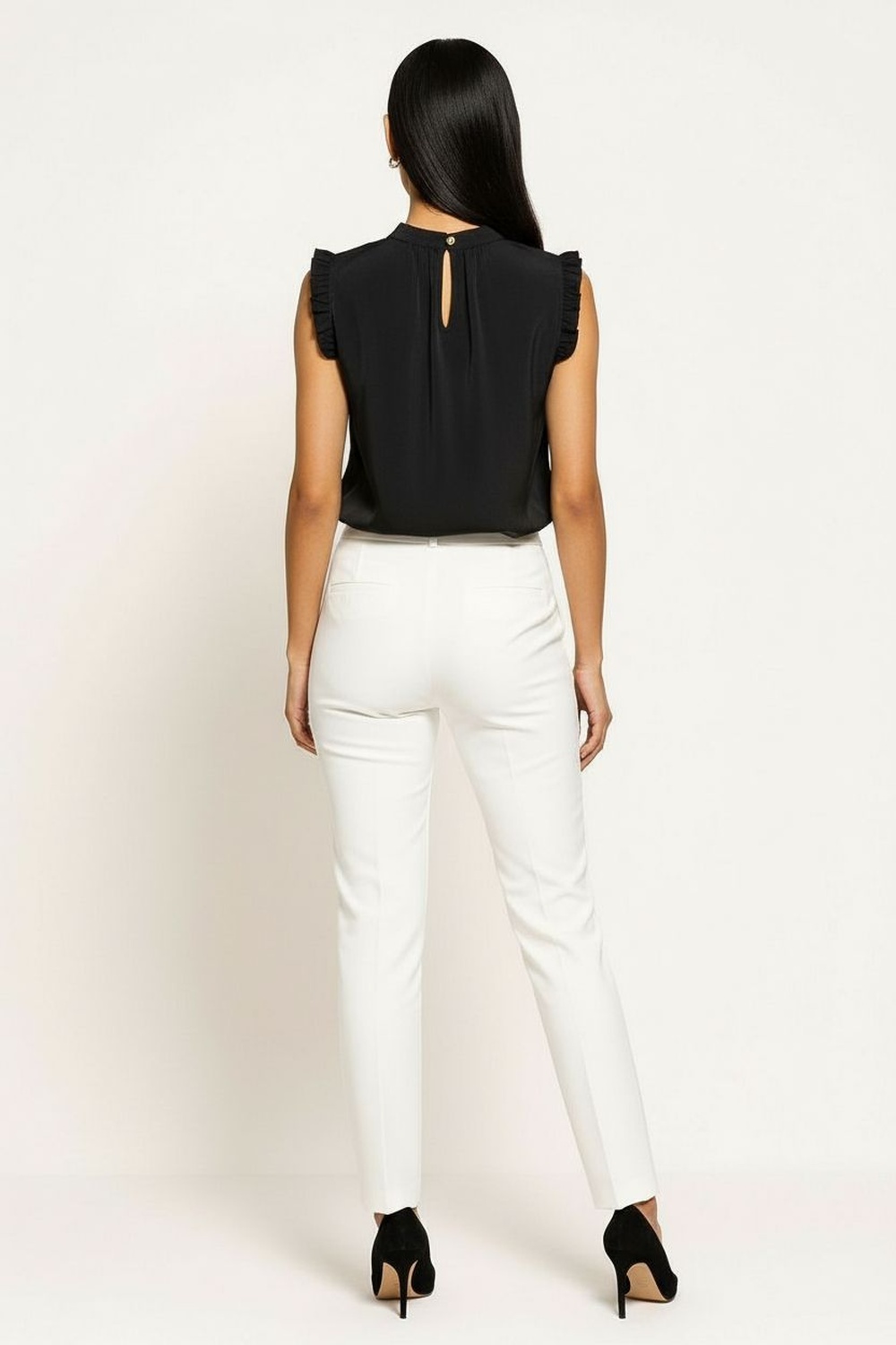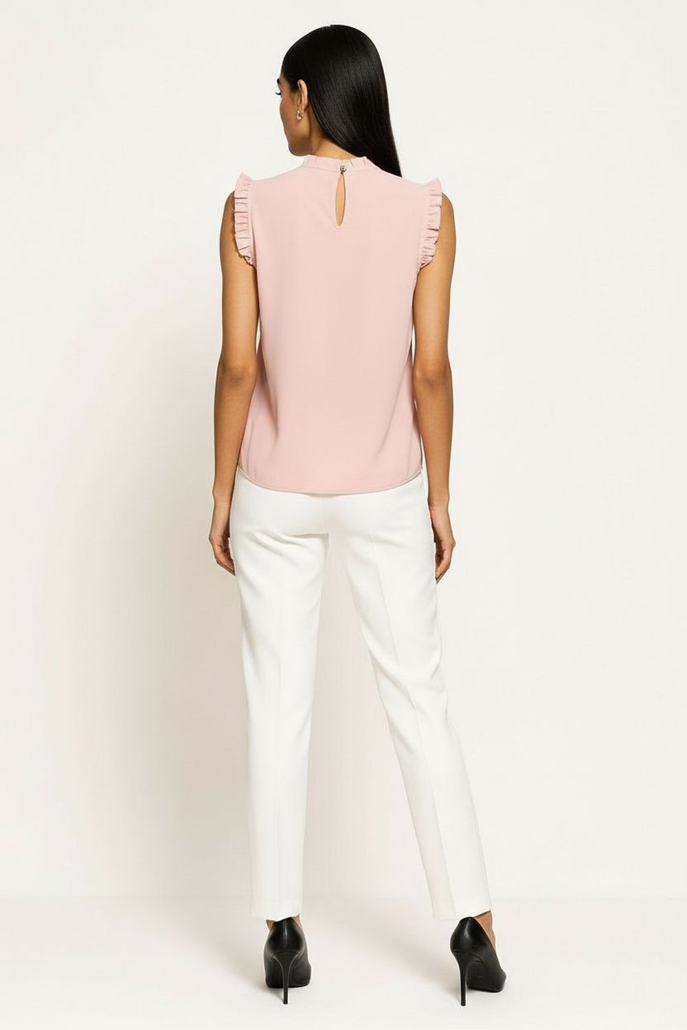Blusa sin mangas con cuello redondo que aporta estructura, detalle de volantes laterales que añade movimiento, caída recta que ofrece comodidad, confección ligera que brinda sensación fresca