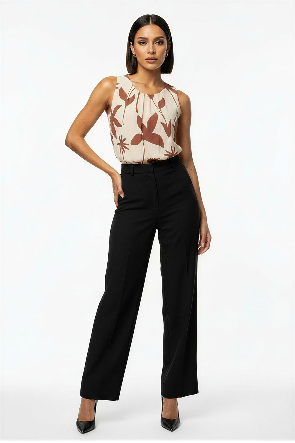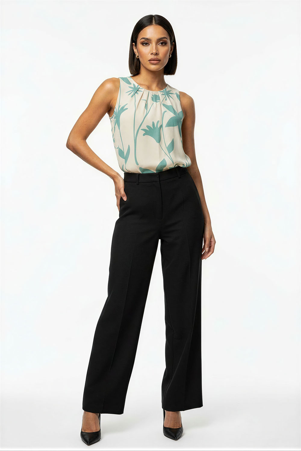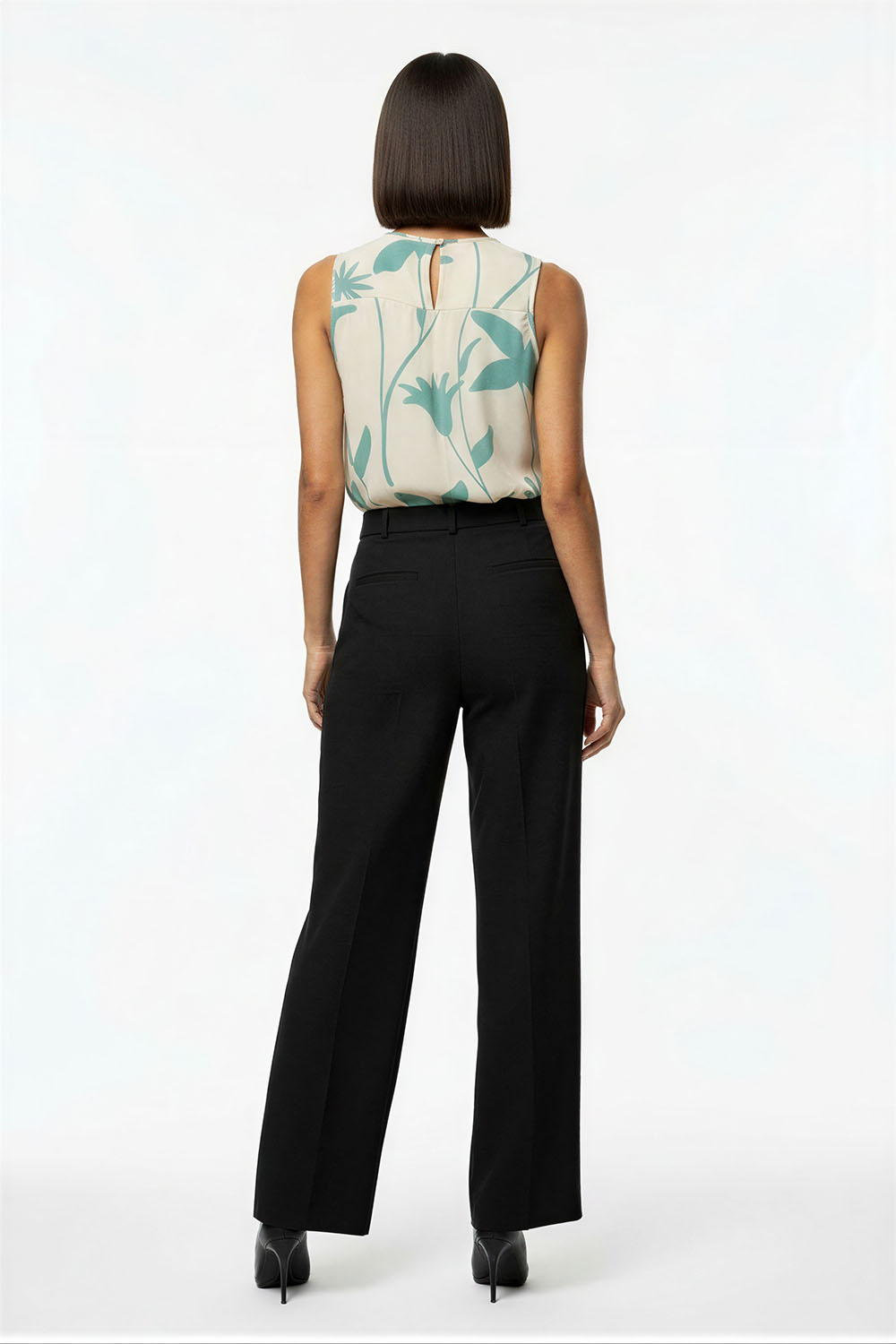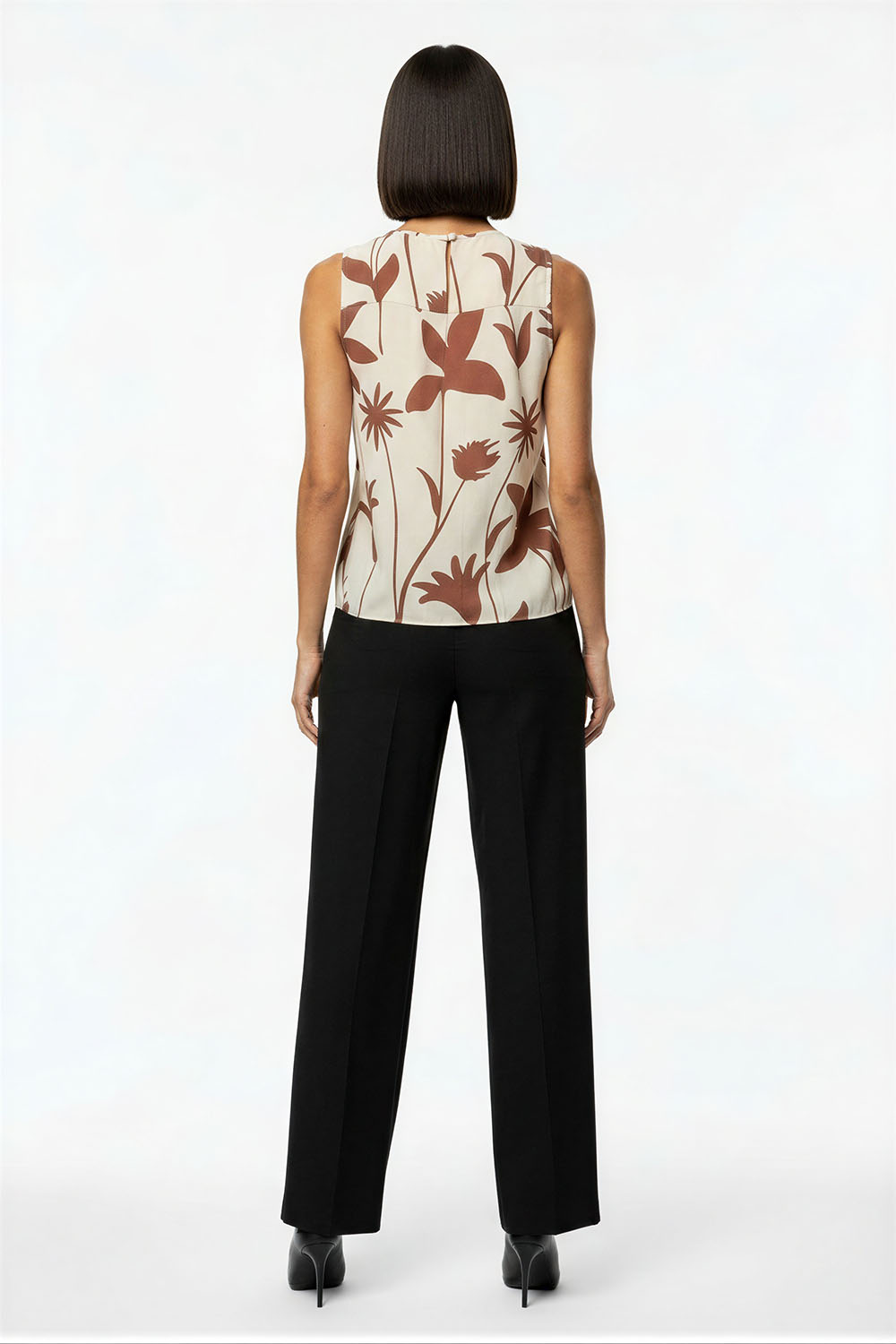 Blusa sin mangas con cuello plisado que aporta volumen y detalle, corte recto que brinda comodidad, diseño con abertura trasera que facilita el uso, confección ligera con caída suave que favorece la frescura, acabado fluido que estiliza la silueta