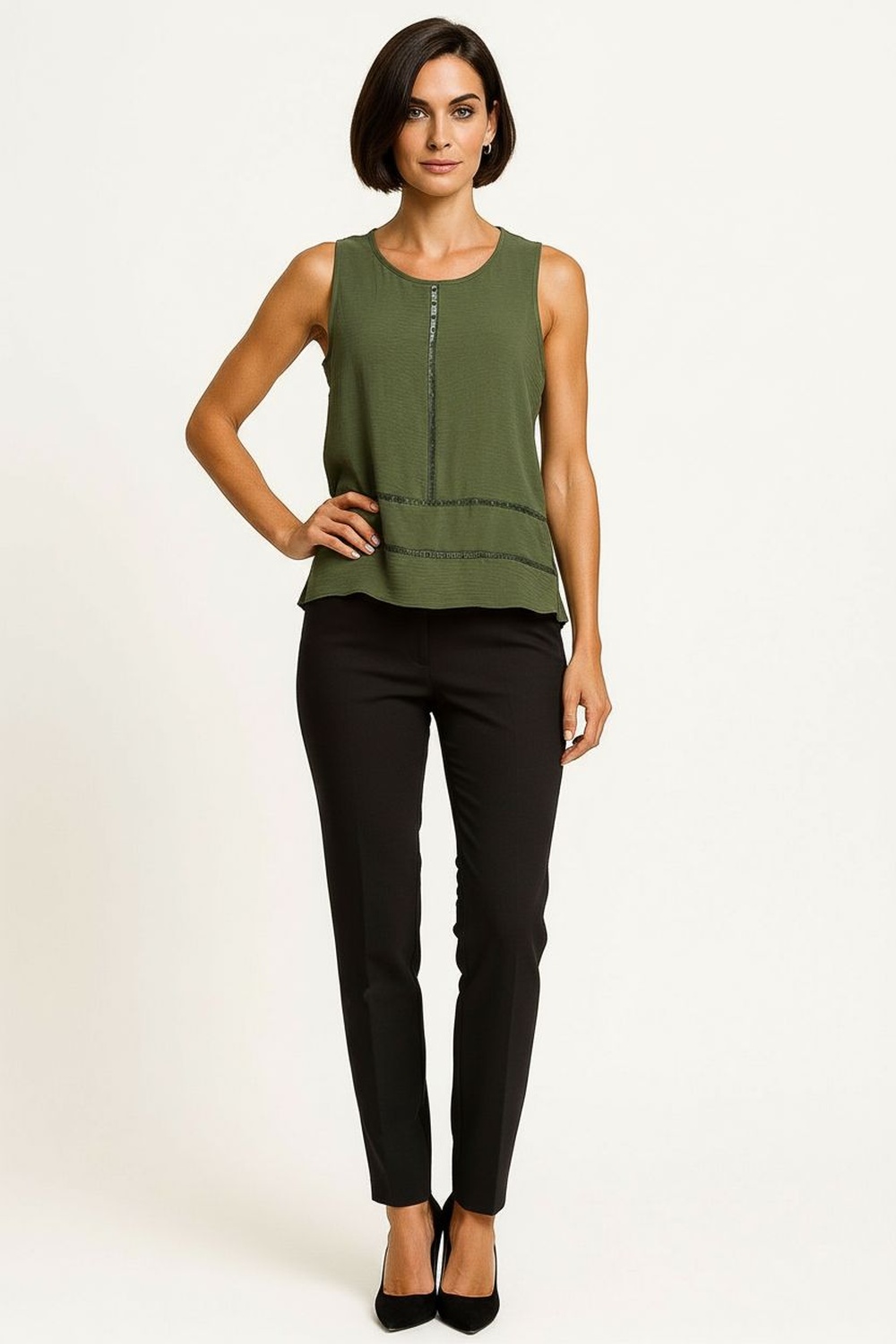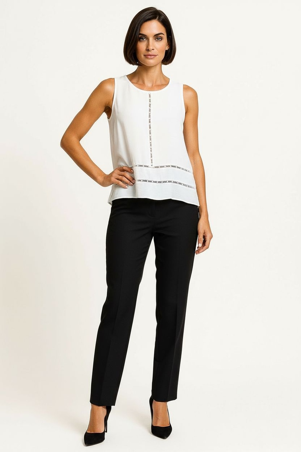 Blusa sin mangas con escote redondo y aplicación decorativa en parte frontal que aporta detalle distintivo, corte recto con ligero ajuste en cintura que define la silueta, largo extendido que brinda mayor cobertura, confección en tejido ligero con textura suave y caída uniforme