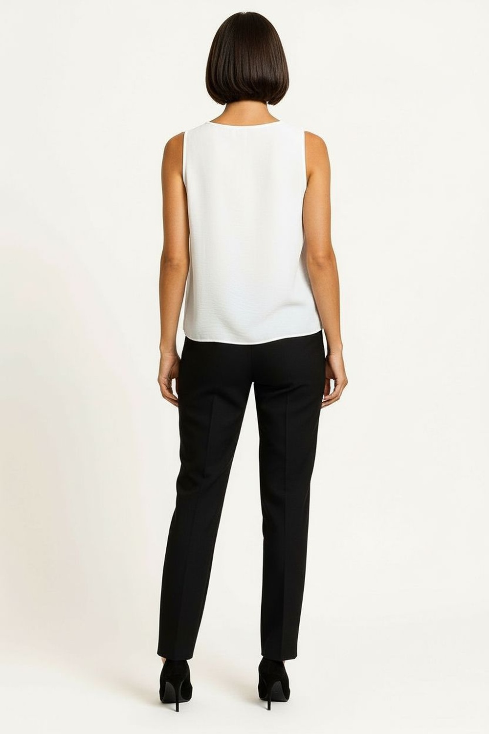 Blusa sin mangas con escote redondo de línea limpia que aporta versatilidad, hombros con ligero vuelo que generan volumen sutil, botonadura posterior funcional que facilita la colocación, corte recto con largo a cadera que ofrece ajuste cómodo, confección en tejido ligero de tacto suave ideal para uso continuo