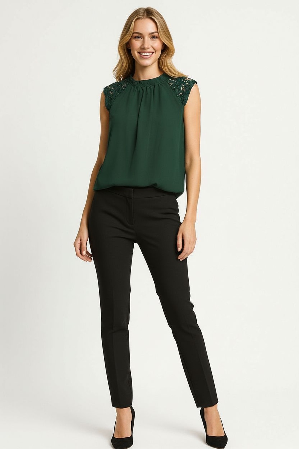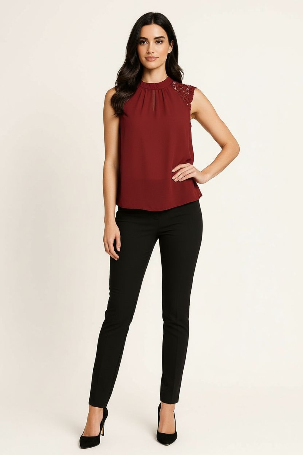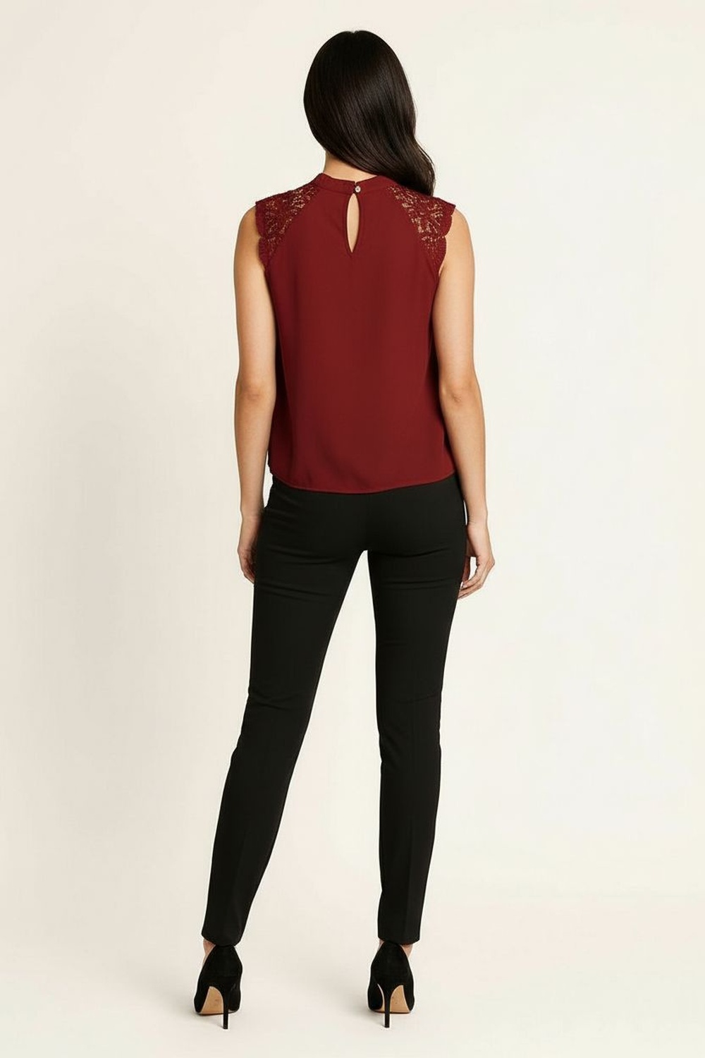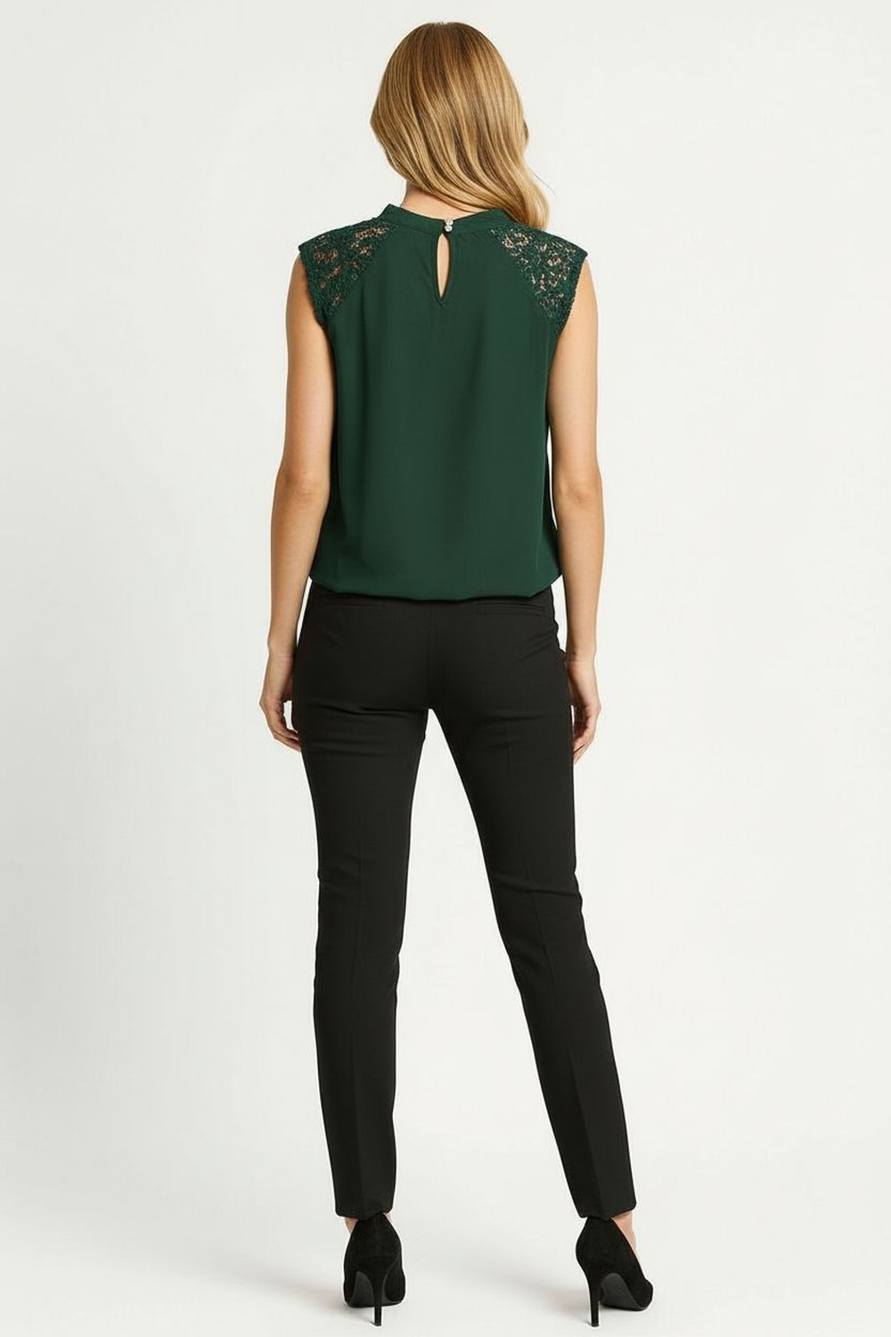 Blusa sin mangas con delicado detalle de crochet en los hombros que aporta un toque femenino y sofisticado, cuello alto con ligera abertura trasera que brinda un acabado elegante, corte recto que favorece la silueta y proporciona comodidad, confeccionada en tela ligera de caída fluida que ofrece frescura y movimiento, ideal para outfits de oficina, cenas o combinaciones elegantes de temporada