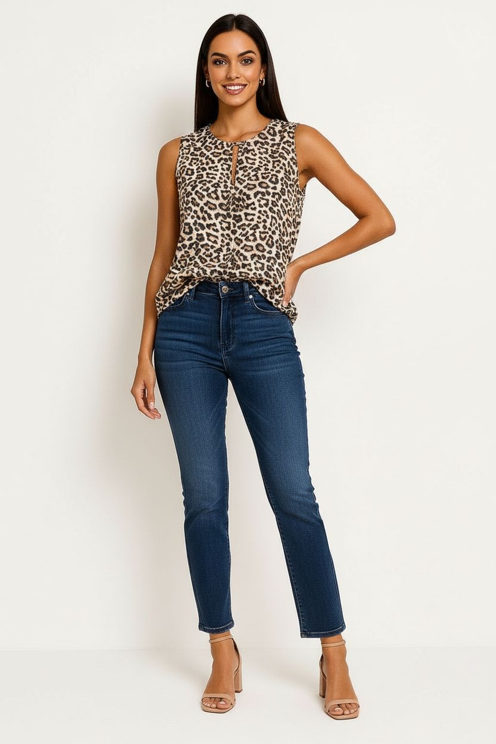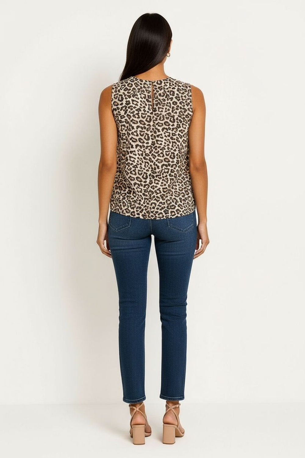 Blusa sin mangas de corte recto, escote redondo, detalle de abertura frontal con lazo ajustable, caída ligera, estructura cómoda para uso diario