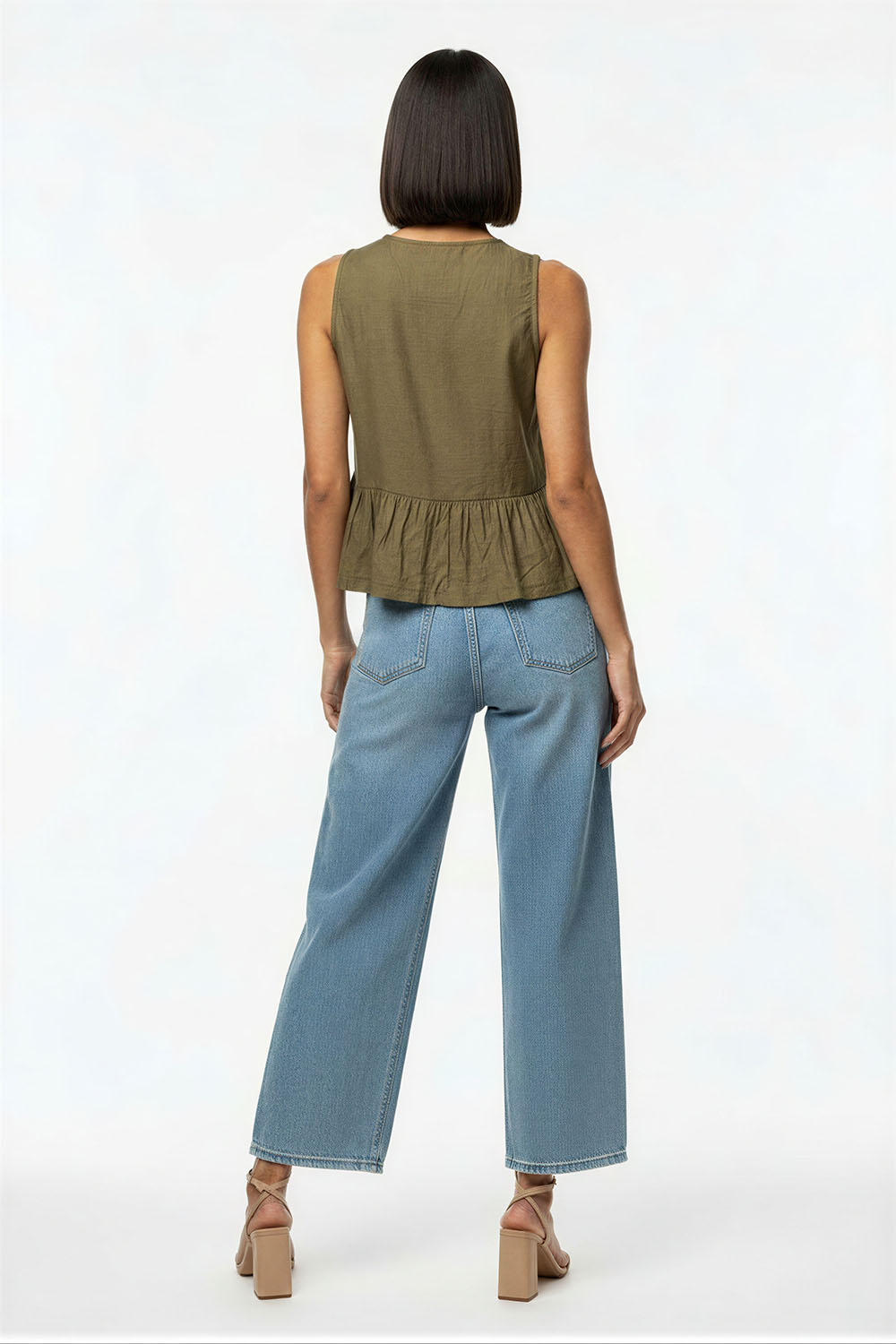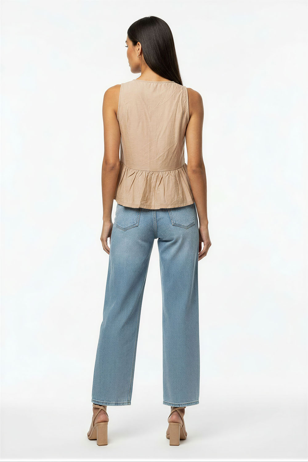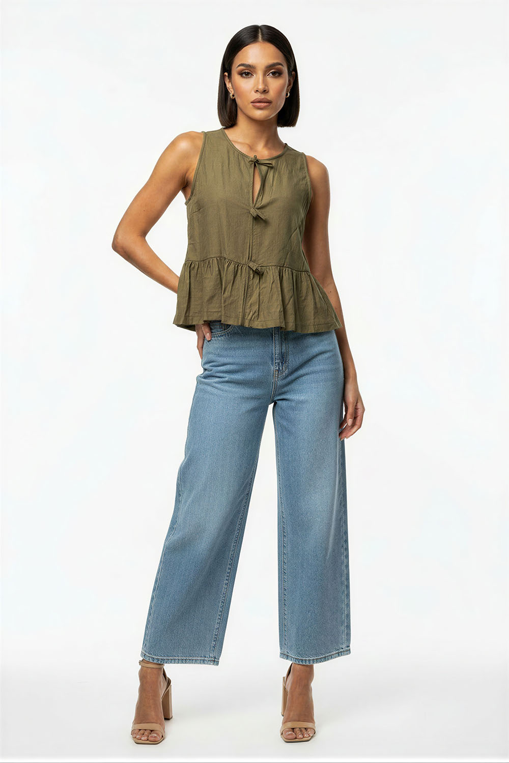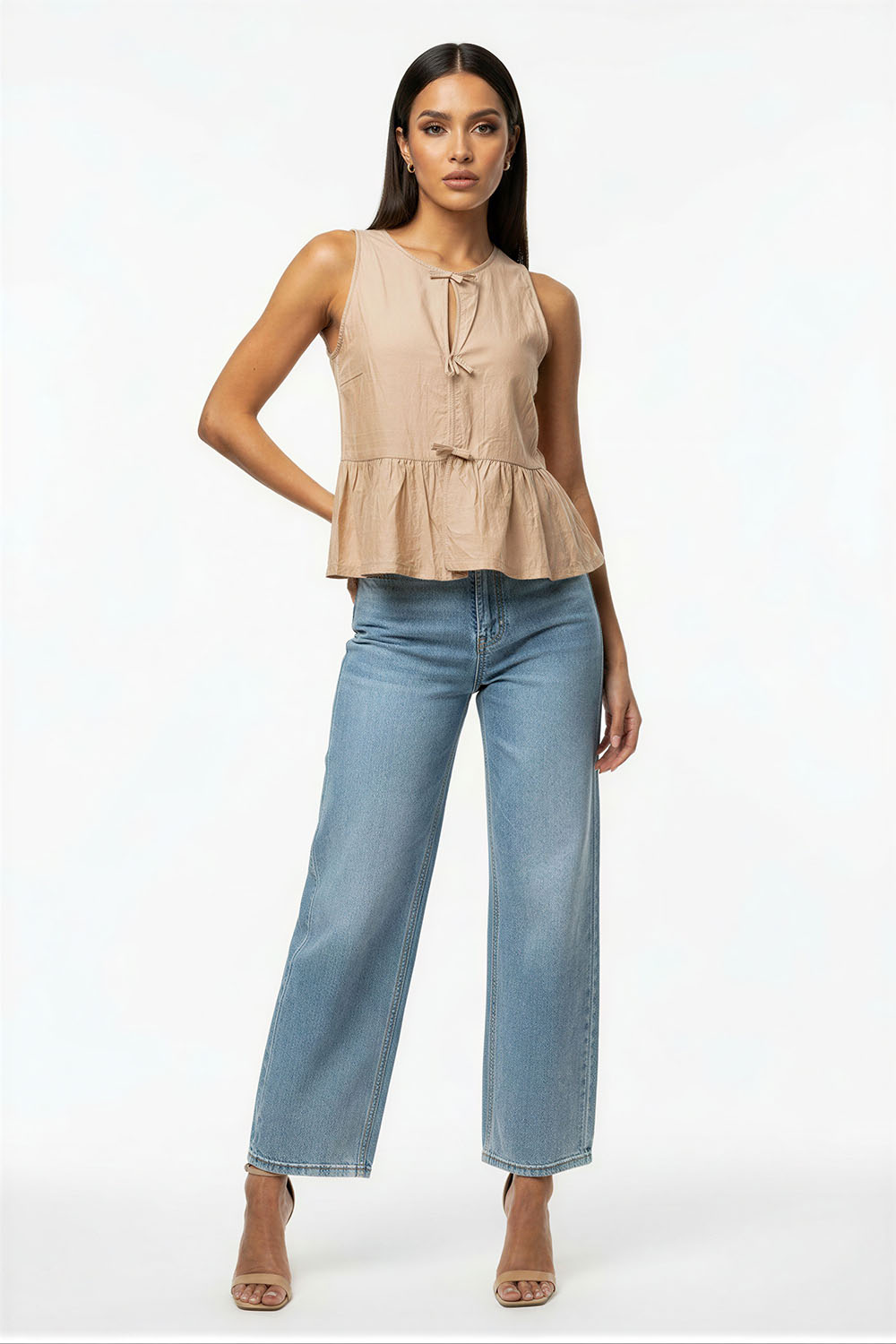 Blusa sin mangas con cuello redondo que brinda comodidad, diseño con lazos decorativos al frente que aportan detalle visual, corte recto con ligero vuelo en la parte inferior que favorece la silueta, confección en tejido ligero de caída suave