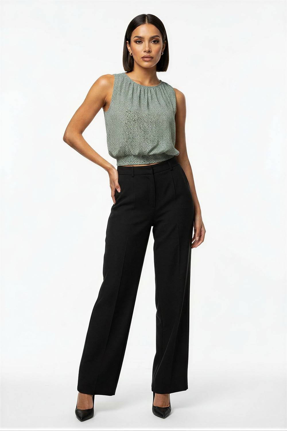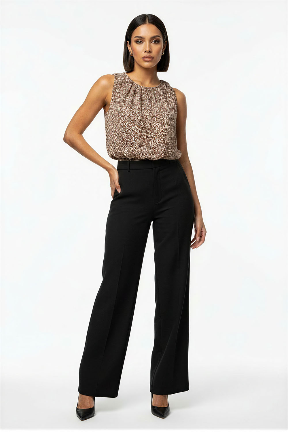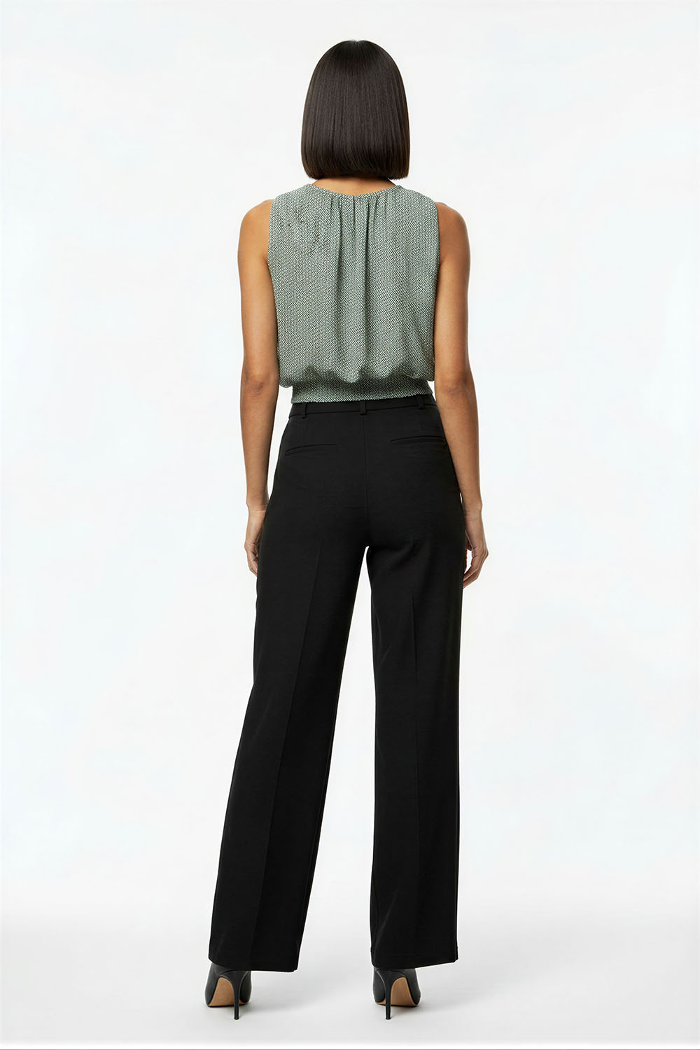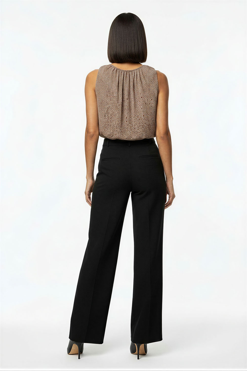 Blusa sin mangas con cuello plisado que aporta volumen y detalle, corte recto que brinda comodidad, diseño con abertura trasera que facilita el uso, confección ligera con caída suave que favorece la frescura, acabado fluido que estiliza la silueta