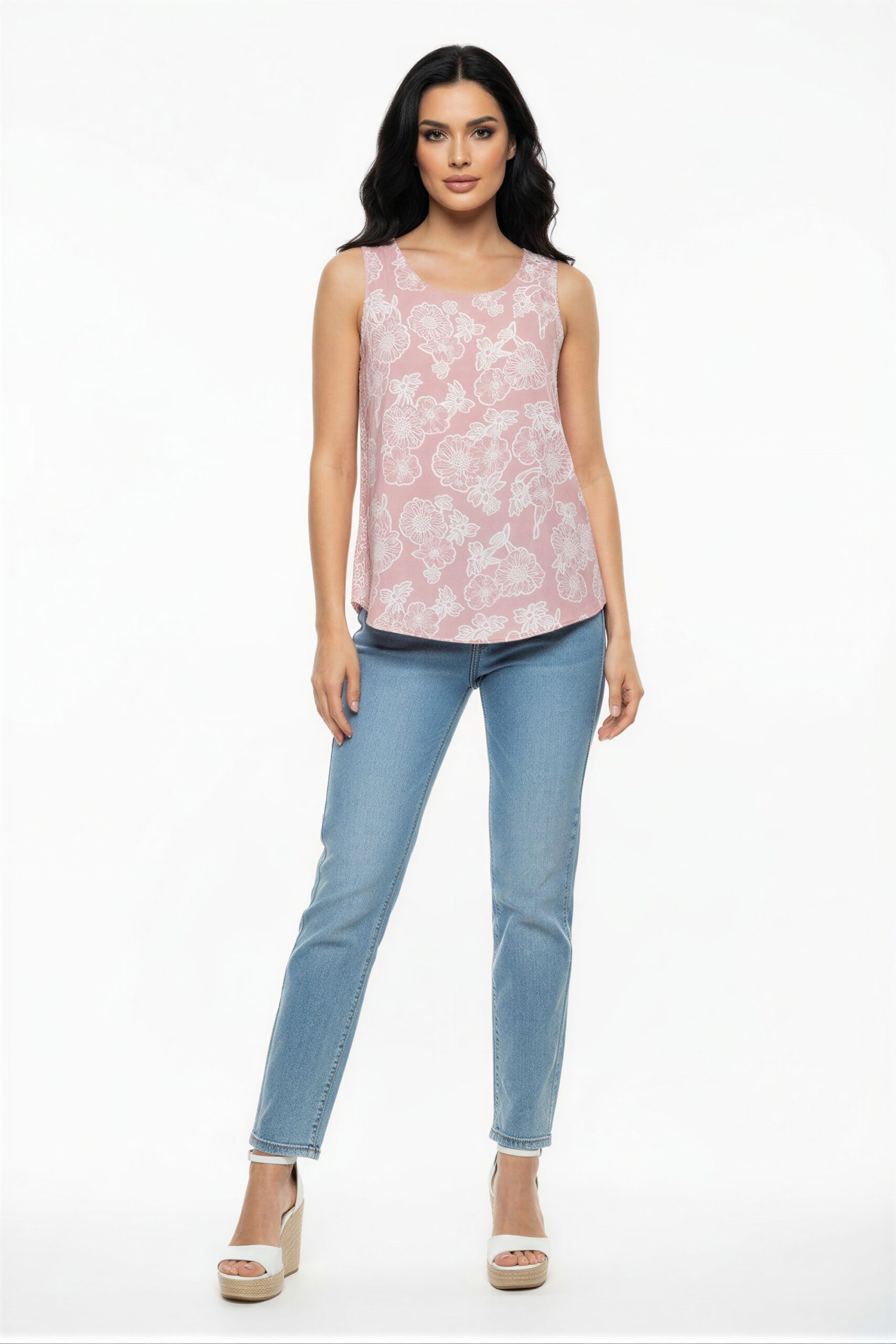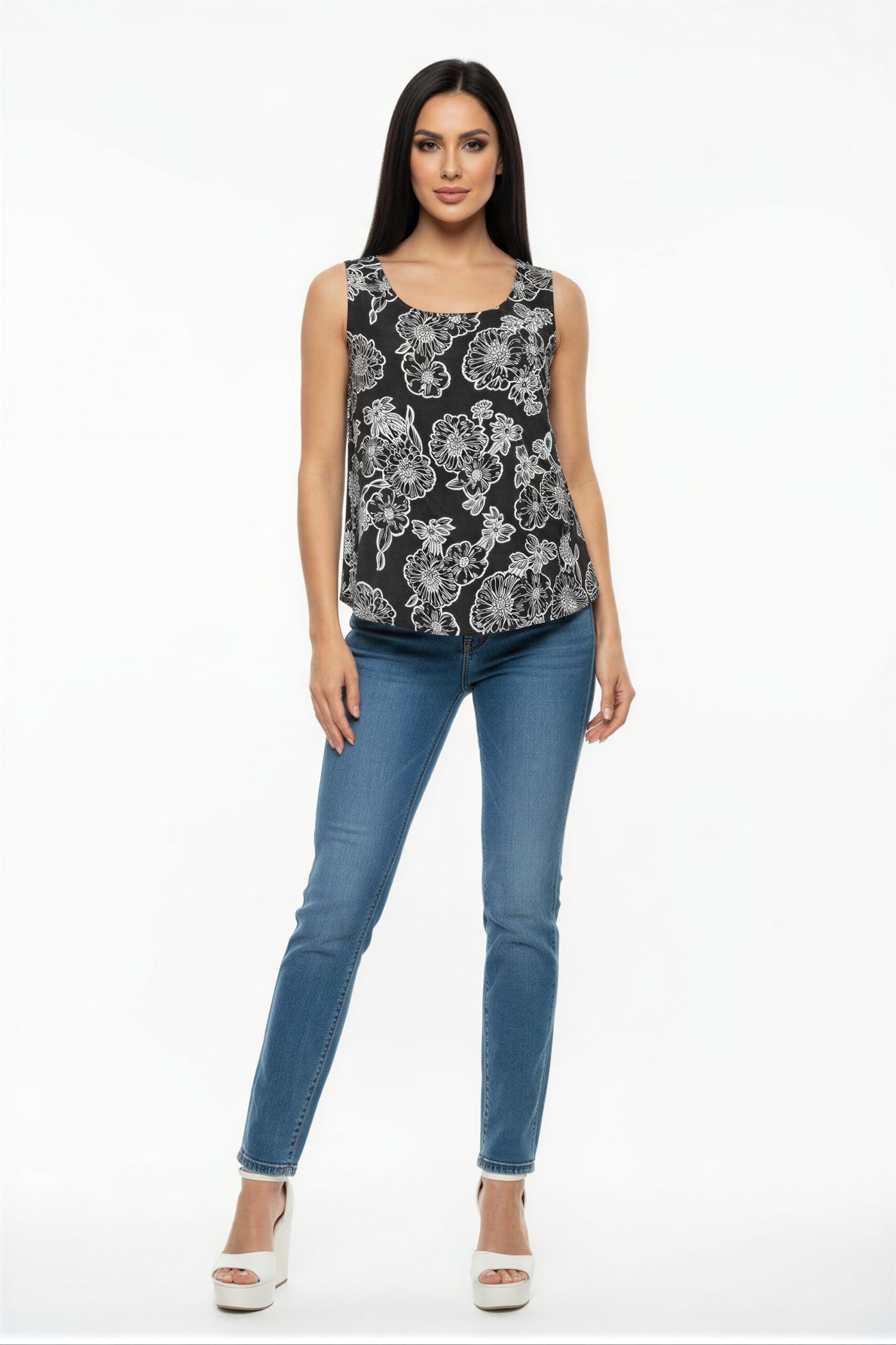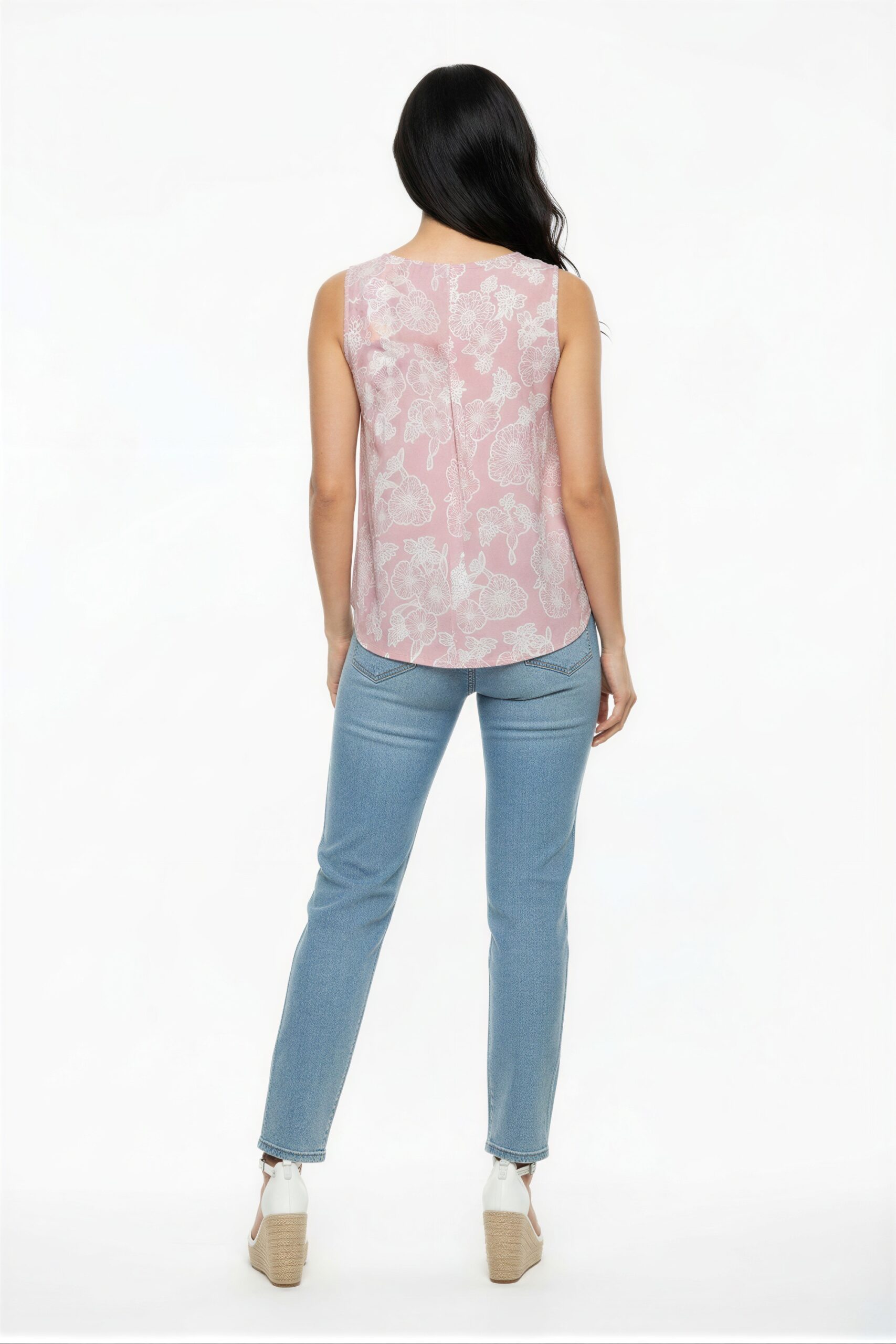 Blusa sin mangas cuello redondo corte amplio con abertura posterior y ajuste ligero