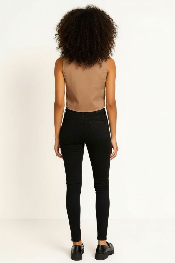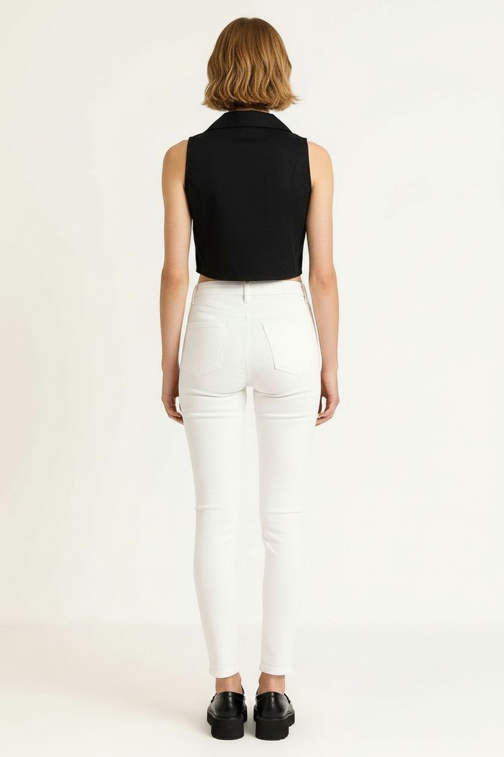 Blusa sin mangas con cuello camisero que aporta un estilo moderno y fresco, diseño frontal con tres nudos ajustables que permiten personalizar el ajuste y añaden un detalle llamativo, corte corto por encima de la cintura que estiliza y brinda un look juvenil, confección en tela ligera que asegura frescura y comodidad en todo momento, acabados reforzados que garantizan durabilidad