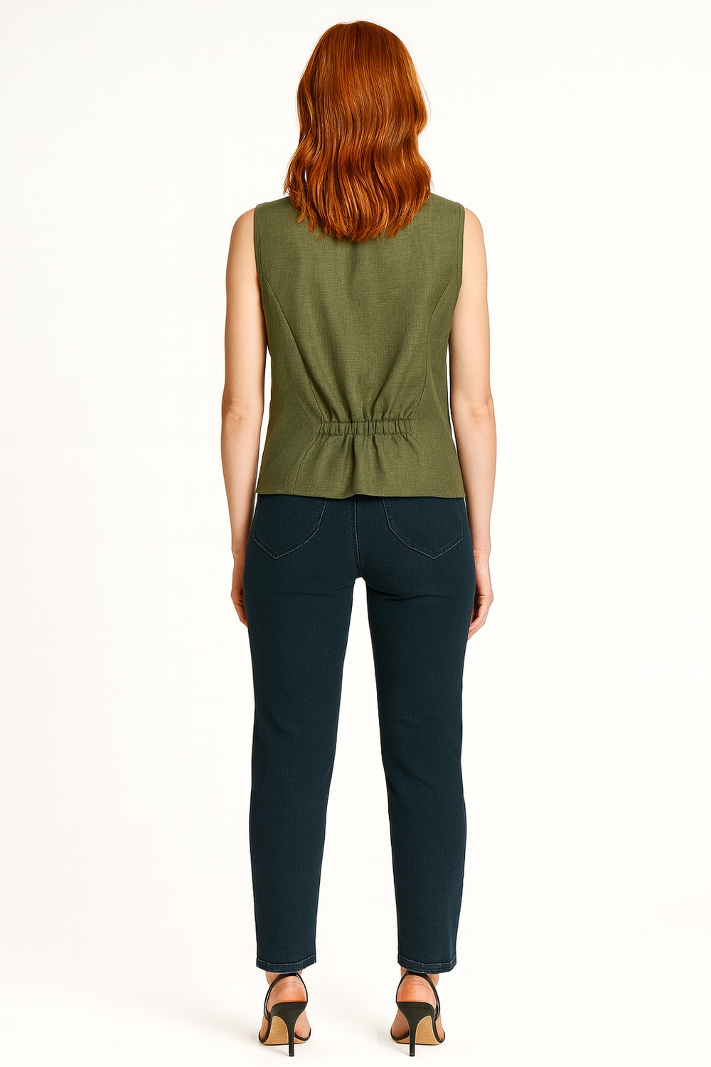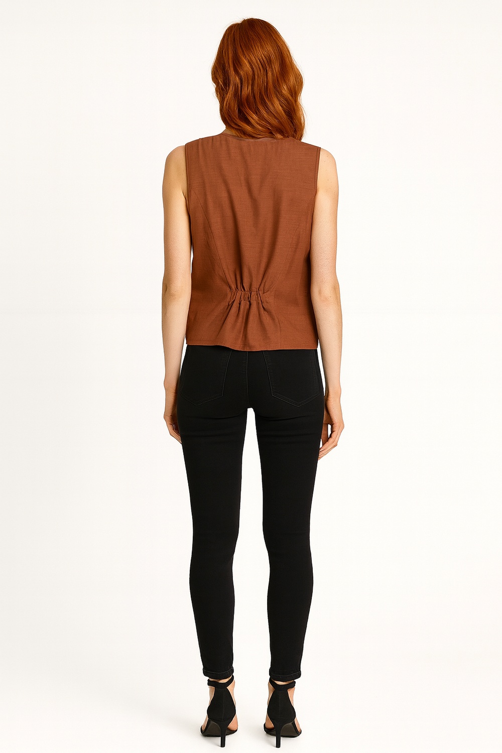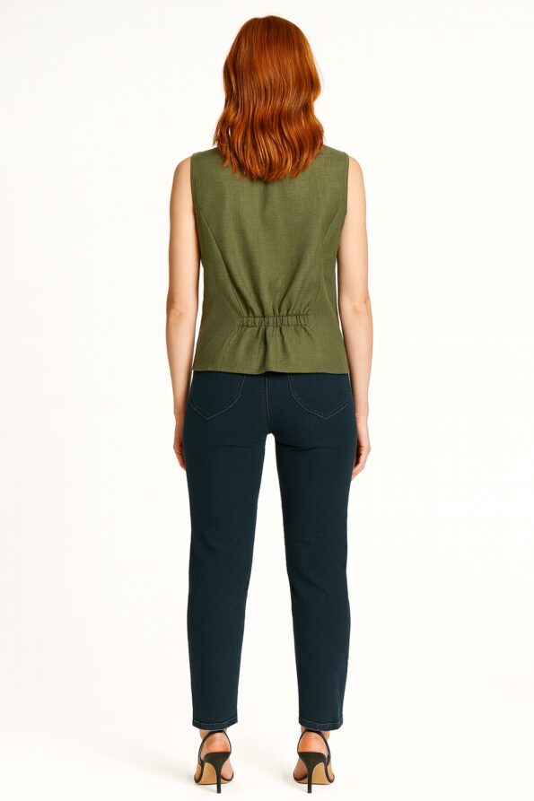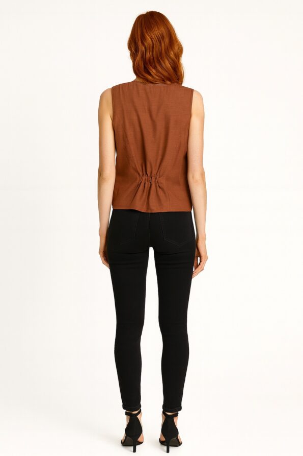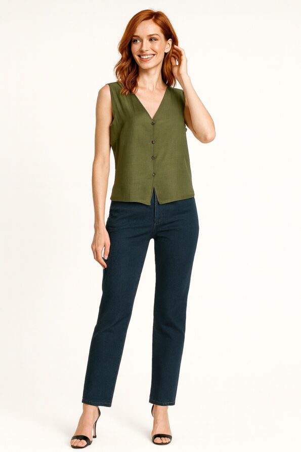 Blusa sin mangas con diseño tipo chaleco que aporta un estilo moderno y versátil, escote en V pronunciado que estiliza el cuello, botonadura frontal funcional que realza el diseño y brinda practicidad, silueta recta con caída ligera que favorece la movilidad, confección en tela fresca y cómoda ideal para uso diario
