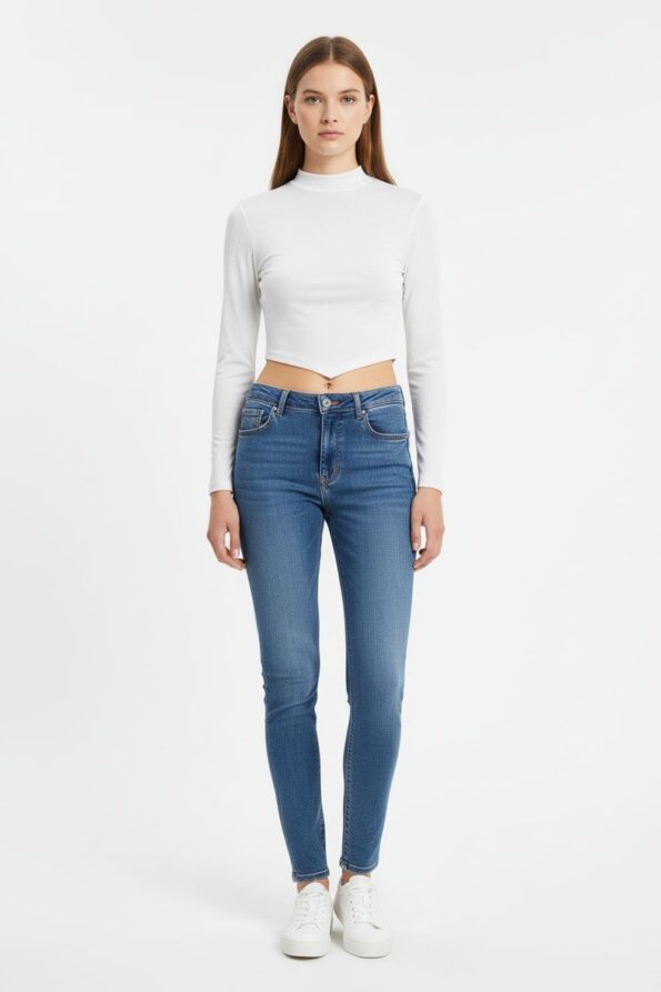 Blusa de manga larga confeccionada en tejido slinky con acabado brillante, cuello alto que aporta un toque sofisticado, diseño crop con terminación en punta al frente que estiliza la figura, silueta ajustada que realza la forma del cuerpo, costuras reforzadas que brindan resistencia y durabilidad
