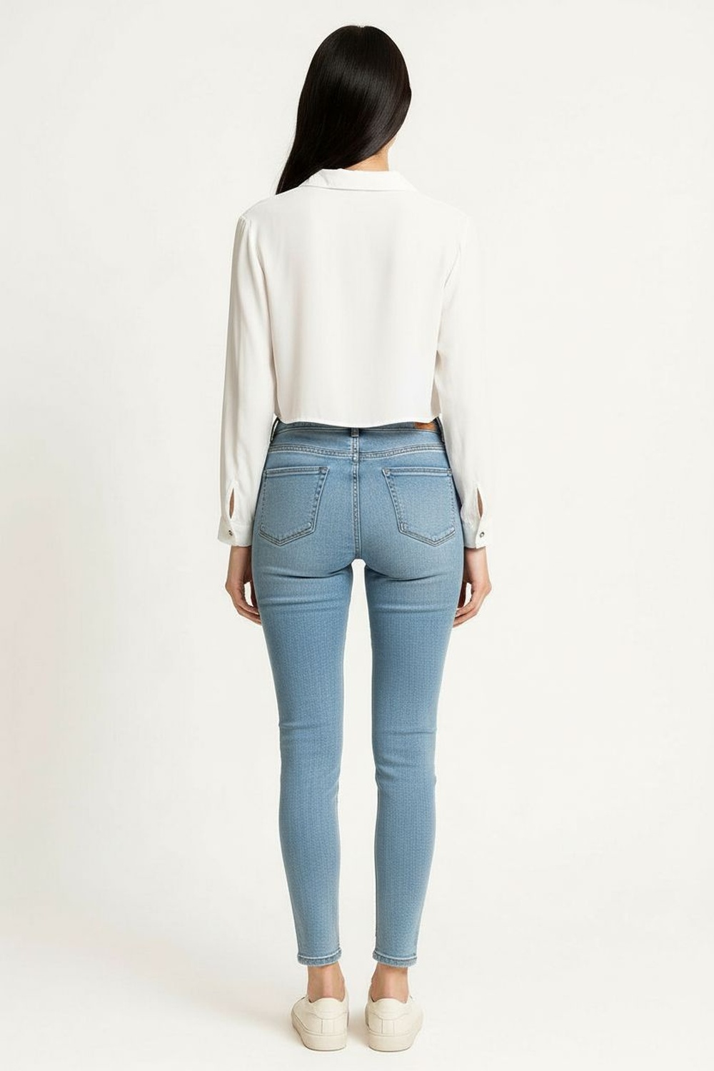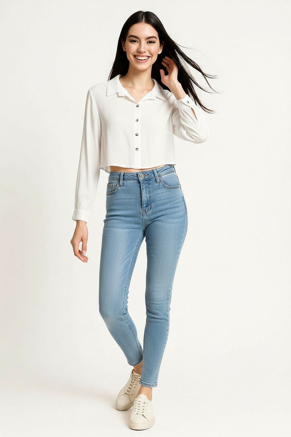 Blusa de manga larga con cuello camisero y botonadura frontal, corte corto a la cintura que define proporción, mangas rectas con puño sencillo, confección ligera de tacto suave que brinda comodidad