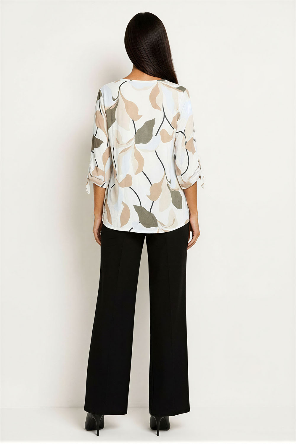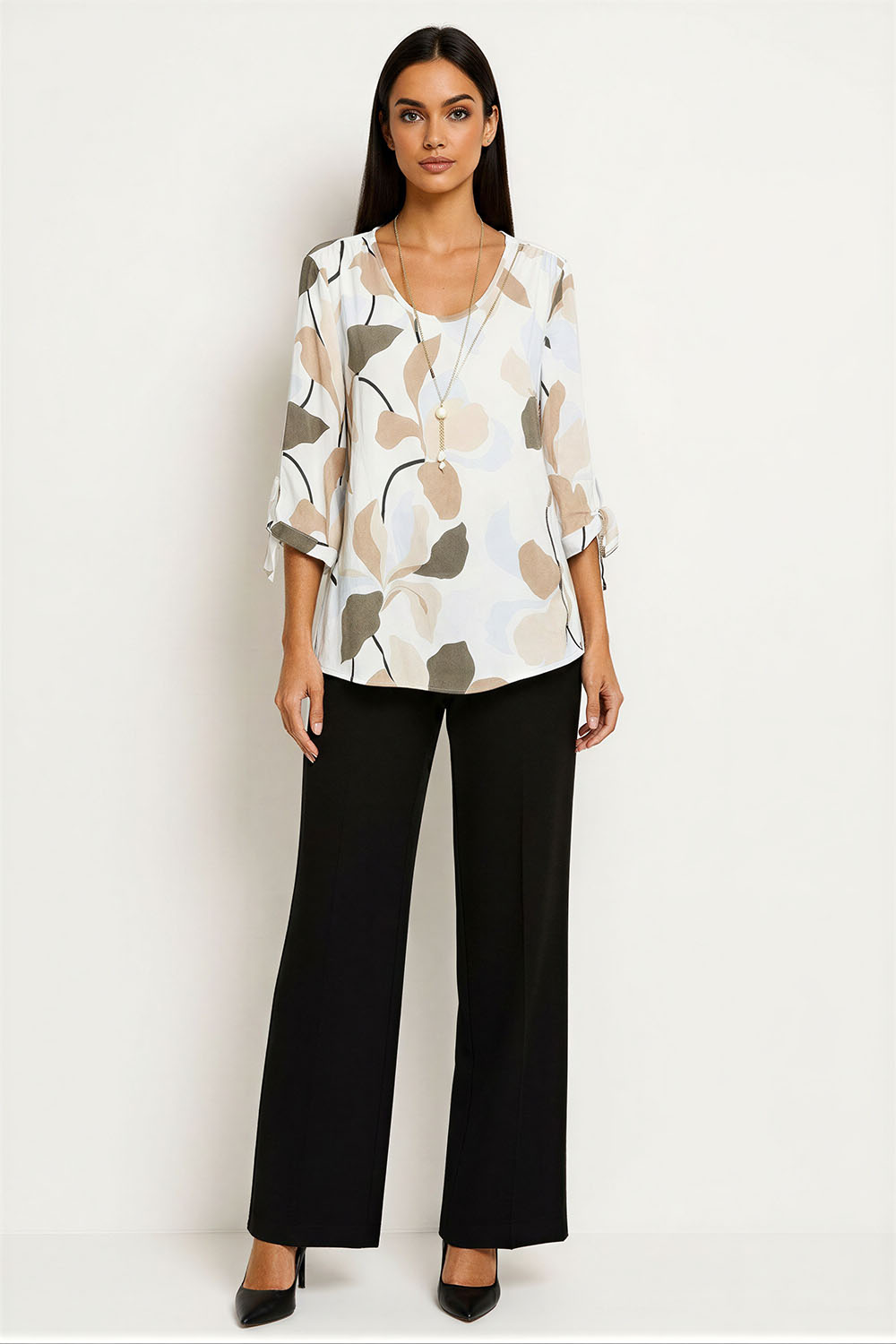 Blusa de corte amplio con caída fluida que brinda comodidad, escote redondo que enmarca el cuello, manga tres cuartos con abertura lateral y ajuste ligero, incluye accesorio tipo collar que complementa el diseño, confección en tejido ligero que favorece frescura y movimiento natural