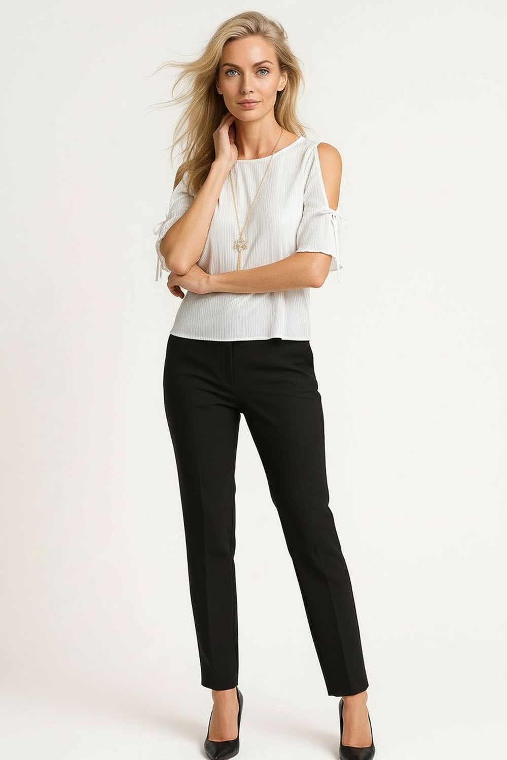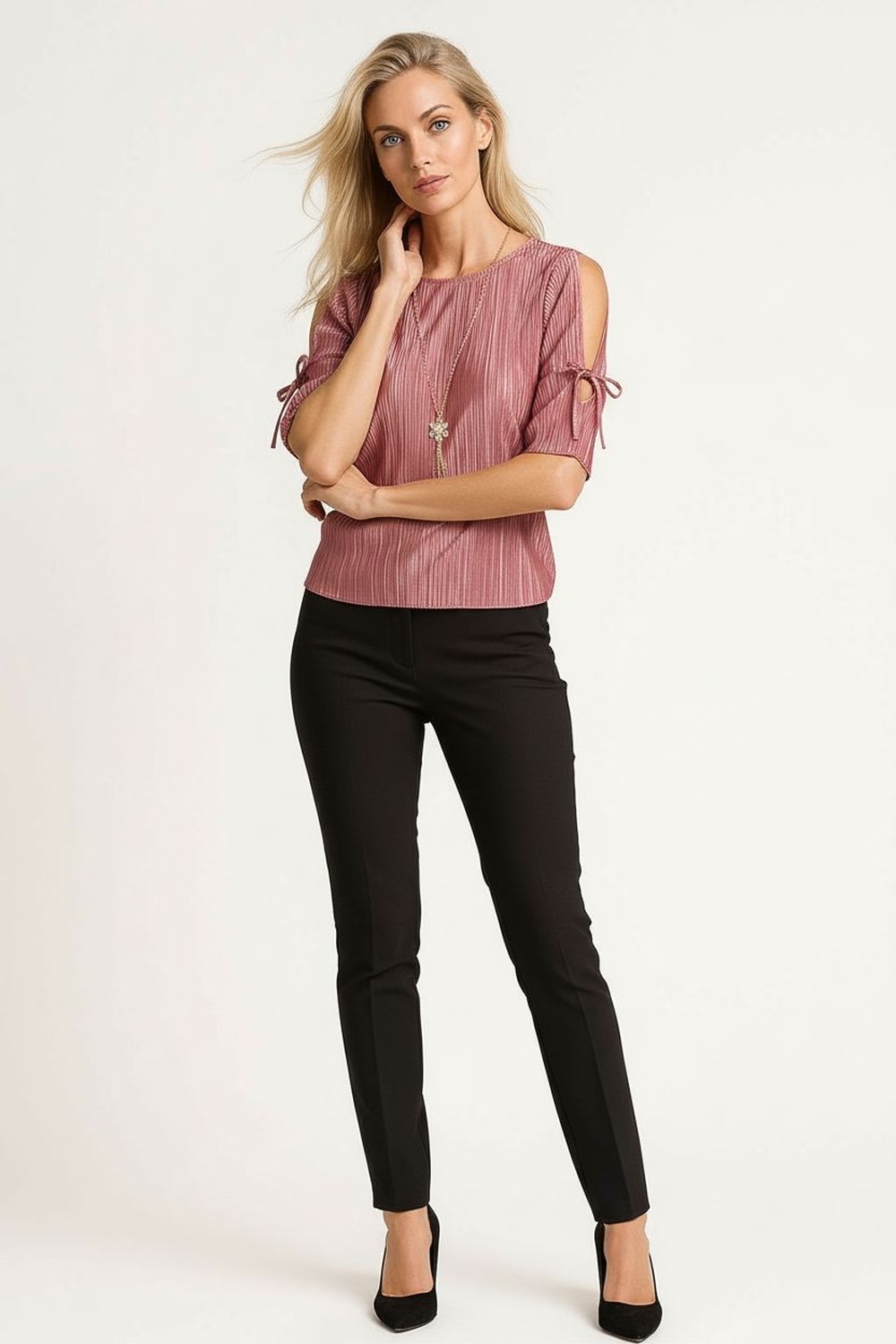 Blusa de cuello redondo con caída recta que brinda comodidad, manga corta con ligero volumen que aporta equilibrio al diseño, confección en tela con textura sutil que realza la prenda, incluye accesorio desmontable que añade un detalle decorativo, terminación recta en bajo que facilita el ajuste