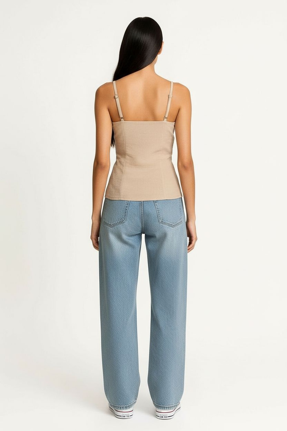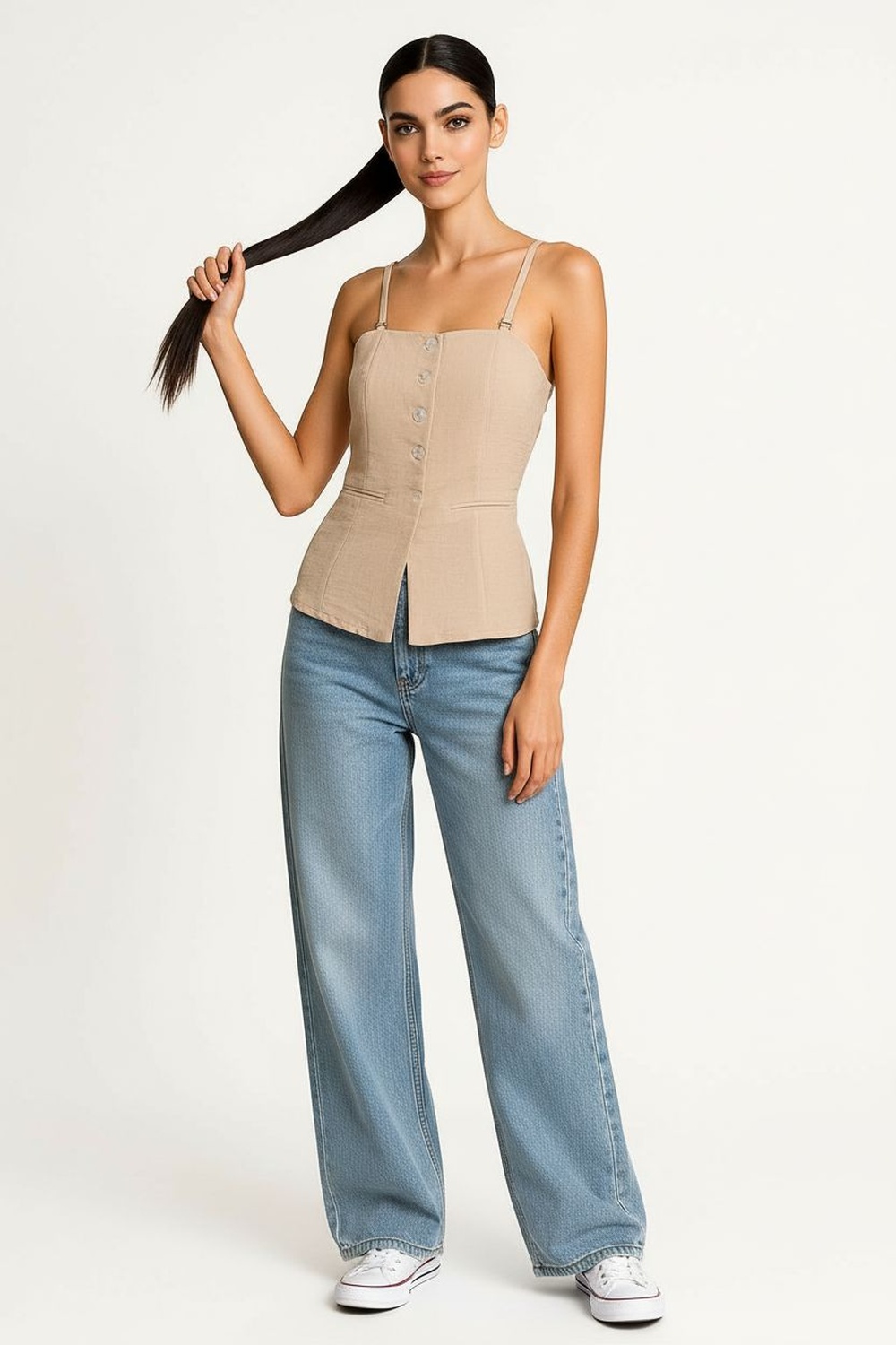 Blusa tipo chaleco con tirantes, escote recto, botonadura frontal, ajuste al cuerpo, corte a la cadera, bolsillos laterales