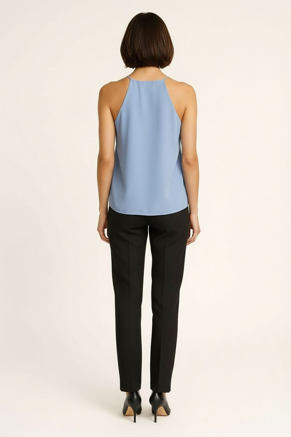 Blusa de tirantes finos con escote halter que estiliza la figura, confeccionada en tela ligera y fresca ideal para climas cálidos, pliegues frontales que aportan caída elegante, abertura trasera con cierre de botón para un ajuste sencillo, perfecta para crear combinaciones casuales o semi formales con un toque femenino