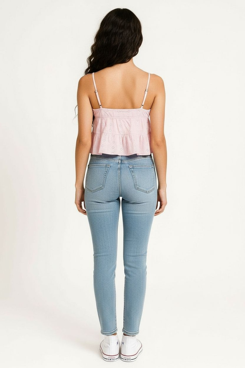 Blusa con tirantes delgados, escote recto con detalle de botones, cuerpo con bordado decorativo, corte bajo busto, terminación con olan en bajo