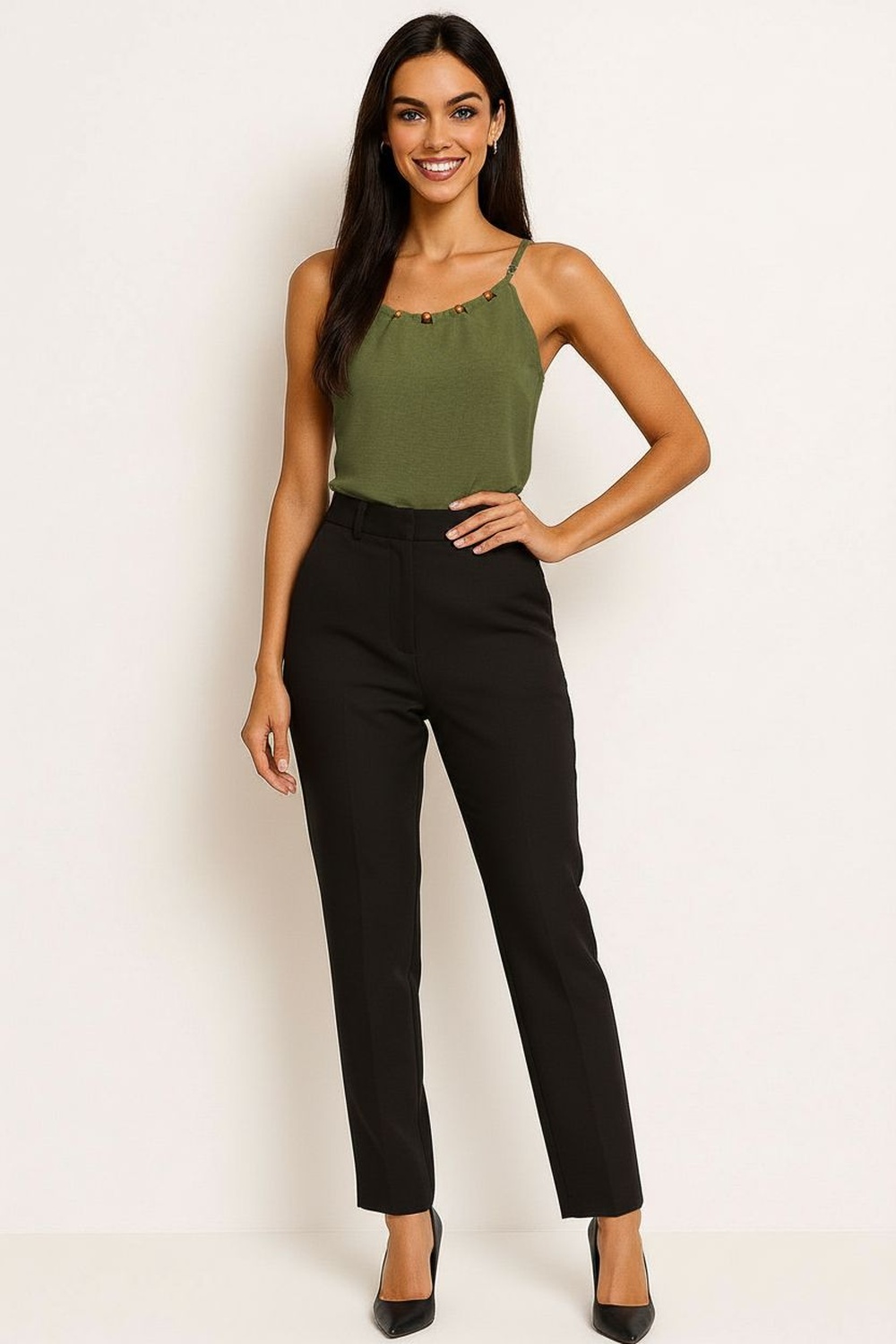 Blusa de tirantes delgados con escote recto, aplicación decorativa en parte frontal, caída ligera y cómoda, confección ideal para uso continuo