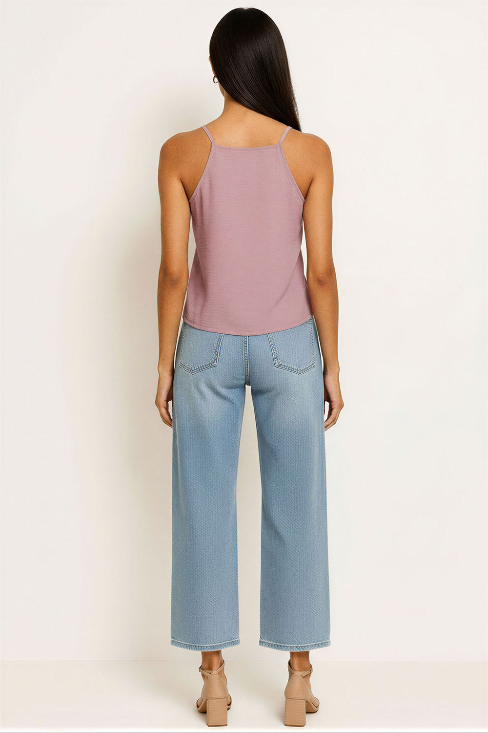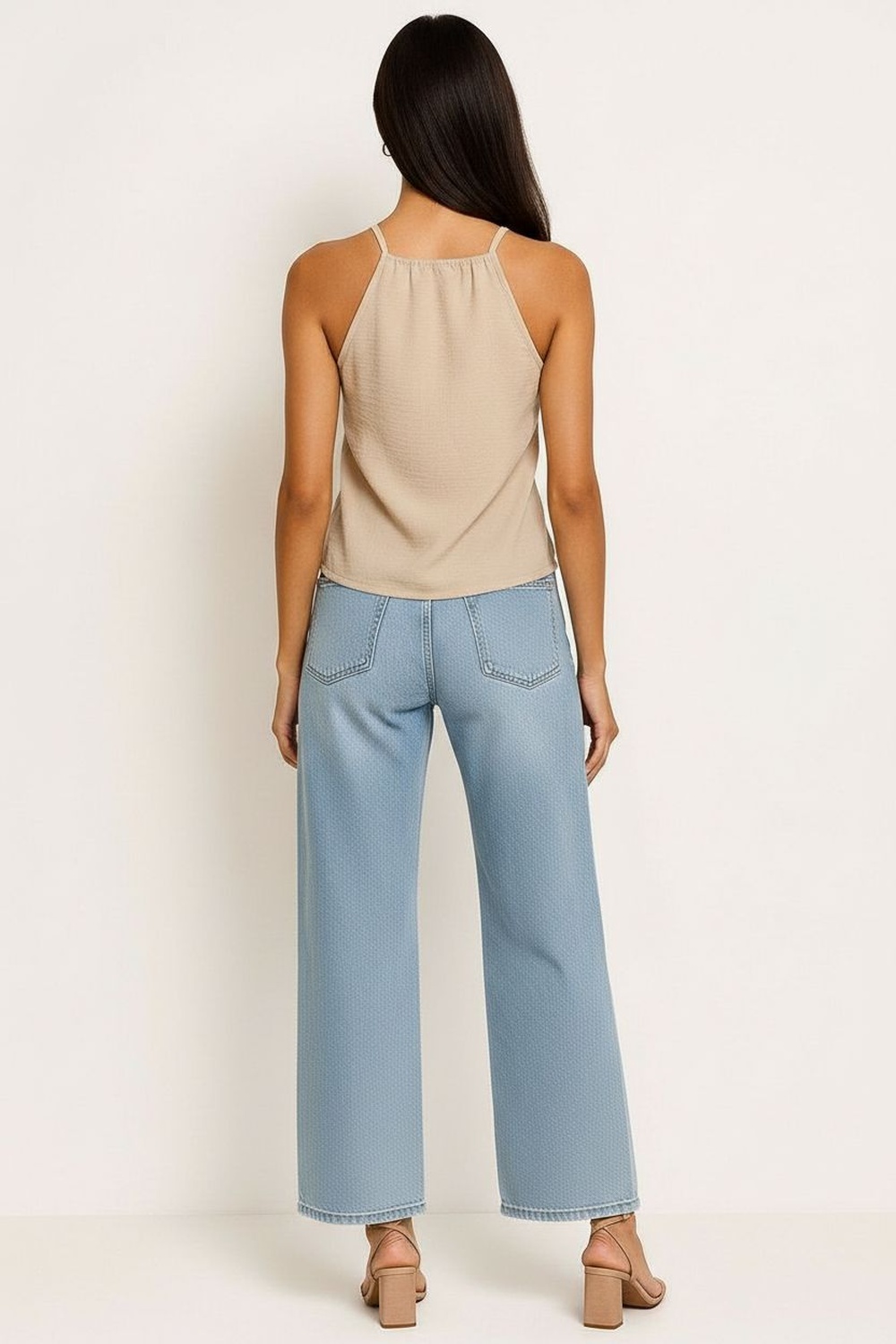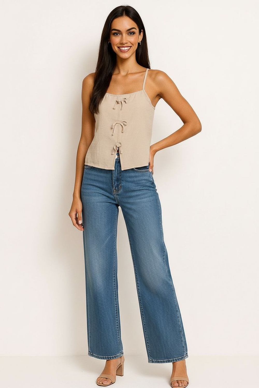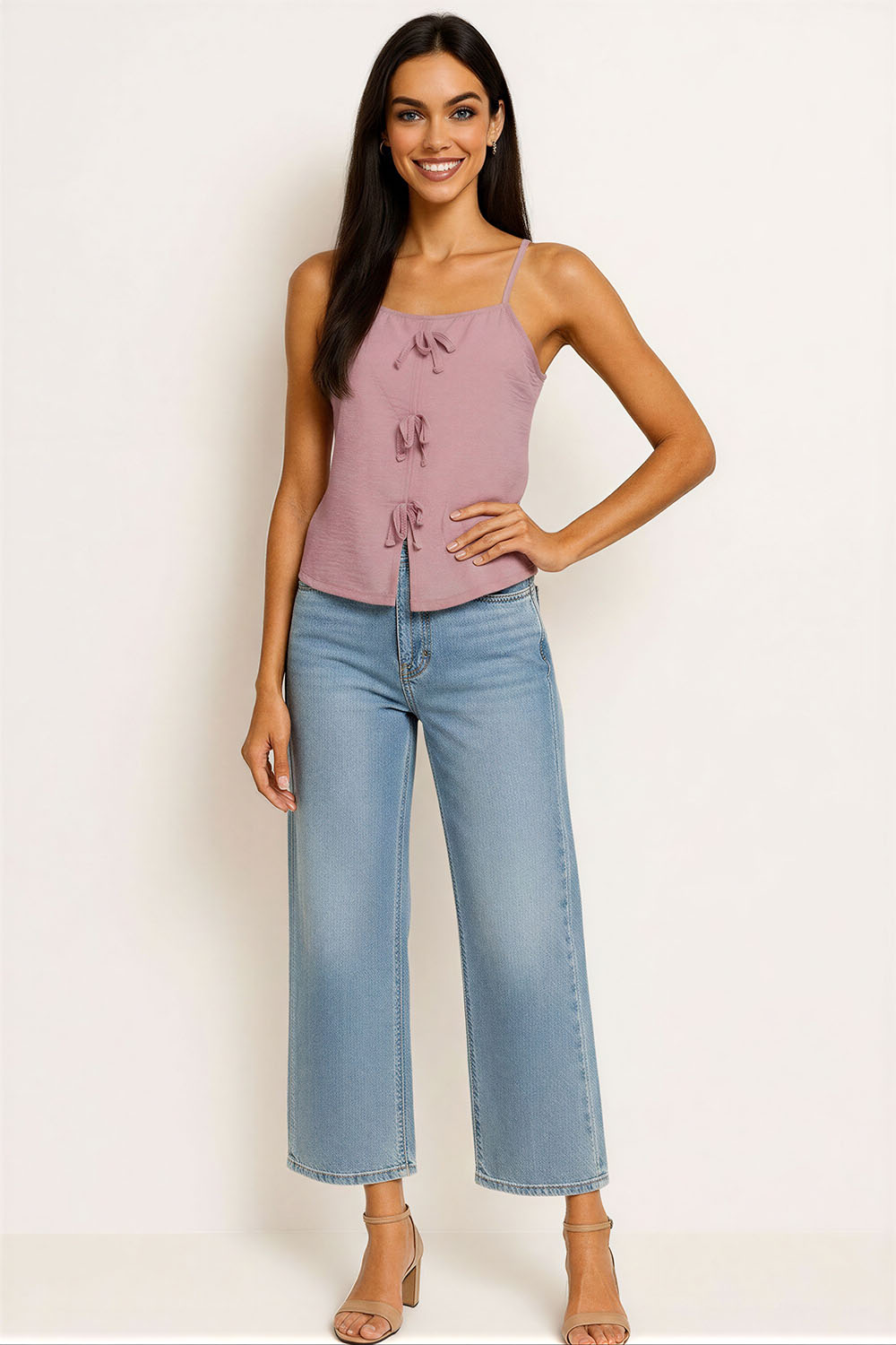 Blusa de tirantes delgados con escote recto que resalta la parte superior, diseño con moños frontales ajustables que permiten regular la abertura, confección en tejido ligero con textura suave al tacto, corte recto que brinda comodidad y libertad de movimiento, acabado delicado que aporta un toque femenino y actual