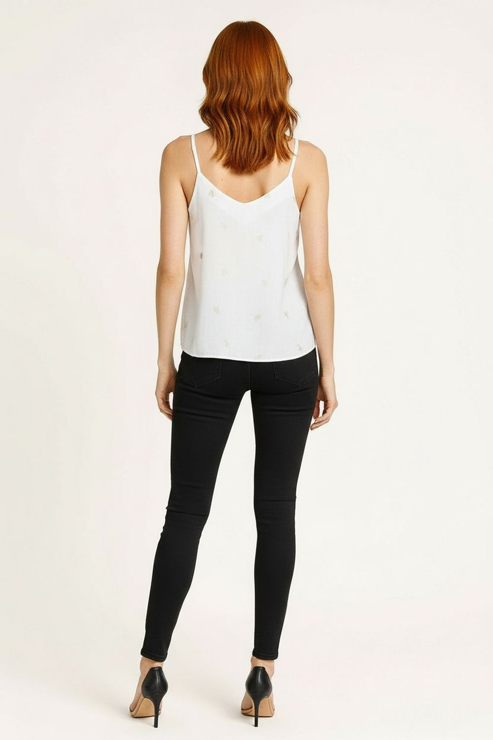 Top con tirantes delgados, escote en pico, corte recto, caída ligera, textura suave, largo a cadera