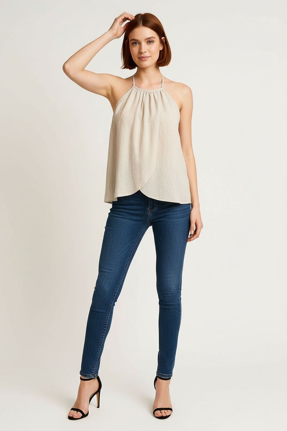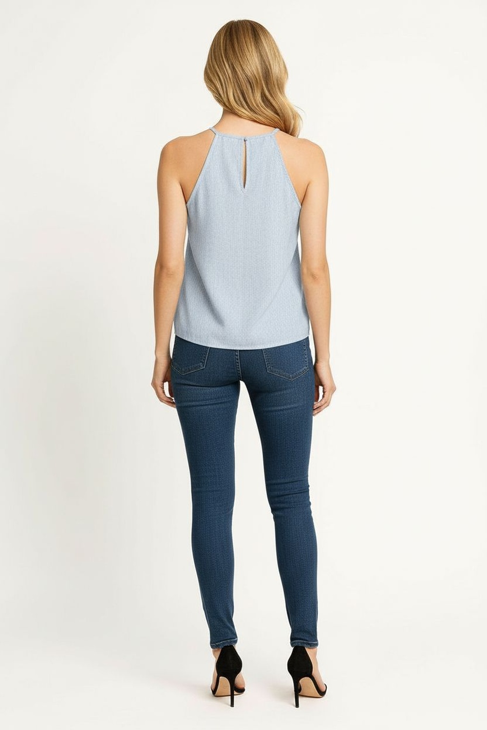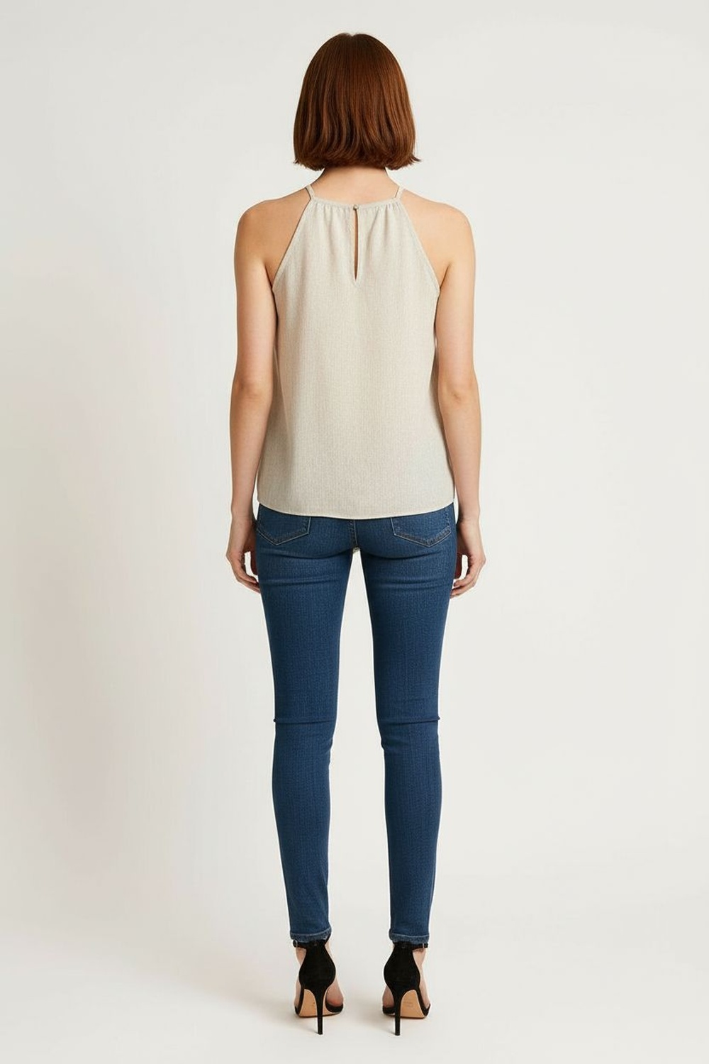Top con tirantes delgados, escote alto, corte amplio, caída fluida, estructura ligera, largo regular