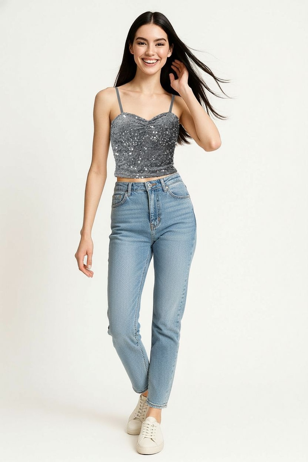 Top halter con escote fruncido que realza el busto y tirantes delgados para un soporte delicado, confección en tejido velour con aplicación de lentejuelas que aportan brillo y textura sofisticada, ajuste al cuerpo que define la silueta