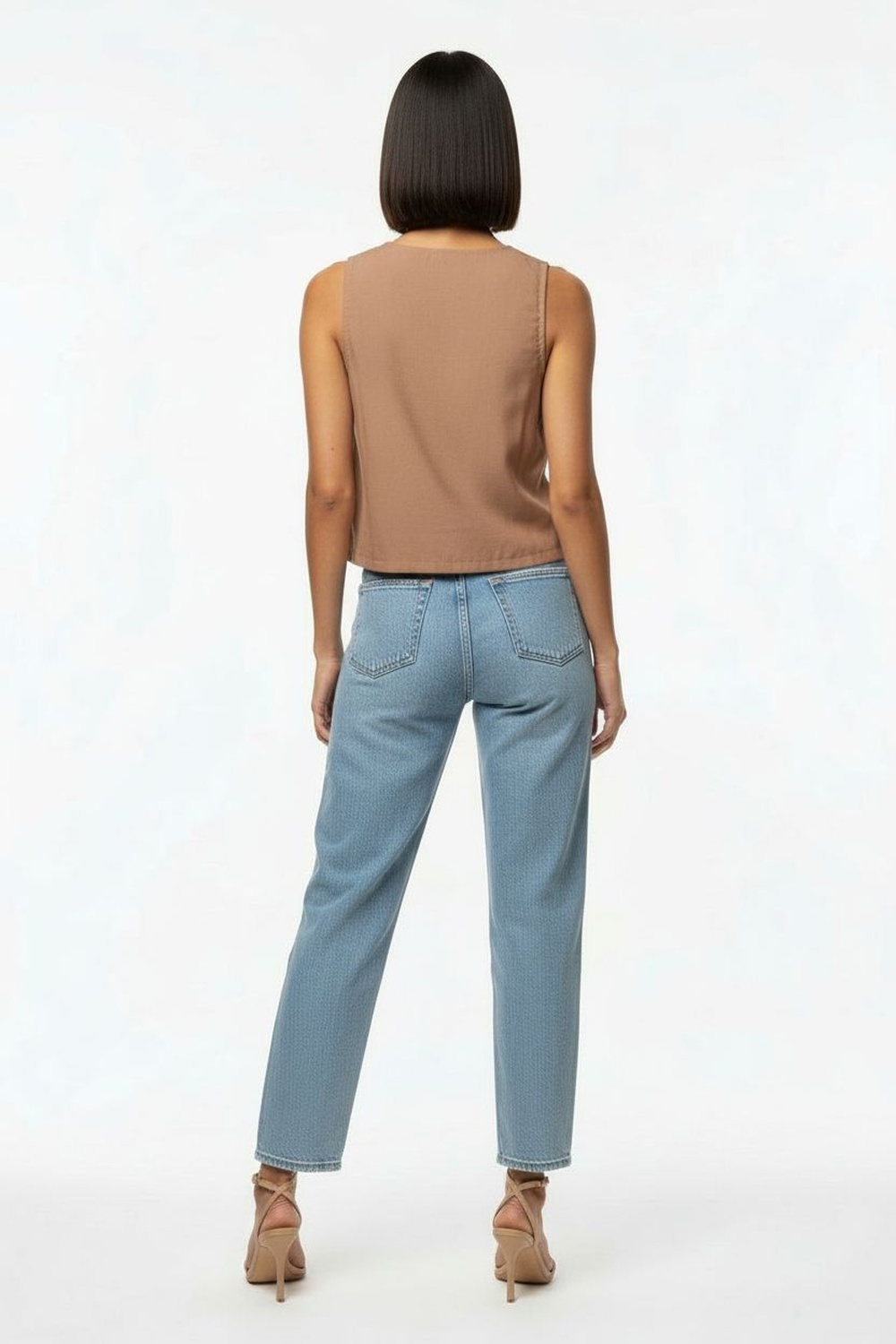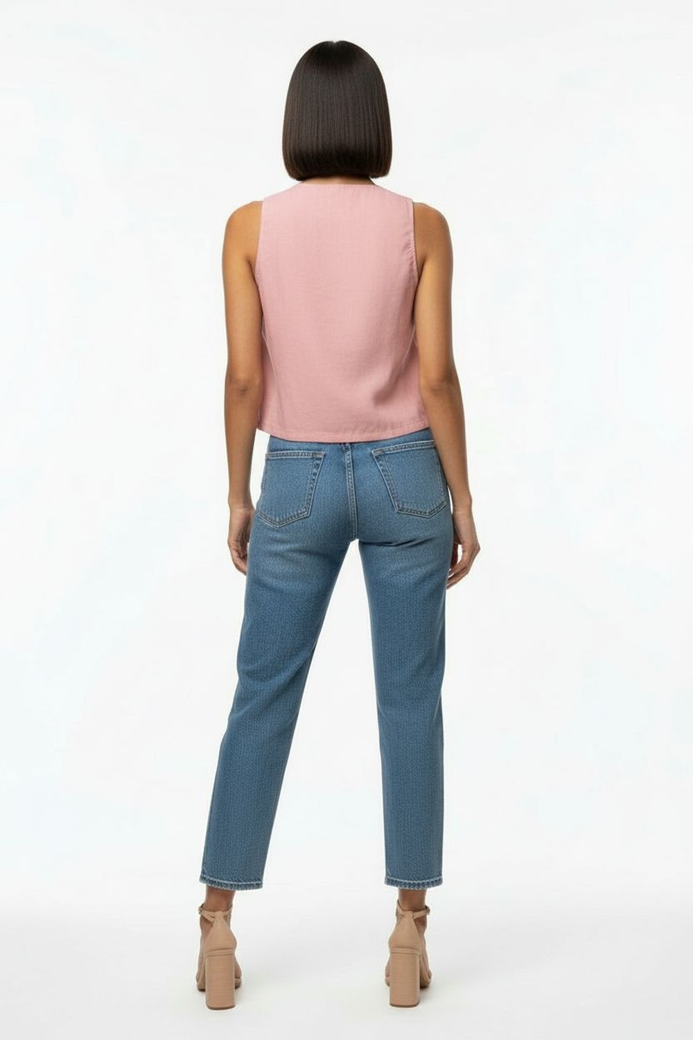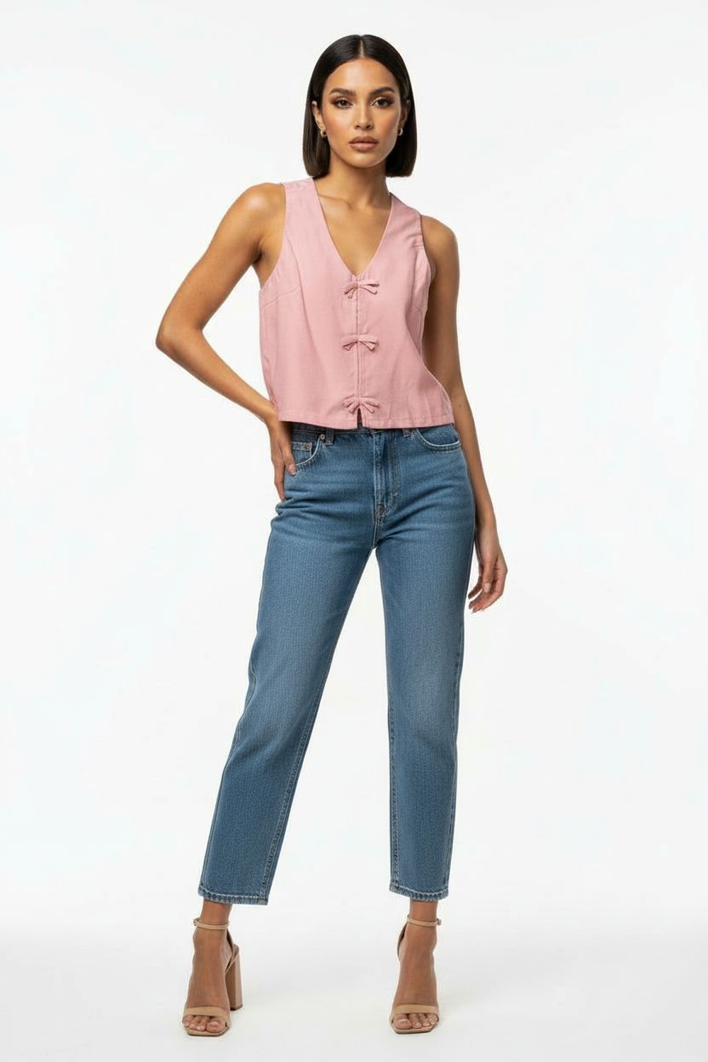 Top sin mangas, escote en v con aplicación frontal tipo lazo, estructura ligera con caída natural y ajuste cómodo