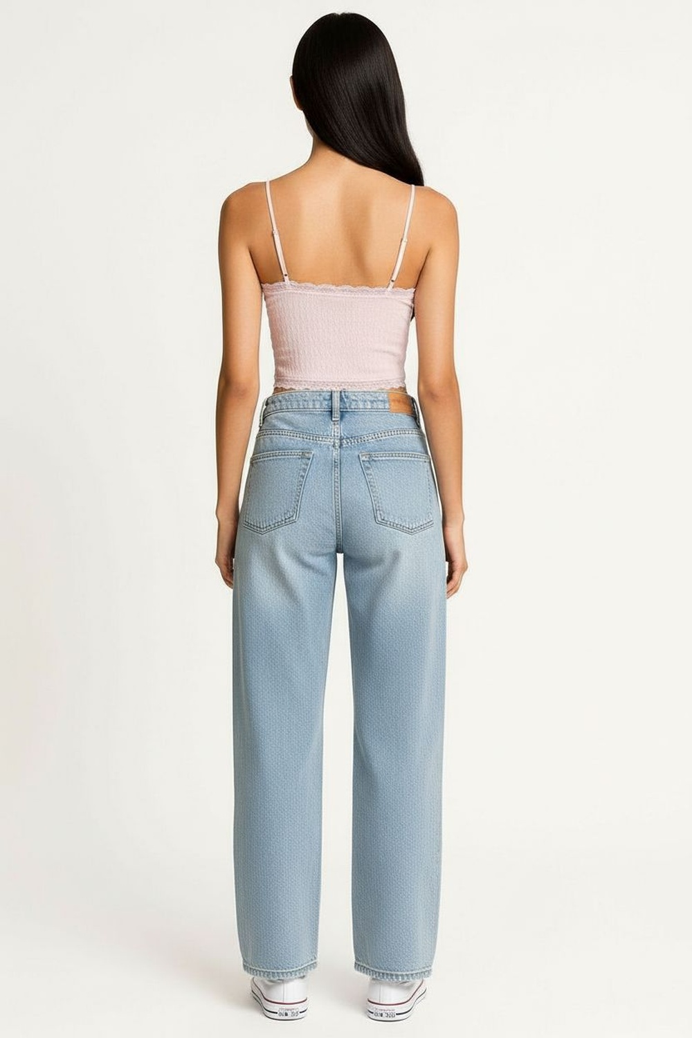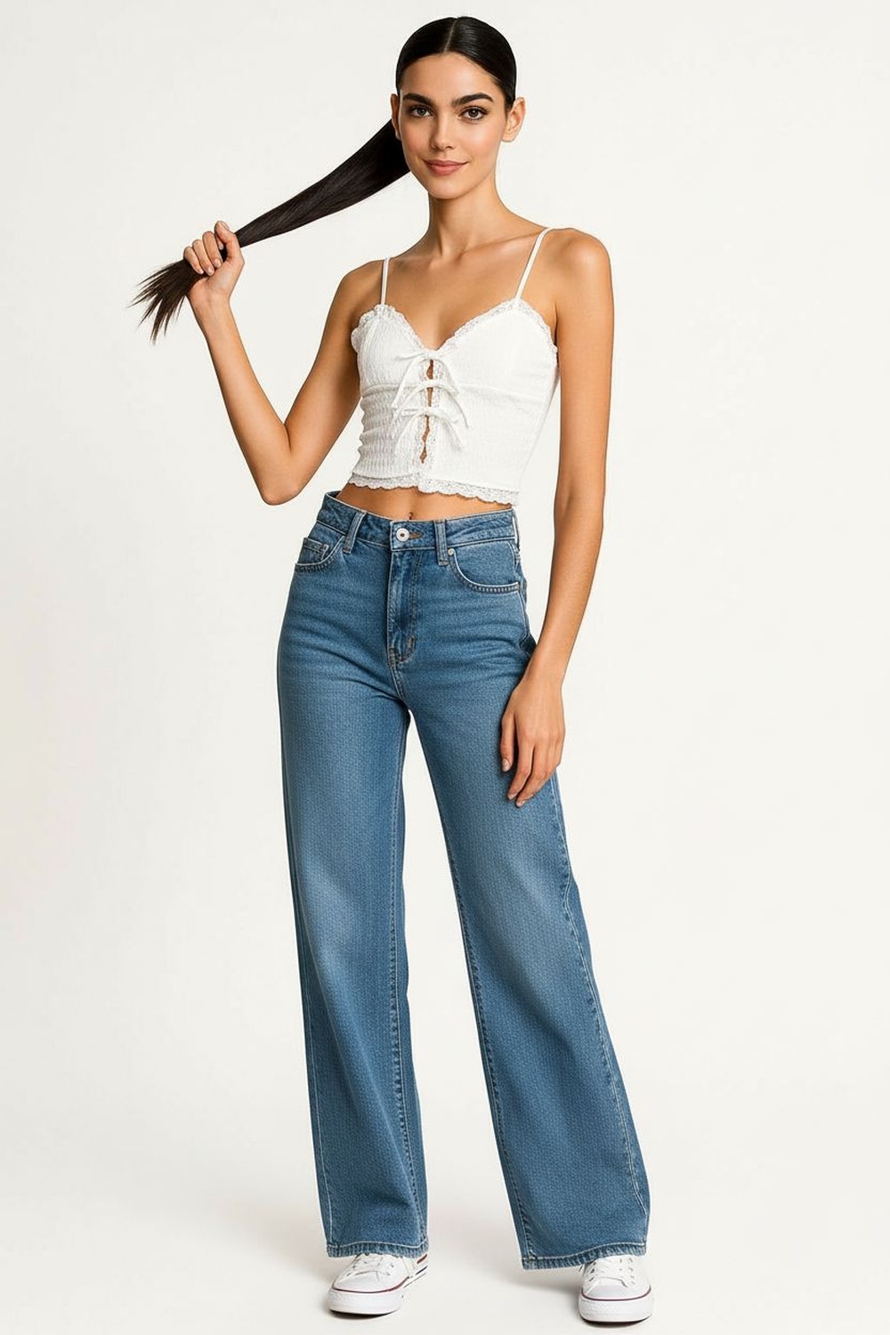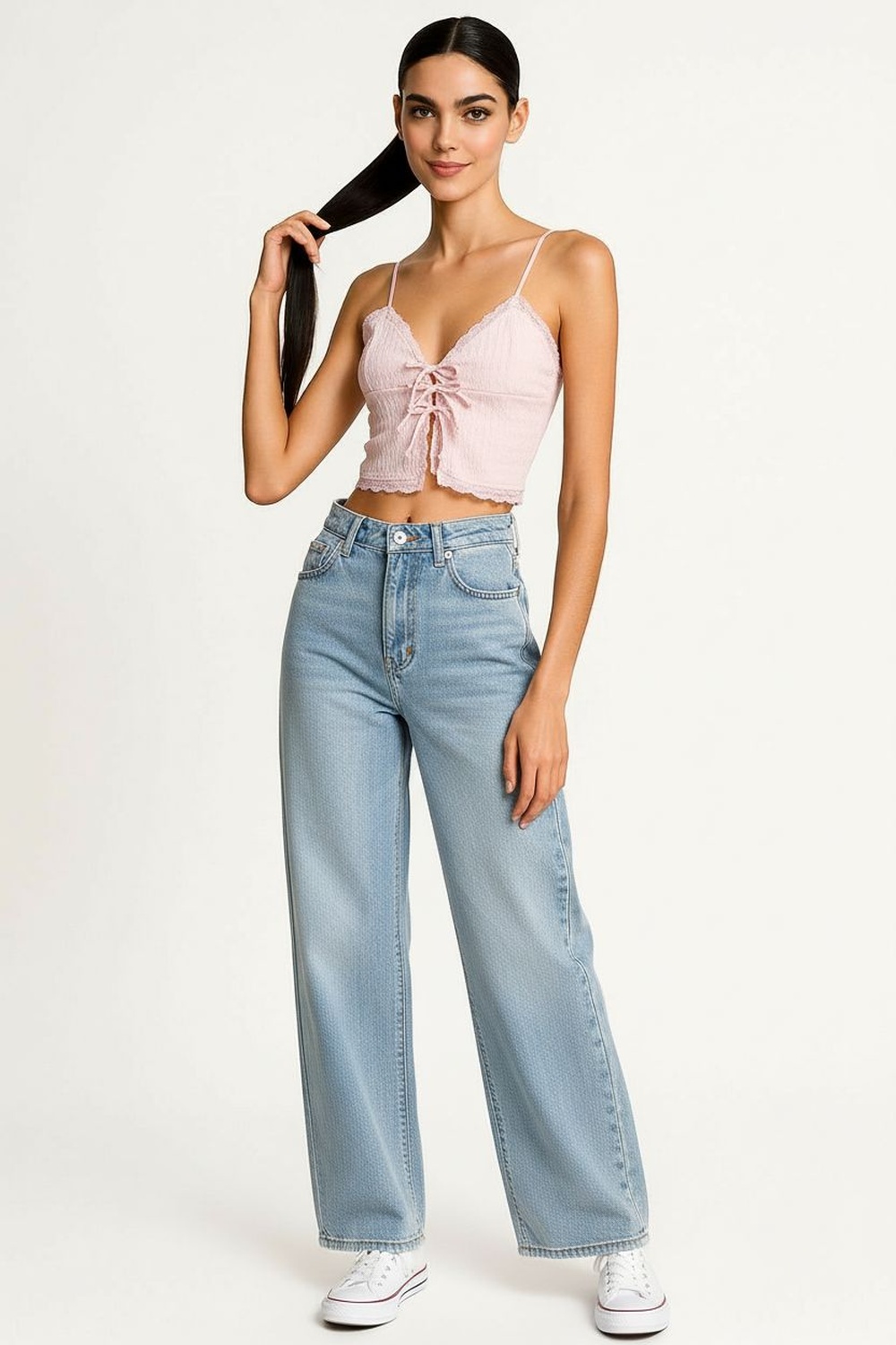 Top de tirantes con escote en v detalle de moño al frente textura ligera y terminado con encaje en bajo