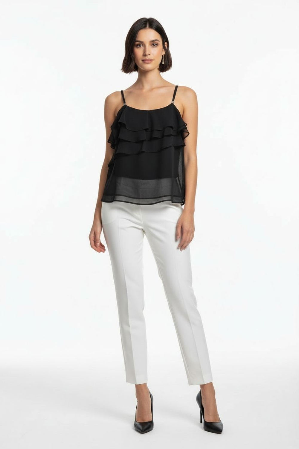 Top con tirantes delgados, escote recto, diseño de doble capa en parte frontal, estructura ligera, caída suave, acabado limpio