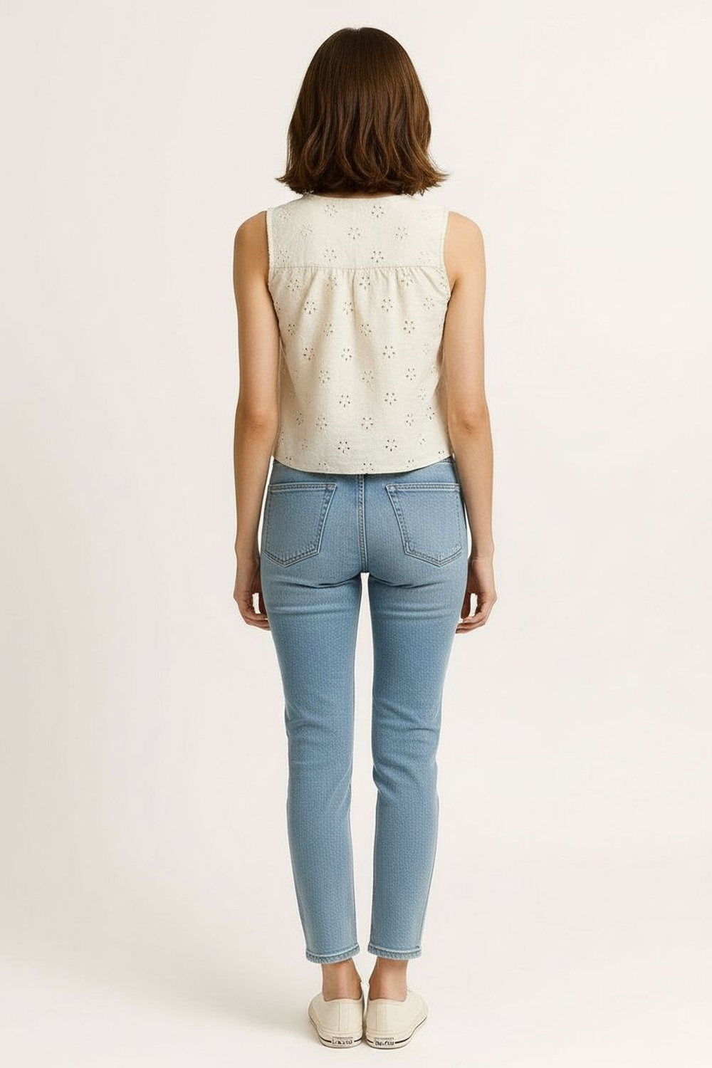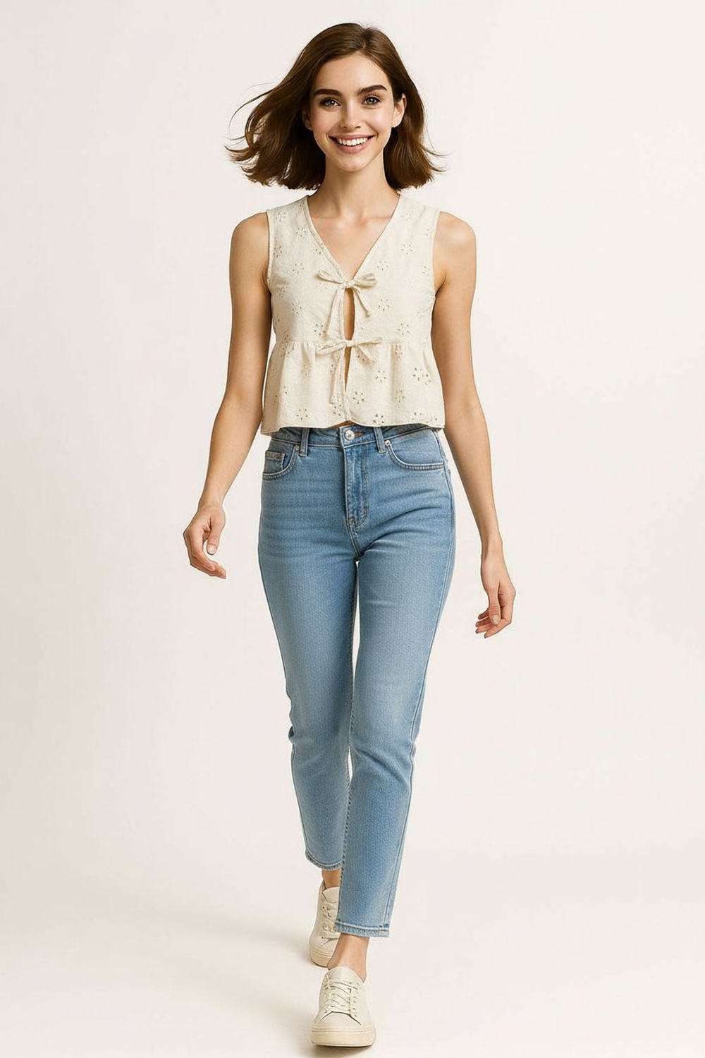 Blusa de tirantes delgados con escote recto y estructura ligera, detalle de moños frontales funcionales que permiten ajustar el escote, corte a la cintura con ligero vuelo en el bajo que aporta movimiento, terminación con encaje decorativo en orilla que añade acabado delicado, confección fresca y cómoda para uso continuo