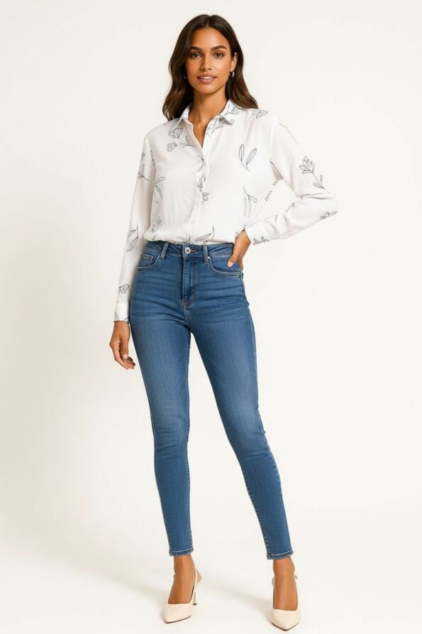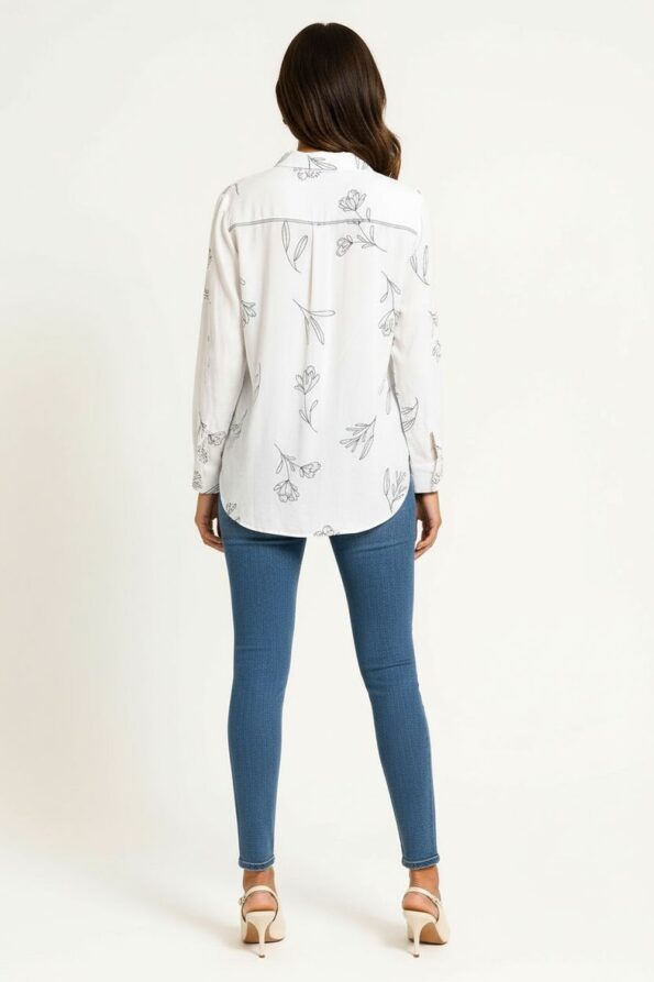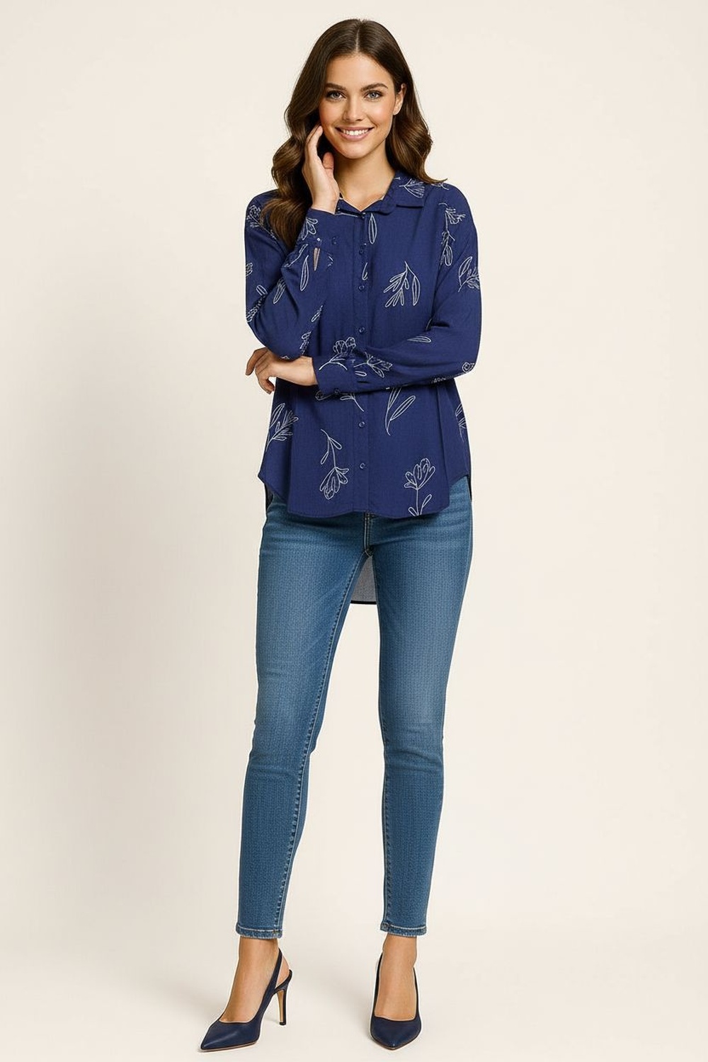 Blusa full print floral, cuello camisero con botones frontales y manga 3/4 tipo globo
