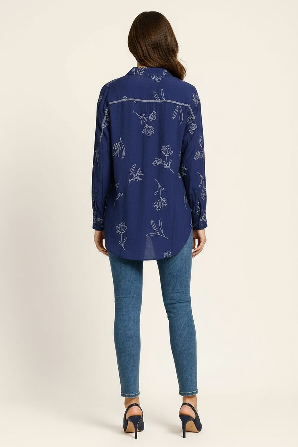 Blusón de manga larga confeccionado en tela ligera que brinda frescura y comodidad, cuello camisero clásico con botonadura frontal que aporta un acabado versátil, costuras en contraste que añaden un detalle distintivo al diseño, corte amplio que favorece la movilidad y se adapta a distintas siluetas, dobladillo redondeado que aporta un toque moderno y funcionalidad adicional